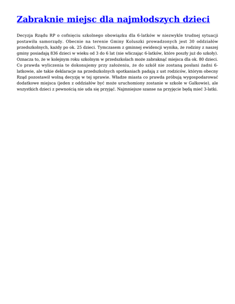 Zabraknie miejsc dla najmłodszych dzieci Decyzja Rządu RP o cofnięciu szkolnego obowiązku dla 6-latków w niezwykle trudnej sytuacji postawiła samorządy. Obecnie na terenie Gminy Koluszki prowadzonych jest 30 oddziałów przedszkolnych, każdy po ok. 25 dzieci. Tymczasem z gminnej ewidencji wynika, że rodziny z naszej gminy posiadają 836 dzieci w wieku od 3 do 6 lat (nie wliczając 6-latków, które poszły już do szkoły). Oznacza to, że w kolejnym roku szkolnym w przedszkolach może zabraknąć miejsca dla ok. 80 dzieci. Co prawda wyliczenia te dokonujemy przy założeniu, że do szkół nie zostaną posłani żadni 6latkowie, ale takie deklaracje na przedszkolnych spotkaniach padają z ust rodziców, którym obecny Rząd pozostawił wolną decyzję w tej sprawie. Władze miasta co prawda próbują wygospodarować dodatkowe miejsca (jeden z oddziałów być może uruchomiony zostanie w szkole w Gałkowie), ale wszystkich dzieci z pewnością nie uda się przyjąć. Najmniejsze szanse na przyjęcie będą mieć 3-latki.