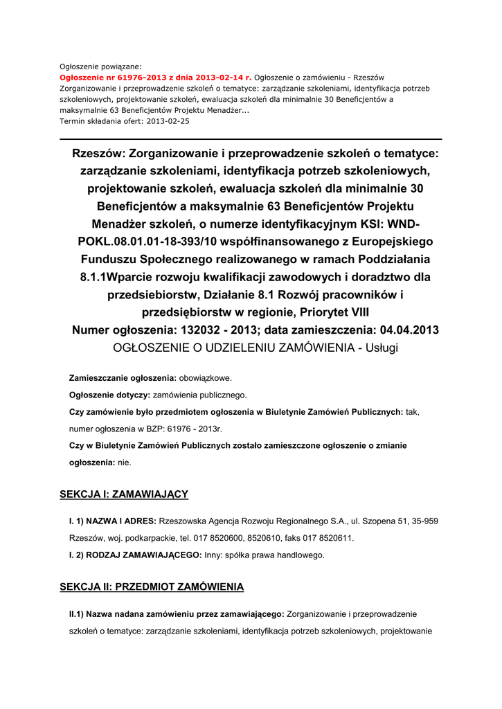 Ogłoszenie powiązane: Ogłoszenie nr 61976-2013 z dnia 2013-02-14 r. Ogłoszenie o zamówieniu - Rzeszów Zorganizowanie i przeprowadzenie szkoleń o tematyce: zarządzanie szkoleniami, identyfikacja potrzeb szkoleniowych, projektowanie szkoleń, ewaluacja szkoleń dla minimalnie 30 Beneficjentów a maksymalnie 63 Beneficjentów Projektu Menadżer... Termin składania ofert: 2013-02-25 Rzeszów: Zorganizowanie i przeprowadzenie szkoleń o tematyce: zarządzanie szkoleniami, identyfikacja potrzeb szkoleniowych, projektowanie szkoleń, ewaluacja szkoleń dla minimalnie 30 Beneficjentów a maksymalnie 63 Beneficjentów Projektu Menadżer szkoleń, o numerze identyfikacyjnym KSI: WNDPOKL.08.01.01-18-393/10 współfinansowanego z Europejskiego Funduszu Społecznego realizowanego w ramach Poddziałania 8.1.1Wparcie rozwoju kwalifikacji zawodowych i doradztwo dla przedsiebiorstw, Działanie 8.1 Rozwój pracowników i przedsiębiorstw w regionie, Priorytet VIII Numer ogłoszenia: 132032 - 2013; data zamieszczenia: 04.04.2013 OGŁOSZENIE O UDZIELENIU ZAMÓWIENIA - Usługi Zamieszczanie ogłoszenia: obowiązkowe. Ogłoszenie dotyczy: zamówienia publicznego. Czy zamówienie było przedmiotem ogłoszenia w Biuletynie Zamówień Publicznych: tak, numer ogłoszenia w BZP: 61976 - 2013r. Czy w Biuletynie Zamówień Publicznych zostało zamieszczone ogłoszenie o zmianie ogłoszenia: nie. SEKCJA I: ZAMAWIAJĄCY I. 1) NAZWA I ADRES: Rzeszowska Agencja Rozwoju Regionalnego S.A., ul. Szopena 51, 35-959 Rzeszów, woj. podkarpackie, tel. 017 8520600, 8520610, faks 017 8520611. I. 2) RODZAJ ZAMAWIAJĄCEGO: Inny: spółka prawa handlowego. SEKCJA II: PRZEDMIOT ZAMÓWIENIA II.1) Nazwa nadana zamówieniu przez zamawiającego: Zorganizowanie i przeprowadzenie szkoleń o tematyce: zarządzanie szkoleniami, identyfikacja potrzeb szkoleniowych, projektowanie szkoleń, ewaluacja szkoleń dla minimalnie 30 Beneficjentów a maksymalnie 63 Beneficjentów Projektu Menadżer szkoleń, o numerze identyfikacyjnym KSI: WND-POKL.08.01.01-18-393/10 współfinansowanego z Europejskiego Funduszu Społecznego realizowanego w ramach Poddziałania 8.1.1Wparcie rozwoju kwalifikacji zawodowych i doradztwo dla przedsiebiorstw, Działanie 8.1 Rozwój pracowników i przedsiębiorstw w regionie, Priorytet VIII. II.2) Rodzaj zamówienia: Usługi. II.3) Określenie przedmiotu zamówienia: Zorganizowanie i przeprowadzenie szkoleń o tematyce: zarządzanie szkoleniami, identyfikacja potrzeb szkoleniowych, projektowanie szkoleń, ewaluacja szkoleń dla minimalnie 30 Beneficjentów a maksymalnie 63 Beneficjentów Projektu Menadżer szkoleń, o numerze identyfikacyjnym KSI: WND-POKL.08.01.01-18-393/10 współfinansowanego z Europejskiego Funduszu Społecznego realizowanego w ramach Poddziałania 8.1.1Wparcie rozwoju kwalifikacji zawodowych i doradztwo dla przedsiebiorstw, Działanie 8.1 Rozwój pracowników i przedsiębiorstw w regionie, Priorytet VIII Regionalne kadry gospodarki na podstawie Umowy o dofinansowanie projektu z dnia 10.01.2012r. Źródło finansowania: Projekt Menadżer szkoleń - jest współfinansowany z Europejskiego Funduszu Społecznego realizowany w ramach Poddziałania 8.1.1Wparcie rozwoju kwalifikacji zawodowych i doradztwo dla przedsiebiorstw, Działanie 8.1 Rozwój pracowników i przedsiębiorstw w regionie, Priorytet VIII Regionalne kadry gospodarki na podstawie Umowy o dofinansowanie projektu nr UDA-POKL.08.01.01-18-393/10-00 z dnia 10.01.2012r. Projekt finansowany jest: - w 10 % ze środków prywatnych - w 90% ze środków publicznych z podziałem na: 15% - budżet Państwa 85% - środki Unii Europejskiej. Szczegółowy opis i zakres przedmiotu zamówienia określa: Załącznik nr 1 do siwz - szczegółowy opis przedmiotu zamówienia; Załącznik nr 2 do siwz - istotne postanowienia umowy. Zamawiający nie dopuszcza składania ofert wariantowych. Zamawiający nie przewiduje zawarcia umowy ramowej. Zamawiający nie dopuszcza składanie ofert częściowych. Projekt skierowany jest do minimum 30, a maksymalnie 63 osób dorosłych zamieszkujących woj. podkarpackie, pracujących w administracji pub. i podległych jej jednostkach organizacyjnych oraz instytucjach otoczenia biznesu. Rekrutacja Beneficjentów zaplanowana jest w terminie od 18 lutego do 18 marca. W przypadku nie zebrania się pełnej grupy uczestników RARR S. A. ma prawo do wydłużenia terminu rekrutacji i przesunięcia terminu rozpoczęcia szkoleń. RARR S. A. przekaże Wykonawcy informację o ostatecznej liczbie Beneficjentów biorących udział w szkoleniach do dnia 26.03.2013r. W przypadku nie rekrutowania maksymalnej liczby Beneficjentów tj. 63 osób do dnia 26.03.2013r. Zamawiający zastrzega sobie prawo prowadzenia dalszej rekrutacji, w związku z czym Wykonawca zobowiązany będzie w ramach przedmiotowego zamówienia do przeprowadzenia szkoleń dla osób rekrutowanych po dniu 26.03.2013 r. w liczbie nie większej niż 63 osoby. Opis szkoleń dla minimum 30 Beneficjentów Przedmiotem zamówienia jest zorganizowanie i przeprowadzenie 4 modułów szkoleń o tematyce: - I moduł zarządzanie szkoleniami (szkolenie 14 dniowe - 56 godzin szkolenia dla 30 Beneficjentów podzielonych na 2 grupy) 56 godzin x2 grupy=112 godziny szkolenia - II moduł identyfikacja potrzeb szkoleniowych ( szkolenie 12 dniowe - 48 godzin szkolenia dla 30 Beneficjentów podzielonych na 2 grupy) 48 godzin x2 grupy = 96 godziny szkolenia - III moduł projektowanie szkoleń (szkolenie 4 dniowe - 16 godzin szkolenia dla 30 Beneficjentów podzielonych na 2 grupy) 16 godzin x grupy = 32 godziny - IV moduł ewaluacja szkoleń (szkolenie 4 dniowe - 16 godzin szkolenia dla 30 Beneficjentów podzielonych na 2 grupy) 16 godzin x grupy = 32 godziny. Szkolenia będą zorganizowane dla minimum 30 osób podzielonych na 2 grupy. Każdy beneficjent weźmie udział w każdym module szkoleniowym. Każdy Beneficjent przejdzie łącznie 136 godzin szkolenia. Opis szkoleń dla maksymalnie 63 Bene