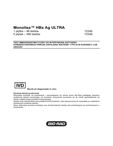 Monolisa™ HBs Ag ULTRA 1 płytka – 96 testów 5 płytek – 480 testów 72346 72348 TEST IMMUNOENZYMATYCZNY DO WYKRYWANIA ANTYGENU POWIERZCHNIOWEGO WIRUSA ZAPALENIA WĄTROBY TYPU B W SUROWICY LUB OSOCZU Wyrób do diagnostyki in vitro Kontrola jakości producenta Wszystkie produkty są wytwarzane i wprowadzane do obrotu przez Bio-Rad podlegają naszemu systemowi jakości poczynając od momentu otrzymania surowców aż do chwili wprowadzenia do obrotu ostatecznego produktu komercyjnego. Każda seria odczynników jest poddana kontroli jakości i jest dopuszczona do sprzedaży po spełnieniu określonych kryteriów jakości. Dane dotyczące procesu produkcji oraz kontroli jakości każdej serii produkcyjnej są archiwizowane u producenta. SPIS TREŚCI 1 - ZASTOSOWANIE TESTU 2 - ZNACZENIE KLINICZNE 3 - ZASADA TESTU Monolisa™ HBs Ag ULTRA 4 - SKŁAD ZESTAWU Monolisa™ HBs Ag ULTRA 5 - ŚRODKI OSTROŻNOŚCI 6 - HIGIENA I BEZPIECZEŃSTWO PRACY 7 - INNE NIEZBĘDNE MATERIAŁY 8 - PRZYGOTOWANIE ODCZYNNIKÓW 9 - PRZECHOWYWANIE I TRWAŁOŚĆ ODCZYNNIKÓW 10 - POBIERANIE I PRZECHOWYWANIE PRÓBEK 11 - PROCEDURA 12 - DOSTOSOWANIE APARATURY 13 - OBLICZENIA I INTERPRETACJA WYNIKÓW 14 - SPEKTROFOTOMETRYCZNA WERYFIKACJA PIPETOWANIA PRÓBEK I KONIUGATU. 15 - CHARAKTERYSTYKA TESTU 16 - OGRANICZENIA TESTU 17 - LITERATURA 2 1- ZASTOSOWANIE TESTU Monolisa™ HBs Ag ULTRA jest jednostopniowym testem immunoenzymatycznym typu „kanapkowego” do wykrywania antygenu powierzchniowego wirusa zapalenia wątroby typu B (HBs Ag) w ludzkiej surowicy lub osoczu. 2 - ZNACZENIE KLINICZNE Wykrycie antygenu powierzchniowego HBs w surowicy świadczy o zakażeniu wirusem zapalenia wątroby typu B. Antygen ten jest pierwszym pojawiającym się markerem zakażenia, wykrywanym w surowicy na 2-3 tygodnie przed wystąpieniem objawów klinicznych i biologicznych. Antygen powierzchniowy wirusa może występować w surowicy przez bardzo krótki czas (kilka dni) lub też bardzo długo (kilka lat). Utrzymywanie się w surowicy antygenu HBs ponad 6 miesięcy wskazuje na przewlekłe zapalenie wątroby. Liczna grupa bezobjawowych przewlekłych nosicieli wirusa zapalenia wątroby typu B jest istotnym zagrożeniem w transfuzjologii. Badanie w kierunku HBs Ag przy każdej donacji ma na celu zapobieżenie transmisji wirusa. 3 - ZASADA TESTU Monolisa™ HBs Ag ULTRA Monolisa™ HBs Ag ULTRA jest jednostopniowym testem immunoenzymatycznym typu „kanapkowego” wykorzystującym monoklonalne i poliklonalne przeciwciała, wyselekcjonowane ze względu na zdolność wiązania się z różnymi podtypami HBs Ag, wyróżnianymi obecnie przez WHO oraz z większością wariantów szczepów HBV. Faza stała w teście Monolisa™ HBs Ag ULTRA została opłaszczona przeciwciałami monoklonalnymi. W koniugatach testu Monolisa™ HBs Ag ULTRA zastosowano mysie przeciwciała monoklonalne oraz kozie przeciwciała poliklonalne przeciwko HBs Ag. Przeciwciała te zostały związane z peroksydazą. Wykonanie testu składa się z następujących etapów: 1. Naniesienie do studzienek próbek i surowic kontrolnych. Nanoszenie może być kontrolowane wzrokowo: jest wyraźna różnica w zabarwieniu pomiędzy pustą studzienką a studzienką z naniesioną próbką. Nanoszenie również można kontrolować automatycznie przez odczyt OD płytki przy długości fali 490/620-700 nm (opcja). 2. Naniesienie koniugatu o czerwonej barwie. Nanoszenie może być kontrolowane wzrokowo: Po dodaniu roztworu koniugatu, barwa studzienki zmienia się na czerwoną. Nanoszenie można również kontrolować automatycznie przez odczyt spektrofotometryczny przy długości fali 490/620-700 nm (opcja). Na tym etapie można również potwierdzić naniesienie próbki poprzez odczyt automatyczny przy 490/620-700 nm. 3. Po inkubacji w temp. 37°C przez 90 minut następuje odpłukanie nie związanego koniugatu 4. Dodanie barwnego roztworu substratu. Nanoszenie może być kontrolowane wzrokowo widać wyraźną różnicę barwy pomiędzy pustą studzienką i studzienką z różowym roztworem substratu. Nanoszenie można kontrolować również automatycznie przez pomiar gęstości optycznej przy 490 nm (opcja). 5. Po 30 minutach inkubacji z substratem w ciemności, w temperaturze pokojowej (18-30°C), o związaniu koniugatu świadczy zmiana barwy studzienki. 6. Naniesienie roztworu zatrzymującego reakcję. Nanoszenie może być kontrolowane wzrokowo: w studzienkach z próbkami ujemnymi różowy roztwór substratu staje się bezbarwny, natomiast barwa studzienek z próbkami dodatnimi zmienia się z niebieskiej na żółtą. 7. Odczyt gęstości optycznej przy długości fali 450/620-700 nm i interpretacja wyników. 3 4 - SKŁAD ZESTAWU Monolisa™ HBs Ag ULTRA Wszystkie odczynniki służą wyłącznie do diagnostyki in vitro. OZNACZENIE R1 R2 CHARAKTERYSTYKA ODCZYNNIKA MIKROPŁYTKA:12 pasków po 8 studzienek opłaszczonych monoklonalnymi przeciwciałami anty-HBs (mysie) BUFOR PŁUCZĄCY (20x) Bufor Tris NaCl, pH 7.4 Konserwant: Proclin 300 (0.04%) OPAKOWANIE 72346 72348 1 płytka 5 płytek 1 fiolka 70 ml 1 fiolka 235 ml 2 fiolki 2 x 2.5 ml 2 fiolki 2 x 2.5 ml R3 KONTROLA UJEMNA: Bufor Tris HCl zawierający BSA Konserwant: ProClin™ 300 (0.1%) R4 KONTROLA DODATNIA (LUDZKA): Bufor Tris HCl zawierający BSA z dodaną mieszaniną oczyszczonych HBs Ag, podtypów ad i ay Konserwant: ProClin™ 300 (0.1%) 1 fiolka 2.5 ml 1 fiolka 2.5 ml R6 ROZCIEŃCZALNIK KONIUGATU: ® Bufor Tris HCl, pH 7.4 +zawierający BSA, Tween 20, immunoglobuliny bydlęce i immunoglobuliny mysie oraz barwny wskaźnik naniesienia próbek. Konserwanty: ProClin™ 300 (0.1%) i ciprofloksacyna (10 µg/ml) 1 fiolka 8 ml 2 fiolki 2 x 18 ml R7 KONIUGAT: Mysie przeciwciała monoklonalne anty-HBs i kozie przeciwciała i poliklonalne anty-HBs znakowane peroksydazą. Liofilizowany. 1 fiolka sqf 8 ml 2 fiolki sqf 2 x 18 ml R8 BUFOR DO SUBSTRATU PEROKSYDAZY: Kwas cytrynowy i octan sodu, pH 4.0, zawierający 0.015% H2O2 i 4% (DMSO) 1 fiolka 