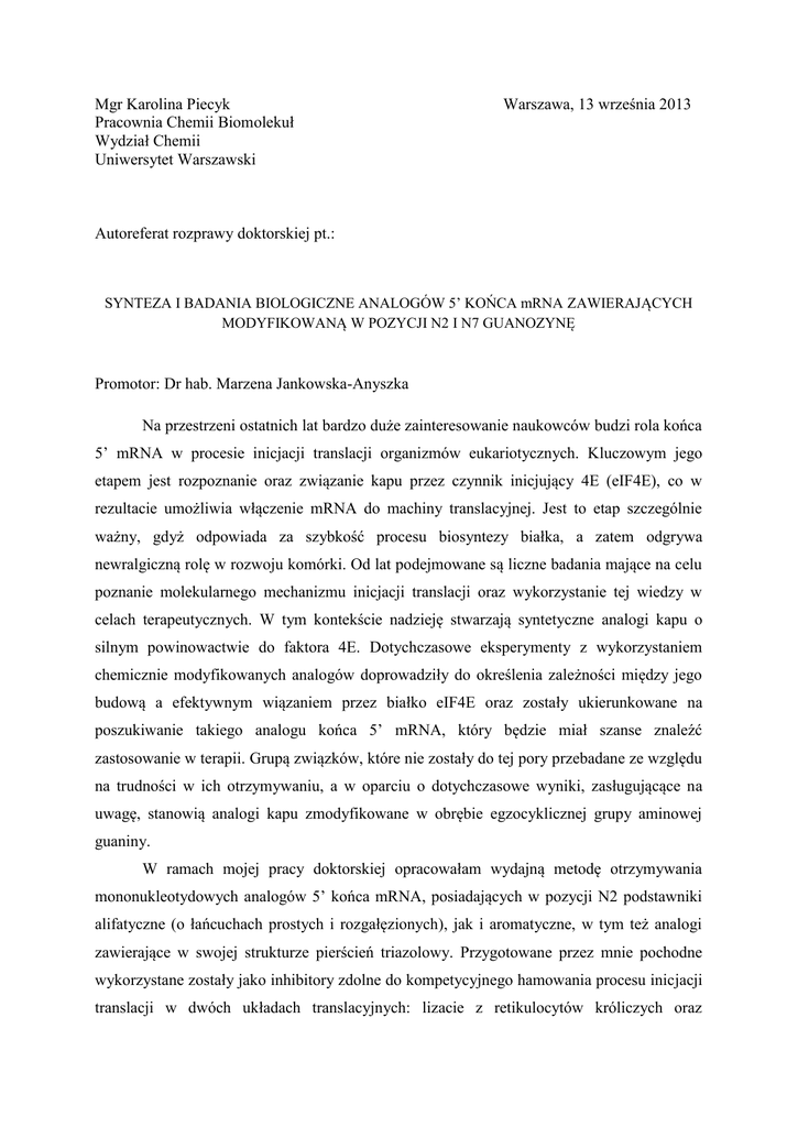 Mgr Karolina Piecyk Pracownia Chemii Biomolekuł Wydział Chemii Uniwersytet Warszawski Warszawa, 13 września 2013 Autoreferat rozprawy doktorskiej pt.: SYNTEZA I BADANIA BIOLOGICZNE ANALOGÓW 5’ KOŃCA mRNA ZAWIERAJĄCYCH MODYFIKOWANĄ W POZYCJI N2 I N7 GUANOZYNĘ Promotor: Dr hab. Marzena Jankowska-Anyszka Na przestrzeni ostatnich lat bardzo duże zainteresowanie naukowców budzi rola końca 5’ mRNA w procesie inicjacji translacji organizmów eukariotycznych. Kluczowym jego etapem jest rozpoznanie oraz związanie kapu przez czynnik inicjujący 4E (eIF4E), co w rezultacie umożliwia włączenie mRNA do machiny translacyjnej. Jest to etap szczególnie ważny, gdyż odpowiada za szybkość procesu biosyntezy białka, a zatem odgrywa newralgiczną rolę w rozwoju komórki. Od lat podejmowane są liczne badania mające na celu poznanie molekularnego mechanizmu inicjacji translacji oraz wykorzystanie tej wiedzy w celach terapeutycznych. W tym kontekście nadzieję stwarzają syntetyczne analogi kapu o silnym powinowactwie do faktora 4E. Dotychczasowe eksperymenty z wykorzystaniem chemicznie modyfikowanych analogów doprowadziły do określenia zależności między jego budową a efektywnym wiązaniem przez białko eIF4E oraz zostały ukierunkowane na poszukiwanie takiego analogu końca 5’ mRNA, który będzie miał szanse znaleźć zastosowanie w terapii. Grupą związków, które nie zostały do tej pory przebadane ze względu na trudności w ich otrzymywaniu, a w oparciu o dotychczasowe wyniki, zasługującące na uwagę, stanowią analogi kapu zmodyfikowane w obrębie egzocyklicznej grupy aminowej guaniny. W ramach mojej pracy doktorskiej opracowałam wydajną metodę otrzymywania mononukleotydowych analogów 5’ końca mRNA, posiadających w pozycji N2 podstawniki alifatyczne (o łańcuchach prostych i rozgałęzionych), jak i aromatyczne, w tym też analogi zawierające w swojej strukturze pierścień triazolowy. Przygotowane przez mnie pochodne wykorzystane zostały jako inhibitory zdolne do kompetycyjnego hamowania procesu inicjacji translacji w dwóch układach translacyjnych: lizacie z retikulocytów króliczych oraz ekstrakcie z pasożytniczych Ascaris suum, który jest jedynym dostępnym bezkomórkowym układem odtwarzającym translację w organizmach nicieni. Przeprowadzone badania biologiczne pozwoliły określić wpływ właściwości elektronowych grupy w pozycji N2 na wiązanie białka eIF4E. Wstępne wyniki pokazały, że para podstawienie podstawnika benzylowego grupą zwiększającą gęstość elektronową pierścienia aromatycznego powodując wzrost wydajności inhibicji translacji związku. Najwydajniejszym inhibitorem translacji w ekstrakcie z pasożytniczych nicieni okazał się związek posiadający w pozycji N2 guanozyny podstawnik p-metoksybenzylowy. Wykazywał on około siedmiokrotny wzrost inhibicji translacji w porównaniu do m7GTP. W przypadku badań w retikulocytach króliczych, przebadanych zostało pięć analogów, których częścią wspólna modyfikacji w pozycji N2 był pierścień triazolowy. W oparciu o uzyskane wyniki można stwierdzić, iż otrzymane analogi z modyfikacją w obrębie egzocyklicznej grupy aminowej są obiecującymi inhibitorami translacji, a obecność podstawnika w pozycji N2 rekompensuje brak dwóch grup fosforanowych w cząsteczce. Ponadto występowanie tylko jednej grupy fosforanowej w molekule zwiększa jej zdolność do przenikania przez błony komórkowe, co umożliwia potencjalne zastosowanie badanych związków in vivo. Poza analogami mononukleotydowymi w ramach pracy doktorskiej otrzymałam również dinukleotydową pochodną struktury kapu zawierającą modyfikację w obrębie zasady azotowej, umożliwiającą przyłączenie jej struktury do peptydu (MPS) penetrującego błonę komórkową. Synteza tego typu koniugatu została zaplanowana ze względu na fakt, że w większości przypadków analogi silnie hamujące translację in vitro posiadają ładunek elektrostatyczny, utrudniający im potencjalne zastosowanie in vivo, z racji na niezdolność do przenikania przez błonę do wnętrza komórki. W oparciu o dotychczasową wiedzę wydawało się możliwym zaprojektowanie takiego analogu, który nie tylko będzie wydajnym inhibitorem inicjacji translacji, ale także będzie posiadał dodatkowe modyfikacje umożliwiające jego transport przez błonę komórkową. Ze względu na fakt, że do wydajnego wiązania kapu przez białko eIF4E część jego struktury odpowiadającej za wiązanie z białkiem (pierwsza zasada oraz łańcuch fosforanowy) musi pozostać niezmieniona, do syntezy koniugatu wykorzystałam połączenie poprzez wiązanie kowalencyjne odpowiednio zmodyfikowanego analogu kapu z zsyntetyzowanym w fazie stałej peptydem zawierającym modyfikację w łańcuchu bocznym lizyny. W ramach pracy doktorskiej zaprojektowałam oraz otrzymałam koniugat kap-MPS, będący pierwszym do tej pory uzyskanym połączeniem struktury 5’ końca mRNA z peptydem penetrującym błonę komórkową. W tym celu zoptymalizowałam metodę syntezy w fazie stałej hydrofobowego oligopeptydu składającego się z szesnastu reszt aminokwasowych, posiadającego grupę azydkową w łańcuchu bocznym lizyny oraz opracowałam procedurę jego wydajnego sprzęgania ze zmodyfikowanym dinukleotydowym analogiem kapu z wykorzystaniem reakcji 1,3-dipolarnej cykloaddycji Huisgena. Ostatnimi zsyntetyzowanymi w ramach pracy doktorskiej związkami były dinukleotydowe pochodne struktury kapu zmodyfikowane w pozycji N2 oraz N7. Synteza tej klasy analogów została podjęta z myślą o wykorzystaniu ich w badaniach nad oddziaływaniem struktury kapu ze snurportyną – białkiem odpowiedzialnym za transport RNA zakończonych N2,N2,7-trimetyloguanozyno kapem do jądra, w celu wyselekcjonowania analogu wykazującego największą efektywność w transporcie dojądrowym. Spośród kilkunastu analogów, et2m22,7GpppG) trzy pochodne zastosowałam w dinukleo
