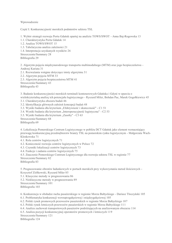 Wprowadzenie Część I. Konkurencyjność morskich podmiotów sektora TSL 1. Wybór strategii rozwoju Portu Gdańsk opartej na analizie TOWS/SWOT - Anna Baj-Rogowska 13 1.1. Charakterystyka Portu Gdańsk 14 1.2. Analiza TOWS/SWOT 15 1.3. Tabelaryczna analiza zależności 21 1.4. Interpretacja uzyskanych wyników 26 Streszczenie/Summary 28 Bibliografia 29 2. Algorytm pojęcia międzynarodowego transportu multimodalnego (MTM) oraz jego bezpieczeństwa Andrzej Kuriata 31 2.1. Rozważania wstępne dotyczące istoty algorytmu 31 2.2. Algorytm pojęcia MTM 33 2.3. Algorytm pojęcia bezpieczeństwa MTM 41 Streszczenie/Summary 43 Bibliografia 43 3. Badanie konkurencyjności morskich terminali kontenerowych Gdańska i Gdyni w oparciu o wielokryterialną analizę ich potencjału logistycznego - Ryszard Miler, Bohdan Pac, Marek Gogołkiewicz 45 3.1. Charakterystyka obszaru badań 46 3.2. Identyfikacja głównych założeń koncepcji badań 48 3.3. Wyniki badania dla kryterium „Efektywność i skuteczność" - C1 51 3.4. Wyniki badania dla kryterium „Interoperacyjność logistyczna" - C2 53 3.5. Wyniki badania dla kryterium „Zasoby" - C3 63 Streszczenie/Summary 68 Bibliografia 69 4. Lokalizacja Pomorskiego Centrum Logistycznego w pobliżu DCT Gdańsk jako element wzmacniający przewagę konkurencyjną przedsiębiorstw branży TSL na pomorskim rynku logistycznym - Małgorzata WachKloskowska 71 4.1. Rola centrów logistycznych 71 4.2. Konieczność rozwoju centrów logistycznych w Polsce 72 4.3. Czynniki lokalizacji centrów logistycznych 73 4.4. Funkcje i zadania centrów logistycznych 75 4.5. Znaczenie Pomorskiego Centrum Logistycznego dla rozwoju sektora TSL w regionie 77 Streszczenie/Summary 82 Bibliografia 83 5. Prognozowanie obrotów ładunkowych w portach morskich przy wykorzystaniu metod ilościowych Krzysztof Ziółkowski, Ryszard Miler 85 5.1. Klasyczne metody w prognozowaniu 86 5.2. Nieklasyczne metody w prognozowaniu 89 Streszczenie/Summary 101 Bibliografia 103 6. Konkurencja w obsłudze ruchu pasażerskiego w regionie Morza Bałtyckiego - Dariusz Tłoczyński 105 6.1. Problematyka konkurencji wewnątrzgałęziowej i międzygałęziowej 105 6.2. Polski rynek promowych przewozów pasażerskich w regionie Morza Bałtyckiego 107 6.3. Polski rynek lotniczych przewozów pasażerskich w regionie Morza Bałtyckiego 111 6.4. Analiza zachowań transportowych pasażerów podróżujących na analizowanym obszarze 114 6.5. Analiza pozycji konkurencyjnej operatorów promowych i lotniczych 119 Streszczenie/Summary 121 Bibliografia 124 7. Containerization as a Tool in Optimization of Global Maritime Transport - Pavel Volkov 125 7.1. Background 125 7.2. History 126 7.3. Formulae of MCL Efficiency 128 Streszczenie/Summary 130 Bibliography 131 8. Technologie informatyczne w podnoszeniu konkurencyjności podmiotów spedycji morskiej - Małgorzata Trawińska 133 8.1. Istota spedycji 134 8.2. Proces spedycyjny 135 8.3. Identyfikacja systemów IT wykorzystywanych w spedycji morskiej 136 8.4. Praktyczne wykorzystanie technologii informatycznych w spedycji morskiej - studium przypadku 140 8.5. Wpływ technologii informatycznych na efektywność i konkurencyjność podmiotów spedycji morskiej 142 Streszczenie/Summary 143 Bibliografia 144 Część II. Czynniki zrównoważonego rozwoju jako determinanty konkurencyjności podmiotów sektora TS L 9. Symptomy wzrostu znaczenia transportu lotniczego w Polsce w świetle założeń zrównoważonego rozwoju Agata Krysińska, Zygmunta Barańska 147 9.1. Ekonomiczny kontekst rozważanego problem 149 9.2. Intensywność transportu lotniczego w zakresie przewozu pasażerów 150 9.3. Intensywność transportu lotniczego w zakresie przewozu ładunków 158 Streszczenie/Summary 163 Bibliografia 164 10. The Monograph on Discussion on Sustainable Logistic Chain of Supply - Olga Matiash 165 10.1. Background 165 10.2. Discussion on ethics aspects 165 10.3. Discussion on logistics aspects 167 Streszczenie/Summary 169 Bibliography 170 11. Selected Logistics Concepts Supporting Reduce Of Anthropopression - Aleksandra Stempniewska 173 11.1. Carbon footprint and ecological footprint 173 11.2. Closed-Loop Supply Chain (CLSC) and Reverse logistics 175 11.3. Green logistics 177 Streszczenie/Summary 180 Bibliography 180 12. Identification of Methods Used in Logistic Chain of Supply in Order to Reduce Anthropopression - Antti Kotaniemi 183 12.1 Sustainable supply chain 184 12.2. Efficient waste management 185 12.3. Circular economy 187 12.4. Public pressure 187 Streszczenie/Summary 189 Bibliography 190