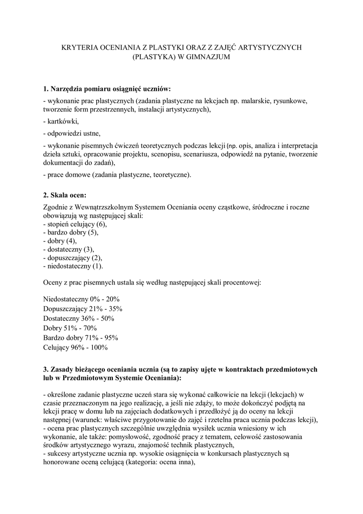 KRYTERIA OCENIANIA Z PLASTYKI ORAZ Z ZAJĘĆ ARTYSTYCZNYCH (PLASTYKA) W GIMNAZJUM 1. Narzędzia pomiaru osiągnięć uczniów: - wykonanie prac plastycznych (zadania plastyczne na lekcjach np. malarskie, rysunkowe, tworzenie form przestrzennych, instalacji artystycznych), - kartkówki, - odpowiedzi ustne, - wykonanie pisemnych ćwiczeń teoretycznych podczas lekcji (np. opis, analiza i interpretacja dzieła sztuki, opracowanie projektu, scenopisu, scenariusza, odpowiedź na pytanie, tworzenie dokumentacji do zadań), - prace domowe (zadania plastyczne, teoretyczne). 2. Skala ocen: Zgodnie z Wewnątrzszkolnym Systemem Oceniania oceny cząstkowe, śródroczne i roczne obowiązują wg następującej skali: - stopień celujący (6), - bardzo dobry (5), - dobry (4), - dostateczny (3), - dopuszczający (2), - niedostateczny (1). Oceny z prac pisemnych ustala się według następującej skali procentowej: Niedostateczny 0% - 20% Dopuszczający 21% - 35% Dostateczny 36% - 50% Dobry 51% - 70% Bardzo dobry 71% - 95% Celujący 96% - 100% 3. Zasady bieżącego oceniania ucznia (są to zapisy ujęte w kontraktach przedmiotowych lub w Przedmiotowym Systemie Oceniania): - określone zadanie plastyczne uczeń stara się wykonać całkowicie na lekcji (lekcjach) w czasie przeznaczonym na jego realizację, a jeśli nie zdąży, to może dokończyć podjętą na lekcji pracę w domu lub na zajęciach dodatkowych i przedłożyć ją do oceny na lekcji następnej (warunek: właściwe przygotowanie do zajęć i rzetelna praca ucznia podczas lekcji), - ocena prac plastycznych szczególnie uwzględnia wysiłek ucznia wniesiony w ich wykonanie, ale także: pomysłowość, zgodność pracy z tematem, celowość zastosowania środków artystycznego wyrazu, znajomość technik plastycznych, - sukcesy artystyczne ucznia np. wysokie osiągnięcia w konkursach plastycznych są honorowane oceną celującą (kategoria: ocena inna), - aktywność ucznia na lekcji (kilkukrotna wypowiedź tematyczna ucznia podczas lekcji) może zostać ujęta plusem (+). Trzy uzyskane w ten sposób plusy przybierają postać oceny z aktywności (5+), - wypowiedź ustna ucznia wskazanego przez nauczyciela do odpowiedzi dotyczy materiału podejmowanego na poprzedniej lekcji, - kartkówki obejmują materiał z ostatniej lekcji (kartkówka nie jest zapowiadana) lub z 2-3 lekcji (kartkówka wtedy jest zapowiadana i wpisywana do dziennika LIBRUS), - każdy uczeń w ciągu semestru może być dwa razy nieprzygotowany, musi to jednak zgłosić na początku lekcji. Każde następne nieprzygotowanie traktowane jest jako ocena niedostateczna, - jeśli z przyczyn losowych uczeń nie może pisać kartkówki z całą klasą ma obowiązek uczynić to w terminie dwóch tygodni poza godzinami lekcyjnymi w porozumieniu z nauczycielem przedmiotu. Jeśli uczeń tego nie uczyni otrzymuje odpowiednio z kartkówki ocenę niedostateczną, - w przypadku celowego unikania pisania kartkówki (wagary) lub w przypadku odmowy przez ucznia pisania kartkówki mimo jego obecności na zajęciach, uczeń otrzymuje ocenę niedostateczną. 4. Zasady ustalania oceny śródrocznej i rocznej: - przy wystawianiu oceny śródrocznej i rocznej obowiązuje następująca hierarchia ocen: 1. Wykonanie prac (zadań) plastycznych, 2. Kartkówki, 3. Ocena z odpowiedzi 4. Wykonanie zadań teoretycznych, 5. Aktywność na lekcji, 6. Zadania domowe, 7. Pozostałe oceny. - podstawą do wystawienia ocen śródrocznych i rocznych nie jest średnia arytmetyczna, - ocenę roczną wystawia się na podstawie ocen cząstkowych uzyskanych w drugim półroczu oraz w oparciu o ocenę śródroczną. 5. Wymagania edukacyjne na poszczególne oceny: Stopień celujący otrzymuje uczeń: - wykazuje postawę twórczą i dużą chęć działania na lekcjach, - jest zawsze przygotowany – posiada materiały edukacyjne: plastyczne wymagane i nadprogramowe, - swobodnie operuje pełną wiedzą programową i ponadprogramową z zakresu dziejów sztuki i problemów plastycznych – zna kierunki w sztuce, chronologię, wielu przedstawicieli i ich dzieła oraz potrafi charakteryzować style i nurty w sztuce na tle społeczno – historycznym, w kontekście innych dziedzin sztuki, - dokonuje swobodnie syntezy i analizy problemów i zdarzeń, analizy dzieła sztuki, - formułuje własne oryginalne poglądy i wnioski, - czynnie bierze udział w dyskusji, - - jest zainteresowany sztuką w sposób szczególny – uczestniczy w wielu konkursach plastycznych oraz w życiu kulturalnym klasy, szkoły, miasta, zna placówki muzealne i galerie w Polsce i w Europie, prace plastyczne i zadania lekcyjne wykonuje zgodnie z tematem, a ich rozwiązania są ciekawe i oryginalne, celowo stosuje wiedzę z zakresu dziejów sztuki i środków formalnych do własnej ekspresji plastycznej, zawsze odrabia prace domowe i podejmuje się dodatkowych zadań. Stopień bardzo dobry otrzymuje uczeń: - wykazuje postawę twórczą i dużą chęć do działania na lekcji, - jest zawsze przygotowany – posiada wymagane, czasem nadprogramowe, materiały edukacyjne i plastyczne, - posiada pełną wiedzę programową i dużą chęć do nauki i rozwoju osobistego; z zakresu dziejów sztuki i problematyki plastycznej swobodnie operuje nazwami epok i ich chronologią, potrafi wymienić wielu przedstawicieli kierunków w sztuce i ich dzieła, dokonuje analizy dzieła sztuki, - celowo i prawidłowo używa terminologii plastycznej w wypowiedzi ustnej i pisemnej, - bierze udział w dyskusjach wyrażając swoje poglądy i formułuje wnioski, - starannie wykonuje ćwiczenia plastyczne i zadania lekcyjne, poszukując oryginalnych rozwiązań problemów plastycznych i realizacji artystycznych, - efekt końcowy pracy jest zawsze zgodny z tematem, - bierze czynny udział w życiu kulturalnym klasy i szkoły, konkursach plastycznych i pozaszkolnych wydarzeniach kulturalnych. Stopień dobry otrzymuje uczeń: - wykazuje postawę twórczą na lekcji i chęć do działan
