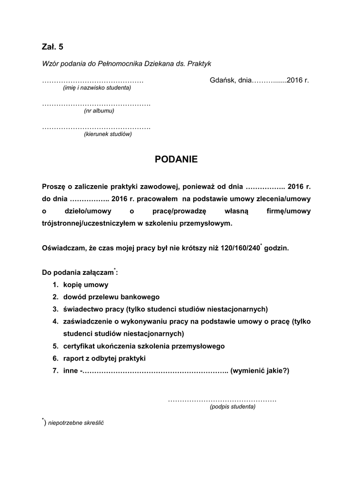 Zał. 5 Wzór podania do Pełnomocnika Dziekana ds. Praktyk ……………………………………. Gdańsk, dnia……….......2016 r. (imię i nazwisko studenta) ………………………………………. (nr albumu) ………………………………………. (kierunek studiów) PODANIE Proszę o zaliczenie praktyki zawodowej, ponieważ od dnia …………….. 2016 r. do dnia …………….. 2016 r. pracowałem na podstawie umowy zlecenia/umowy o dzieło/umowy o pracę/prowadzę własną firmę/umowy trójstronnej/uczestniczyłem w szkoleniu przemysłowym. Oświadczam, że czas mojej pracy był nie krótszy niż 120/160/240* godzin. Do podania załączam*: 1. kopię umowy 2. dowód przelewu bankowego 3. świadectwo pracy (tylko studenci studiów niestacjonarnych) 4. zaświadczenie o wykonywaniu pracy na podstawie umowy o pracę (tylko studenci studiów niestacjonarnych) 5. certyfikat ukończenia szkolenia przemysłowego 6. raport z odbytej praktyki 7. inne -…………………………………………………….. (wymienić jakie?) ………………………………………. (podpis studenta) * ) niepotrzebne skreślić