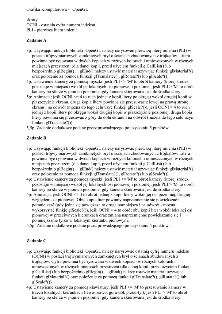 Grafika Komputerowa – OpenGL skróty: OCNI - ostatnia cyfra numeru indeksu, PLI - pierwsza litera imienia Zadanie A 3p: Używając funkcji biblioteki OpenGL należy narysować pierwszą literę imienia (PLI) w postaci trójwymiarowych zamkniętych brył o ścianach zbudowanych z trójkątów. Litera powinna być rysowana w dwóch kopiach w różnych kolorach i umieszczonych w różnych miejscach przestrzeni (dla danej kopii, przed użyciem funkcji glCallList() lub bezpośrednio glBegin() ... glEnd() należy ustawić materiał używając funkcji glMaterial?() oraz położenie za pomocą funkcji glTranslate?(), glRotate?() lub glScale?()). 4p: Ustawienie kamery za pomocą myszki: jeśli PLI <= 'M' to obrót kamery (której środek pozostaje w miejscu) wokół jej lokalnych osi pionowej i poziomej, jeśli PLI > 'M' to obrót kamery po sferze w pionie i poziomie, gdy kamera skierowana jest do środka sfery. 5p: Animacja: jeśli OCNI <= 4 to ruch jednej z kopii litery po okręgu wokół drugiej kopii w płaszczyźnie ekranu, druga kopia litery powinna się przesuwać z lewej na prawą stronę ekranu i na odwrót (można do tego celu użyć funkcji glScale?()), jeśli OCNI > 4 to ruch jednej z kopii litery po okręgu wokół drugiej kopii w płaszczyźnie poziomej, druga kopia litery powinna się przesuwać z góry do dołu ekranu i na odwrót (można do tego celu użyć funkcji glTranslate?()). 5,5p: Zadanie dodatkowe podane przez prowadzącego po uzyskaniu 5 punktów. Zadanie B 3p: Używając funkcji biblioteki OpenGL należy narysować pierwszą literę imienia (PLI) w postaci trójwymiarowych zamkniętych brył o ścianach zbudowanych z trójkątów. Litera powinna być rysowana w dwóch kopiach w różnych kolorach i umieszczonych w różnych miejscach przestrzeni (dla danej kopii, przed użyciem funkcji glCallList() lub bezpośrednio glBegin() ... glEnd() należy ustawić materiał używając funkcji glMaterial?() oraz położenie za pomocą funkcji glTranslate?(), glRotate?() lub glScale?()). 4p: Ustawienie kamery za pomocą myszki: jeśli PLI <= 'M' to obrót kamery (której środek pozostaje w miejscu) wokół jej lokalnych osi pionowej i poziomej, jeśli PLI > 'M' to obrót kamery po sferze w pionie i poziomie, gdy kamera skierowana jest do środka sfery. 5p: Animacja: jeśli OCNI <= 4 to obrót jednej z kopii litery wokół jej osi poziomej, drugiej względem osi pionowej. Obie kopie liter powinny naprzemiennie się powiększać i pomniejszać (gdy jedna się powiększa to druga pomniejsza i na odwrót - można wykorzystać funkję glScale?()), jeśli OCNI > 4 to obrót obu kopii liter wokół lokalnej osi pionowej w przeciwnych kierunkach oraz zmiana naprzemienne powiększanie się i pomniejszanie tylko w lokalnym kierunku pionowym. 5,5p: Zadanie dodatkowe podane przez prowadzącego po uzyskaniu 5 punktów. Zadanie C 3p: Używając funkcji biblioteki OpenGL należy narysować ostatnią cyfrę numeru indeksu (OCNI) w postaci trójwymiarowych zamkniętych brył o ścianach zbudowanych z trójkątów. Cyfra powinna być rysowana w dwóch kopiach w różnych kolorach i umieszczonych w różnych miejscach przestrzeni (dla danej kopii, przed użyciem funkcji glCallList() lub bezpośrednio glBegin() ... glEnd() należy ustawić materiał używając funkcji glMaterial?() oraz położenie za pomocą funkcji glTranslate?(), glRotate?() lub glScale?()). 4p: Ustawienie kamery za pomocą klawiatury: jeśli PLI <= 'M' to przesuwanie kamery w trzech lokalnych kierunkach (lewo-prawo, góra-dół, przód-tył), jeśli PLI > 'M' to obrót kamery po sferze w pionie i poziomie, gdy kamera skierowana jest do środka sfery. 5p: Animacja: jeśli OCNI <= 4 to przesuwanie jednej z cyfr wzdłuż jej lokalnej osi poziomej, drugiej wzdłuż osi pionowej. Obie kopie cyfr powinny naprzemiennie się powiększać i pomniejszać (gdy jedna się powiększa to druga pomniejsza i na odwrót - można wykorzystać funkcję glScale?()), jeśli OCNI > 4 to oddalanie i przybliżanie obu kopii cyfr wzdłuż lokalnej osi poziomej w przeciwnych kierunkach. Obie litery powinny się równocześnie powiększać i pomniejszać w kierunku pionowym. 5,5p: Zadanie dodatkowe podane przez prowadzącego po uzyskaniu 5 punktów.