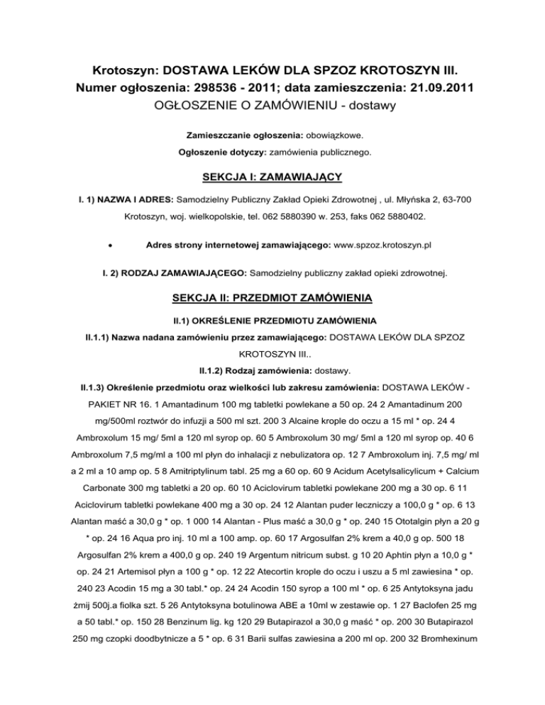 Krotoszyn: DOSTAWA LEKÓW DLA SPZOZ KROTOSZYN III. Numer