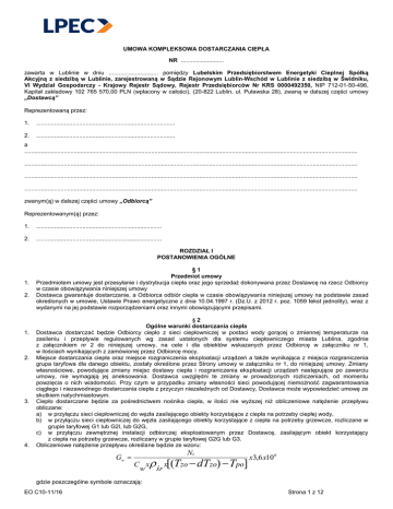 UMOWA KOMPLEKSOWA DOSTARCZANIA CIEPŁA NR .......................... zawarta w Lublinie w dniu .............................. pomiędzy Lubelskim Przedsiębiorstwem Energetyki Cieplnej Spółką Akcyjną z siedzibą w Lublinie, zarejestrowaną w Sądzie Rejonowym Lublin-Wschód w Lublinie z siedzibą w Świdniku, VI Wydział Gospodarczy - Krajowy Rejestr Sądowy, Rejestr Przedsiębiorców Nr KRS 0000492350, NIP 712-01-50-496, Kapitał zakładowy 102 765 570,00 PLN (wpłacony w całości), (20-822 Lublin, ul. Puławska 28), zwaną w dalszej części umowy „Dostawcą” Reprezentowaną przez: 1. .................................................................................... 2. .................................................................................... a .......................................................................................................................................................................................................... .......................................................................................................................................................................................................... .......................................................................................................................................................................................................... .......................................................................................................................................................................................................... zwanym(ą) w dalszej części umowy „Odbiorcą” Reprezentowanym(ą) przez: 1. ............................................................................ 2. ............................................................................ ROZDZIAŁ I POSTANOWIENIA OGÓLNE 1. 2. 1. 2. 3. 4. §1 Przedmiot umowy Przedmiotem umowy jest przesyłanie i dystrybucja ciepła oraz jego sprzedaż dokonywana przez Dostawcę na rzecz Odbiorcy w czasie obowiązywania niniejszej umowy Dostawca gwarantuje dostarczanie, a Odbiorca odbiór ciepła w czasie obowiązywania niniejszej umowy na podstawie zasad określonych w umowie, Ustawie Prawo energetyczne z dnia 10.04.1997 r. (Dz.U. z 2012 r. poz. 1059 tekst jednolity), wraz z wydanymi na jej podstawie rozporządzeniami oraz innymi obowiązującymi przepisami. §2 Ogólne warunki dostarczania ciepła Dostawca dostarczać będzie Odbiorcy ciepło z sieci ciepłowniczej w postaci wody gorącej o zmiennej temperaturze na zasileniu i przepływie regulowanych wg zasad ustalonych dla systemu ciepłowniczego miasta Lublina, zgodnie z załącznikiem nr 2 do niniejszej umowy, na cele i dla obiektów wskazanych przez Odbiorcę w załączniku nr 1, w ilościach wynikających z zamówionej przez Odbiorcę mocy. Miejsce dostarczania ciepła oraz miejsce rozgraniczenia eksploatacji urządzeń a także wynikająca z miejsca rozgraniczenia grupa taryfowa dla danego obiektu, zostały określone przez Strony umowy w załączniku nr 1, do niniejszej umowy. Zmiany własnościowe, powodujące zmiany miejsc dostawy ciepła i rozgraniczenia eksploatacji urządzeń następujące po zawarciu umowy, nie wymagają jej aneksowania. Dostawca uwzględni te zmiany w prowadzonych rozliczeniach, od momentu powzięcia o nich wiadomości. Przy czym w przypadku zmiany własności sieci powodującej niemożność zagwarantowania ciągłego i niezawodnego dostarczania ciepła z przyczyn niezależnych od Dostawcy, Dostawca może wypowiedzieć umowę ze skutkiem natychmiastowym. Ciepło dostarczane będzie za pośrednictwem nośnika ciepła, w ilości nie wyższej niż obliczeniowe natężenie przepływu obliczane: a) w przyłączu sieci ciepłowniczej do węzła zasilającego obiekty korzystające z ciepła na potrzeby ciepłej wody, b) w przyłączu sieci ciepłowniczej do węzła zasilającego obiekty korzystające z ciepła na potrzeby grzewcze, rozliczane w grupie taryfowej G1 lub G2I, lub G2G, c) w przyłączu zewnętrznej instalacji odbiorczej eksploatowanym przez Dostawcę, zasilającym obiekt korzystający z ciepła na potrzeby grzewcze, rozliczany w grupie taryfowej G2G lub G3. Obliczeniowe natężenie przepływu określane będzie ze wzoru: Go Nz C x x[(Tzo dTzo) Tpo] w śr x3,6 x10 6 gdzie poszczególne symbole oznaczają: EO C10-11/16 Strona 1 z 12 3 5. 6. 7. 8. 1. 2. 3. 4. 5. 6. 7. 8. Go -obliczeniowe natężenie przepływu [w m /h] Nz -zamówiona moc cieplna dla obiektu (obiektów zasilanych z danego węzła cieplnego z uwzględnieniem rodzajów potrzeb grzewczych zgodnie z § 2 ust. 3) [w MW] cw -średnie ciepło właściwe wody w parametrach pracy, w warunkach obliczeniowych [w kJ/kgK] 3 ρśr -średnią gęstość wody w parametrach pracy w warunkach obliczeniowych [w kg/m ] Tzo -temperaturę wody w rurociągu zasilającym, określoną w tabeli regulacyjnej dla sieci ciepłowniczej, dla warunków obliczeniowych φxo=1 (-20°C), natomiast dla obiektów Odbiorcy przyłączonych do zewnętrznej instalacji odbiorczej eksploatowanej przez Dostawcę tabela instalacyjna, załącznik nr 2 [w °C] dTzo -obniżenie temperatury wody dostarczanej do danego przyłącza wskutek strat podczas przesyłania, jeżeli Dostawca nie określił obniżenia należy przyjmować wartość 0 [w °C] Tpo -temperaturę wody w rurociągu powrotnym, określoną w tabeli regulacyjnej dla sieci ciepłowniczej, dla warunków obliczeniowych, natomiast dla obiektów Odbiorcy przyłączonych do zewnętrznej instalacji odbiorczej eksploatowanej przez Dostawcę tabela instalacyjna, załącznik nr 2 [w °C] (Odbiorca w porozumieniu z Dostawcą może określić indywidualną tabelę dla danego węzła, jeżeli wynika to z jego układu funkcjonalnego i warunków cieplno-hydraulicznych, na co przedstawi stosowne dokumenty i obliczenia) Zmiana tabeli regulacyjnej stanowiącej załącznik nr 2 do niniejszej umowy nie wymaga aneksowania umowy. O każdej zmianie t