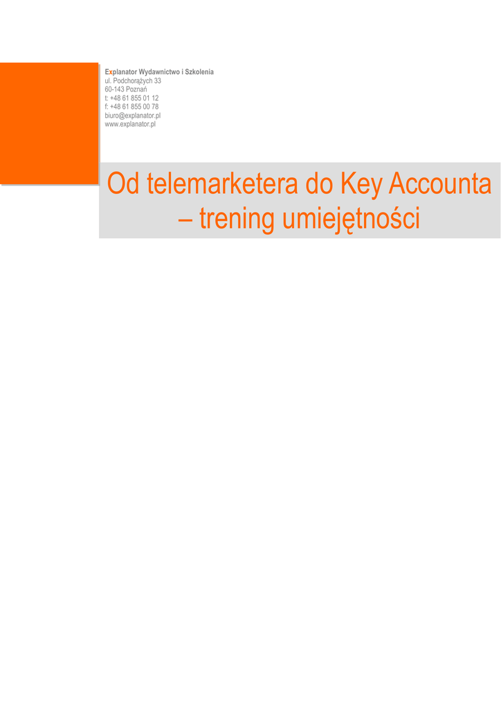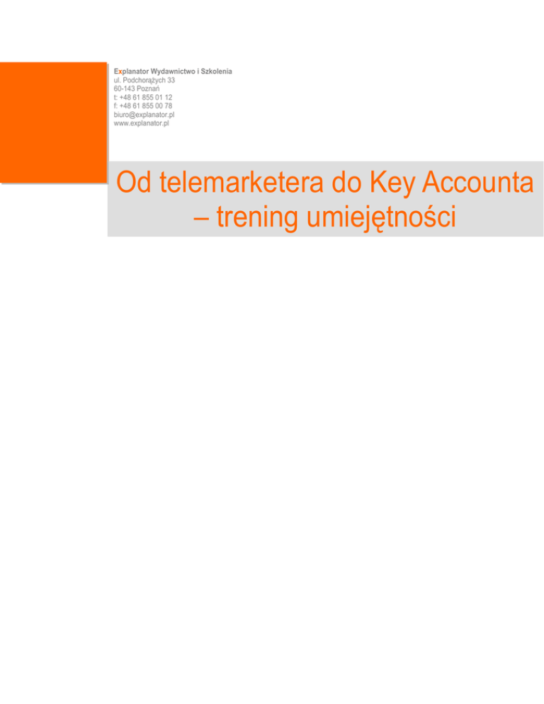 Explanator Wydawnictwo i Szkolenia ul. Podchorążych 33 60-143 Poznań t: +48 61 855 01 12 f: +48 61 855 00 78 [email protected] www.explanator.pl Od telemarketera do Key Accounta – trening umiejętności Od telemarketera do Key Accounta 6 kroków do zwiększenia efektywności zespołu handlowców RAMOWY PROGRAM SZKOLENIA _______________________________________________________________________________________________________ Po pierwsze – przygotowanie skutecznej rozmowy organizacja miejsca i czasu pracy – połowa sukcesu jak zaplanować cel ilościowy i jakościowy rozmów zanim zaczniesz rozmowę – o czym warto pamiętać źródła pozyskania klientów – jak budować bazy Po drugie – Przestań sprzedawać, zacznij rozmawiać podstawy skutecznej komunikacji biznesowej reguły komunikacji międzyludzkiej i ich znaczenie w kontaktach biznesowych struktura rozmowy sprzedażowej pozytywnego nastawienie dzwoniącego kluczem do skutecznej sprzedaży Po trzecie – sztuka słuchania rola diagnozy potrzeb w procesie sprzedaży jak dotrzeć do potrzeb klienta konstruowanie pytań nastawionych na ujawnianie potrzeb klienta DLA KOGO? Po czwarte – obrona przed atakiem klienta na słabe strony sprzedawcy „proszę wysłać mi ofertę mailem” – trudne zagrywki klientów błędy oraz stereotypy działania handlowców obiekcje klienta – okazja do poznania prawdziwych motywacji klienta Po piąte – skuteczna finalizacja rozmowy handlowej język korzyści w rozmowie finalizacja transakcji znaczenie tego co i jak mówisz Po szóste – Klient podpisał umowę, co dalej? znaczenie obsługi posprzedażowej dbałość o pełną informację dla wszystkich podmiotów transakcji częstotliwość telefonów podtrzymujących relację ____________________________________________________________________________________________________________________________________ Szkolenie przeznaczone jest dla pracowników na co dzień kontaktujących się z klientami oraz sprzedających przez telefon (i nie tylko) produkty lub usługi. Zapraszamy szczególnie przedstawicieli tych branż, w których indywidualne podejście do klienta i budowanie długofalowych relacji niejednokrotnie decyduje o sukcesie firmy. KORZYŚCI ______________________________________________________________________________________________________________________________________ informacja zwrotna dla uczestników jak pracować nad dostrajaniem się do klientów i co można poprawić, by kontakty z Klientem dawały oczekiwane rezultaty. szereg praktycznych wskazówek o co zadbać i jak kontaktować się z klientem, by ułożyć wzajemne relacje w optymalny sposób i by zadowolenie kupującego przekuło się w kolejne zamówienia METODY WYKORZYSTYWANE PODCZAS SZKOLENIA zdobycie nowych pomysłów na efektywne rozmowy telefoniczne profesjonalne podejście do rozmowy, które od pierwszych słów pozytywnie nastawi rozmówcę nabycie pewności siebie dzięki aktywnemu treningowi ____________________________________________________________________________ 3 dyskusje 5 warsztatów 2 burze mózgów rzetelne informacje zwrotne 5 ćwiczeń grupowych 1 miniwykład TRENER ____________________________________________________________________________________________________________ Andrzej SIERADZKI Prowadząc przez szereg lat własną działalność gospodarczą oraz pracując przez 4 lata w Biurze IFC (Grupa Banku Światowego), nabył praktycznego doświadczenia z zakresu negocjacji i prezentacji. Od 1997 r. w branży szkoleniowej, specjalizuje się w szkoleniach i doradztwie z zakresu Sprzedaży i negocjacji, Zarządzania Projektami i Podejmowania Decyzji. Brał udział w wielu projektach poświęconych obsłudze Klienta (Customer Service). CZAS TRWANIA SZKOLENIA: 1 dzień: 8 godzin INFOINFORMACJE ORGANIZACYJNE __________________________________________________________________________________________________ Miejsce zajęć: W ramach szkolenia gwarantujemy: Sala szkoleniowa wskazana przez organizatora lub siedziba firmy Klienta Diagnozę potrzeb szkoleniowych w oparciu o autorski kwestionariusz badania obszarów rozwoju Więcej informacji: Na podstawie powyższej analizy modyfikację i przygotowanie dedykowanego projektu szkolenia Ewa Guzek, + 48 61 858 47 93 [email protected] Zamówienia: Monika Simińska + 48 61 855 01 12 + 48 61 855 00 78 [email protected] Materiał szkoleniowe Artykuły pomocnicze Prowadzenie szkolenia przez wyselekcjonowanego trenera, eksperta w danej dziedzinie Opiekę merytoryczną i operacyjną nad realizacją szkolenia Ewaluację poszkoleniową: wg potrzeb ankiety i/lub raport Certyfikat Zapraszamy do zapoznania się z pełną ofertą szkoleniową na www.explanator.pl Niniejszy katalog szkoleń zamkniętych jest objęty prawem autorskim zgodnie z ustawą z dnia 4 lutego 1994 r. o prawie autorskim i prawach pokrewnych (tekst jedn.: Dz. U. z 2006 r., nr 90, poz. 631, dalej: pr. aut.). Kopiowanie i rozpowszechnianie treści w nich zawartych bez zgody firmy Explanator jest zabronione i będzie skutkowało zastosowaniem sankcji prawnych. Zapraszamy do wypełnienia poniższego formularza. Pozwoli on nam przygotować dla Państwa indywidualną wycenę. Formularz zapytania ofertowego Temat: Niezbędne zagadnienia Zakładana liczba uczestników Proponowany termin Organizacja Osoba do kontaktu Nazwa firmy Adres firmy Nr telefonu Nr faksu e-mail Sala: własna wskazana przez organizatora Catering: przerwy kawowe lunch nie Materiały szkoleniowe: tak, dla wszystkich tak, kilka sztuk nie