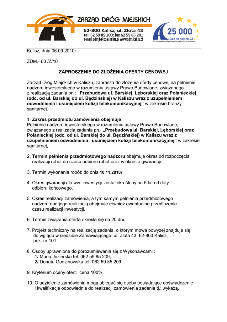 Kalisz, dnia 06.09.2010r. ZDM.- 60 /Z/10 ZAPROSZENIE DO ZŁOśENIA OFERTY CENOWEJ Zarząd Dróg Miejskich w Kaliszu, zaprasza do złoŜenia oferty cenowej na pełnienie nadzoru inwestorskiego w rozumieniu ustawy Prawo Budowlane, związanego z realizacją zadania pn.: „Przebudowa ul. Barskiej, Lęborskiej oraz Połanieckiej (odc. od ul. Barskiej do ul. Będzińskiej) w Kaliszu wraz z uzupełnieniem odwodnienia i usunięciem kolizji telekomunikacyjnej” w zakresie branŜy sanitarnej. 1. Zakres przedmiotu zamówienia obejmuje Pełnienie nadzoru inwestorskiego w rozumieniu ustawy Prawo Budowlane, związanego z realizacją zadania pn.: „Przebudowa ul. Barskiej, Lęborskiej oraz Połanieckiej (odc. od ul. Barskiej do ul. Będzińskiej) w Kaliszu wraz z uzupełnieniem odwodnienia i usunięciem kolizji telekomunikacyjnej” w zakresie sanitarnej, 2. Termin pełnienia przedmiotowego nadzoru obejmuje okres od rozpoczęcia realizacji robót do czasu odbioru robót oraz w okresie gwarancji. 3. Termin wykonania robót: do dnia 10.11.2010r. 4. Okres gwarancji dla ww. inwestycji został określony na 5 lat od daty odbioru końcowego. 5. Okres realizacji zamówienia, a tym samym pełnienia przedmiotowego nadzoru nad jego realizacją obejmuje równieŜ ewentualne przedłuŜenie czasu realizacji inwestycji. 6. Termin związania ofertą określa się na 20 dni. 7. Projekt techniczny na realizację zadania, o którym mowa powyŜej znajduje się do wglądu w siedzibie Zamawiającego: ul. Złota 43, 62-800 Kalisz, pok. nr 101. 8. Osoby uprawnione do porozumiewania się z Wykonawcami : 1/ Maria Jezierska tel. 062 59 85 209, 2/ Donata Gadzinowska tel. 062 59 85 209 9. Kryterium oceny ofert: cena 100%. 10. O udzielenie zamówienia mogą ubiegać się osoby posiadające doświadczenie i kwalifikacje odpowiednie do realizacji zamówienia zadania tj.: wykaŜą, Ŝe posiadają uprawnienia budowlane do kierowania robotami budowlanymi w zakresie niezbędnym do wykonania przedmiotu zamówienia oraz naleŜą (przynajmniej na dzień składania ofert) do właściwej izby samorządu zawodowego. 11. Pisemne oferty naleŜy złoŜyć w zaklejonej kopercie z podaną nazwą i adresem Wykonawcy, opatrzonej napisem: Oferta na pełnienie nadzoru inwestorskiego związanego z realizacją zadania pn.: „Przebudowa ul. Barskiej, Lęborskiej oraz Połanieckiej (odc. od ul. Barskiej do ul. Będzińskiej) w Kaliszu wraz z uzupełnieniem odwodnienia i usunięciem kolizji telekomunikacyjnej”, w zakresie branŜy .………………….. 12. Oferty naleŜy składać do dnia 15.09.2010r. do godz. 09:00 w siedzibie Zamawiającego ul. Złota 43, 62-800 Kalisz - SEKRETARIAT. Otwarcie ofert nastąpi o godz. 09:05. 13. Oferta winna zawierać: - formularz oferty na załączonym druku - aktualne zaświadczenie o wpisie do ewidencji działalności gospodarczej - posiadane uprawnienia i aktualne zaświadczenie o przynaleŜności do branŜowego samorządu zawodowego 14. Z oferentem, który złoŜy najkorzystniejszą cenowo ofertę zostanie podpisana umowa na pełnienie przedmiotowego nadzoru. W załączeniu „ Projekt umowy”. Załączniki: 1/ projekt umowy 2/ formularz oferty PROJEKT UMOWY UMOWA Nr …………… zawarta w dniu ………..2010 r. w Kaliszu pomiędzy Miastem Kalisz - Zarządem Dróg Miejskich w Kaliszu ul. Złota 43, reprezentowanym przez: ………………………… zwanym w dalszej treści „Zamawiającym” a ………………………………. zwanym w dalszej treści umowy „Wykonawcą” o treści następującej: §1 Przedmiotem umowy jest pełnienie nadzoru inwestorskiego nad realizacją zadania pn.: „Przebudowa ul. Barskiej, Lęborskiej oraz Połanieckiej (odc. od ul. Barskiej do ul. Będzińskiej) w Kaliszu wraz z uzupełnieniem odwodnienia i usunięciem kolizji telekomunikacyjnej” w zakresie branŜy …………………….., zgodnie z przepisami wynikającymi z ustawy Prawo Budowlane (ustawa z dnia 7 lipca 1994 r. z późn. zm.). §2 Termin wykonania zamówienia: 1. Termin pełnienia przedmiotowego nadzoru obejmuje okres od rozpoczęcia realizacji robót do czasu odbioru robót oraz w okresie gwarancji. 2. Termin realizacji robót określono do dnia 10.11.2010r. 3. Okres gwarancji dla ww. inwestycji został określony na 5 lat od daty bezusterkowego odbioru końcowego. 4. Okres realizacji zamówienia, a tym samym pełnienia przedmiotowego nadzoru nad jego realizacją obejmuje równieŜ ewentualne przedłuŜenie czasu realizacji inwestycji. §3 Integralną część niniejszej umowy stanowią: 1/ oferta Wykonawcy, 2/ zaproszenie do złoŜenia oferty cenowej, 3/ projekt techniczny 4/ szczegółowa specyfikacja techniczna §4 1. Strony ustalają wynagrodzenie ryczałtowe za przedmiot umowy w kwocie brutto: …….. zł (słownie złotych: …………………………..). 2. Wynagrodzenie zawiera /nie zawiera podatku VAT*. 3. Wykonawca oświadcza, Ŝe jest/nie jest płatnikiem podatku VAT*. 4. Wykonawca oświadcza, Ŝe prowadzi działalność gospodarczą i sam dokona rozliczenia z Urzędem Skarbowym /nie prowadzi działalności gospodarczej* 5. Wartość wynagrodzenia nie ulegnie zmianie bez względu na czas trwania inwestycji. 6. Wynagrodzenie wykonawcy nie ulegnie zmianie w przypadku gdy Wykonawca w trakcie wykonywania umowy stanie się płatnikiem podatku VAT* *niepotrzebne skreślić §5 Wykonawca oświadcza Ŝe posiada stosowne uprawnienia do pełnienia przedmiotowego nadzoru. §6 1. Wykonawca jest w granicach posiadanego umocowania niniejszą umową przedstawicielem Zamawiającego. 2. Wykonawca ponosi pełną odpowiedzialność za właściwą jakość i rozliczenie prac będących przedmiotem niniejszej umowy. 3. Wykonawca zobowiązuje się wykonać prace objęte niniejszą umową osobiście i zgodnie z wiedzą techniczną oraz obowiązującymi przepisami i normami. §7 Koordynatorem ze strony Zamawiającego w zakresie realizacji robót oraz usługi związanej z pełnieniem nadzoru inwestorskiego j