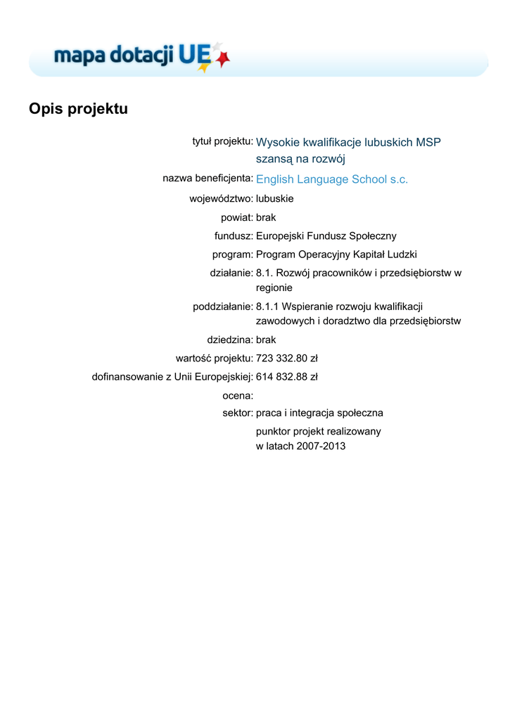 Opis projektu tytuł projektu: Wysokie kwalifikacje lubuskich MSP szansą na rozwój nazwa beneficjenta: English Language School s.c. województwo: lubuskie powiat: brak fundusz: Europejski Fundusz Społeczny program: Program Operacyjny Kapitał Ludzki działanie: 8.1. Rozwój pracowników i przedsiębiorstw w regionie poddziałanie: 8.1.1 Wspieranie rozwoju kwalifikacji zawodowych i doradztwo dla przedsiębiorstw dziedzina: brak wartość projektu: 723 332.80 zł dofinansowanie z Unii Europejskiej: 614 832.88 zł ocena: sektor: praca i integracja społeczna punktor projekt realizowany w latach 2007-2013