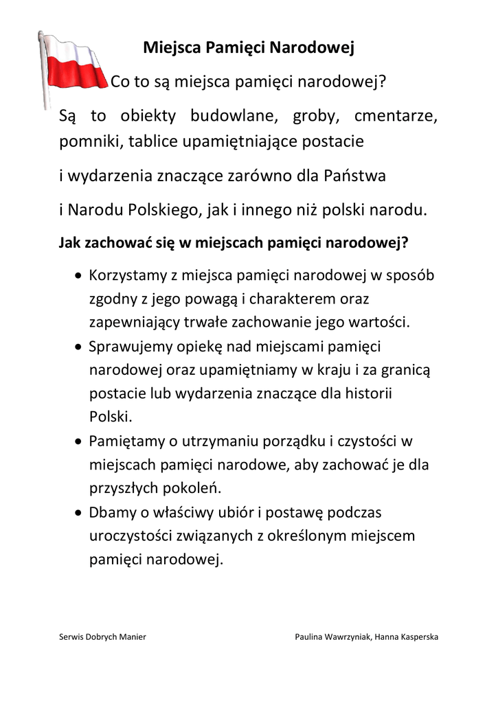 Miejsca Pamięci Narodowej Co to są miejsca pamięci narodowej? Są to obiekty budowlane, groby, cmentarze, pomniki, tablice upamiętniające postacie i wydarzenia znaczące zarówno dla Państwa i Narodu Polskiego, jak i innego niż polski narodu. Jak zachować się w miejscach pamięci narodowej? Korzystamy z miejsca pamięci narodowej w sposób zgodny z jego powagą i charakterem oraz zapewniający trwałe zachowanie jego wartości. Sprawujemy opiekę nad miejscami pamięci narodowej oraz upamiętniamy w kraju i za granicą postacie lub wydarzenia znaczące dla historii Polski. Pamiętamy o utrzymaniu porządku i czystości w miejscach pamięci narodowe, aby zachować je dla przyszłych pokoleń. Dbamy o właściwy ubiór i postawę podczas uroczystości związanych z określonym miejscem pamięci narodowej. Serwis Dobrych Manier Paulina Wawrzyniak, Hanna Kasperska