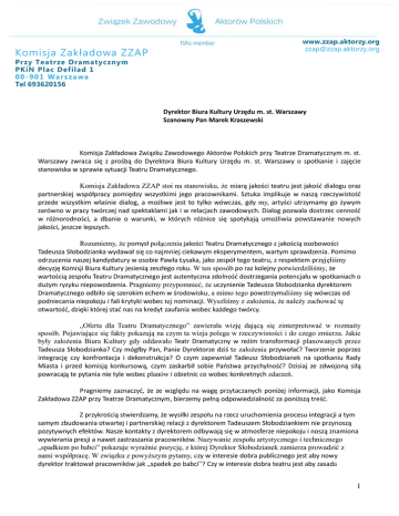 Komisja Zakładowa ZZAP www.zzap.aktorzy.org [email protected] Przy Teatrze Dramatycznym PKiN Plac Defilad 1 00-901 Warszawa Tel 693620156 Dyrektor Biura Kultury Urzędu m. st. Warszawy Szanowny Pan Marek Kraszewski Komisja Zakładowa Związku Zawodowego Aktorów Polskich przy Teatrze Dramatycznym m. st. Warszawy zwraca się z prośbą do Dyrektora Biura Kultury Urzędu m. st. Warszawy o spotkanie i zajęcie stanowiska w sprawie sytuacji Teatru Dramatycznego. Komisja Zakładowa ZZAP stoi na stanowisku, że miarą jakości teatru jest jakość dialogu oraz partnerskiej współpracy pomiędzy wszystkimi jego pracownikami. Sztuka implikuje w naszą rzeczywistość przede wszystkim właśnie dialog, a możliwe jest to tylko wówczas, gdy my, artyści utrzymamy go żywym zarówno w pracy twórczej nad spektaklami jak i w relacjach zawodowych. Dialog pozwala dostrzec cenność w różnorodności, a dbanie o warunki, w których różnice się spotykają umożliwia powstawanie nowych jakości, jeszcze lepszych. Rozumiemy, że pomysł połączenia jakości Teatru Dramatycznego z jakością osobowości Tadeusza Słobodzianka wydawał się co najmniej ciekawym eksperymentem, wartym sprawdzenia. Pomimo odrzucenia naszej kandydatury w osobie Pawła Łysaka, jako zespół tego teatru, z respektem przyjęliśmy decyzję Komisji Biura Kultury jesienią zeszłego roku. W ten sposób po raz kolejny potwierdziliśmy, że wartością zespołu Teatru Dramatycznego jest autentyczna zdolność dostrzegania potencjału w spotkaniach o dużym ryzyku niepowodzenia. Pragniemy przypomnieć, że uczynienie Tadeusza Słobodzianka dyrektorem Dramatycznego odbiło się szerokim echem w środowisku, a mimo tego powstrzymaliśmy się wówczas od podniecania niepokoju i fali krytyki wobec tej nominacji. Wyszliśmy z założenia, że należy zachować tę otwartość, dzięki której stać nas na kredyt zaufania wobec każdego twórcy. „Oferta dla Teatru Dramatycznego” zawierała wizję dającą się zinterpretować w rozmaity sposób. Pojawiające się fakty pokazują na czym ta wizja polega w rzeczywistości i do czego zmierza. Jakie były założenia Biura Kultury gdy oddawało Teatr Dramatyczny w reżim transformacji planowanych przez Tadeusza Słobodzianka? Czy mógłby Pan, Panie Dyrektorze dziś te założenia przywołać? Tworzenie poprzez integrację czy konfrontacja i dekonstrukcja? O czym zapewniał Tadeusz Słobodzianek na spotkaniu Rady Miasta i przed komisją konkursową, czym zaskarbił sobie Państwa przychylność? Dzisiaj ze zdwojoną siłą powracają te pytania nie tyle wobec planów i obietnic co wobec konkretnych zdarzeń. Pragniemy zaznaczyć, że ze względu na wagę przytaczanych poniżej informacji, jako Komisja Zakładowa ZZAP przy Teatrze Dramatycznym, bierzemy pełną odpowiedzialność za poniższą treść. Z przykrością stwierdzamy, że wysiłki zespołu na rzecz uruchomienia procesu integracji a tym samym zbudowania otwartej i partnerskiej relacji z dyrektorem Tadeuszem Słobodziankiem nie przynoszą pozytywnych efektów. Nasze kontakty z dyrektorem odbywają się w atmosferze niepokoju i noszą znamiona wywierania presji a nawet zastraszania pracowników. Nazywanie zespołu artystycznego i technicznego „spadkiem po babci” pokazuje wyraźnie pozycję, z której Dyrektor Słobodzianek zamierza prowadzić z nami współpracę. W związku z powyższym pytamy, czy w interesie dobra publicznego jest aby nowy dyrektor traktował pracowników jak „spadek po babci”? Czy w interesie dobra teatru jest aby zasada 1 Komisja Zakładowa ZZAP www.zzap.aktorzy.org [email protected] Przy Teatrze Dramatycznym PKiN Plac Defilad 1 00-901 Warszawa Tel 693620156 „spadku po babci” deprecjonowała wartość zespołu zaliczanego do najlepszych w kraju? Ilość nagród, ilość wybitnych reżyserów zapraszających nas do współpracy są ważniejszym wyznacznikiem naszej wartości niż kryterium, którym traktuje nas dyrektor Słobodzianek - jak sam zaznacza, daje sobie prawo do wyboru wedle przydatności (Porównanie zespołu Teatru Dramatycznego do spadku po babci przytaczamy dosłownie za p. Słobodziankiem). A przecież zostaliśmy jako Teatr Dramatyczny „szczerze” wychwaleni w programie wyborczym pana Słobodzianka. Mogło się zdawać wręcz, że nadchodzi autentyczny orędownik tego miejsca i jego zespołu. Jaki mamy rezultat? W ciągu kilku zaledwie miesięcy zdjęte zostały prawie wszystkie dotychczasowe spektakle stworzone w poprzedniej kadencji dyrektorskiej. Spektakle te zostały zdjęte przy niemal pełnych widowniach. Jeden ze spektakli wobec dużego zainteresowania ze strony widzów, został ocalony przez jego aktorów i grany jest we własnym zakresie twórców, lecz bez szyldu i wsparcia teatru, który nie chce dłużej firmować tego spektaklu. Ponosimy koszty dotychczas niewyjaśnionych zerwań prób nad trzema spektaklami. Jest to sytuacja bez precedensu, żeby trzej reżyserzy z dnia na dzień, w atmosferze konfliktu z dyrektorem zaprzestali pracy. Pan Słobodzianek zignorował nasz głos w tej sytuacji i dodatkowo rozpowszechnia nieprawdziwą informację, jakoby reżyserzy zrezygnowali z prób z winy zespołu artystycznego. Ponosimy koszty niegrania jesienią zeszłego roku spektakli poprzedniej dyrekcji z powodu rzekomych długów teatru. Ponosimy koszty kilku jątrzących się przypadków łamania Regulaminu Pracy oraz praktykowania przez Teatr zawierania z pracownikami dodatkowych umów ponad umowami etatowymi. Umowy takie pozbawiają nas świadczeń emerytalnych i naruszają Kodeks Pracy. Państwowa Inspekcja Pracy wykazała właśnie rażące łamanie praw pracowniczych. Prowadzone są postępowania sądowe przeciwko panu Słobodziankowi o łamanie praw pracowniczych. Przytaczanie i tak niepełnej listy wewnętrznych wydarzeń z Teatru Dramatycznego jest próbą ukazania złożoności sytuacji, która nabrała alarmującego kształtu. Jako zespół artystyczny odbyl