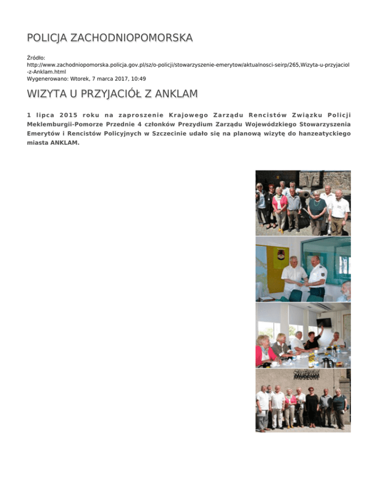 POLICJA ZACHODNIOPOMORSKA Źródło: http://www.zachodniopomorska.policja.gov.pl/sz/o-policji/stowarzyszenie-emerytow/aktualnosci-seirp/265,Wizyta-u-przyjaciol -z-Anklam.html Wygenerowano: Wtorek, 7 marca 2017, 10:49 WIZYTA U PRZYJACIÓŁ Z ANKLAM 1 lipca 2015 roku na zaproszenie Krajowego Zarządu Rencistów Związku Policji Meklemburgii-Pomorze Przednie 4 członków Prezydium Zarządu Wojewódzkiego Stowarzyszenia Emerytów i Rencistów Policyjnych w Szczecinie udało się na planową wizytę do hanzeatyckiego miasta ANKLAM. W wyjeździe uczestniczyli: * Henryk Karcz - Prezes Stowarzyszenia Emerytów i Rencistów Policyjnych w Szczecinie, * Janina Szalimow - Sekretarz Zarządu Stowarzyszenia Emerytów i Rencistów Policyjnych w Szczecinie, * Danuta Raczkowska - Członek Zarządu Stowarzyszenia Emerytów i Rencistów Policyjnych w Szczecinie, * Danuta Łosiniecka - Rzecznik Prasowy Stowarzyszenia Emerytów i Rencistów Policyjnych w Szczecinie. Zastępca Dyrektora Naczelnego Policji w Anklam powitał gości i przedstawił strukturę Policji w Anklam oraz zadania poszczególnych jednostek. Planują rozszerzyć współpracę z Komendą Wojewódzką Policji w Szczecinie, zwłaszcza z przygranicznymi jednostkami oraz organizować wspólne policyjne patrole niemiecko-polskie. Prezes Stowarzyszenia Emerytów i Rencistów Policyjnych w Szczecinie, Henryk Karcz podziękował za zaproszenie. Dzięki gospodarzom nasze spotkania zawsze przebiegają w miłej i serdecznej atmosferze. Zależy nam na dalszej współpracy między polskimi i niemieckimi emerytami i utrzymywaniu dalszych kontaktów. Następnie gospodarze zaprosili nas na krótką przejażdżkę krajobrazową łodzią policji wodnej. Potem mieliśmy możliwość zwiedzenia Muzeum Historii Kraju Rodzinnego i Regionu w Anklam oraz odbyć wizytę w Kościele św. Mikołaja z XIV wieku w Anklam, gdzie wspieliśmy się na wieżę o wysokości 104 m. Następnie zwiedziliśmy Muzeum Otto Lilienthala, skupiające się na osobie największego pioniera lotnictwa, inżyniera i humanisty. Loty Lilienthala przedstawione są tu jako punkty zwrotne w historii człowieka związanej z marzeniami o lataniu, których rezultatem jest rozwój techniczny oraz historia lotnictwa. W muzeum była przerwa na kawę, gdzie gościnna Renate Randel i jej 4 kolegów z Krajowego Zarządu Rencistów Związku Zawodowego Policji (GdP) M-PP pożegnało nas. Wszystko precyzyjnie zaplanowane, miejsce na policyjnym parkingu zapewnione, do dyspozycji mieliśmy związkowy samochód transporter. Fachowo tłumaczył Klaus Urbanek. Mosty są czymś cudownym, kreują bowiem połączenia ponad podziałami, tak aby ludzie mogli być bliżej siebie i ze sobą. Nasze kontakty pozostawiają miłe wspomnienia i chęć dalszej współpracy, która inspiruje nas do współdziałania. Oby tak było! A problemy mamy podobne. Atmosfera spotkania była bardzo koleżeńska i serdeczna, a uczestnicy wyrazili przekonanie, że spotkają się wkrótce. Danuta Łosiniecka Ocena: 0/5 (0) Tweetnij