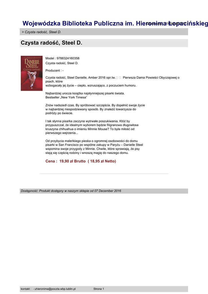 Utworzono : 07Łopacińskieg March 2017 Wojewódzka Biblioteka Publiczna im. Hieronima > Czysta radość, Steel D. Czysta radość, Steel D. Model : 9788324160358 Czysta radość, Steel D. Producent : Czysta radość, Steel Danielle, Amber 2016 opr.tw.�� Pierwsza Dama Powieści Obyczajowej o psach, które wzbogacały jej życie – ciepło, wzruszająco, z poczuciem humoru. Najbardziej urocza książka najsłynniejszej pisarki świata. Bestseller „New York Timesa” Znów nadszedł czas. By spróbować szczęścia. By dopełnić swoje życie w najbardziej niespodziewany sposób. By znaleźć towarzysza do podróży po świecie. I tak słynna pisarka zaczyna wytrwałe poszukiwania. Któż by przypuszczał, że idealnym wyborem będzie filigranowa długowłosa kruszyna chihuahua o imieniu Minnie Mouse? To była miłość od pierwszego wejrzenia... Od przybycia maleńkiego pieska o ogromnej osobowości do domu pisarki w San Francisco po wspólne zakupy w Paryżu – Danielle Steel wspomina swoje przygody z Minnie. Chwile, które sprawiają, że psy stają się częścią rodziny i wnoszą magię do naszego domu. Cena : 19,90 zł Brutto ( 18,95 zł Netto) Dostępność: Produkt dostępny w naszym sklepie od 07 December 2016 kontakt : - [email protected] Strona 1
