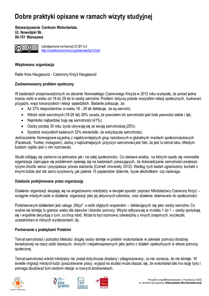 Dobre praktyki opisane w ramach wizyty studyjnej Stowarzyszenie Centrum Wolontariatu Ul. Nowolipki 9b 00-151 Warszawa Udostępnione na licencji CC BY 3.0 http://creativecommons.org/licenses/by/3.0/pl/ Wizytowana organizacja Røde Kros Haugesund - Czerwony Krzyż Haugesund Zaobserwowany problem społeczny W badaniach przeprowadzonych na zlecenie Norweskiego Czerwonego Krzyża w 2012 roku wykazały, że ponad jedna trzecia osób w wieku od 18 do 29 lat to osoby samotne. Problem dotyczy przede wszystkim relacji społecznych, budowani przyjaźni, więzi towarzyskich i relacji sąsiedzkich. Badanie pokazuje, że: Aż 37% respondentów w wieku 18 - 29 lat deklaruje, że są samotni; Wśród osób samotnych (18-29 lat) 30% uważa, że powodem ich samotności jest brak pewności siebie i lęk; Najmłodsi najbardziej boją się samotności (41%); Osoby poniżej 30 roku życia ukrywają się ze swoją samotnością (25%) Spośród wszystkich badanych 32% stwierdziło, że wstydzą się samotności; Jednocześnie Norwegowie są jedną z najaktywniejszych grup narodowych w globalnych mediach społecznościowych (Facebook, Twitter, Instagram). Jedną z najtrudniejszych przyczyn samotności jest fakt, że jest to temat tabu. Młodym ludziom ciężko jest o nim rozmawiać. Skutki odbijają się zarówno na jednostce jak i na całej społeczności. Co ciekawe analizy, na których oparły się norweskie organizacja zajmujące się problemem opierają się na badaniach pokazujących, że doświadczanie samotności zwiększa ryzyko chorób serca i przyspiesza proces starzenia (Cornell University 2012). Według tych badań ograniczony kontakt z innymi ludzie jest tak samo ryzykowny, jak palenie 15 papierosów dziennie, bycie alkoholikiem czy nadwaga. Działania podejmowane przez organizację Działania organizacji skupiają się na angażowaniu młodzieży w dwojaki sposób: poprzez Młodzieżowy Czerwony Krzyż – wciągnie młodych osób w działania organizacji jako jej aktywnych członków, oraz działania skierowane do społeczności. Podstawowym działaniem jest usługa „Wizyt” u osób objętych wsparciem – deklarujących się jako osoby samotne. Co ważne nie istnieją tu granice wieku dla dawców i biorców pomocy. Wizyta odbywa się w modelu 1 do 1 – osoby spotykają się i wspólnie decydują o tym, co chcą robić. Może to być rozmowa, odwiedziny u innych znajomych, wycieczki, uczestnictwo w różnych wydarzeniach, itp. Porównanie z praktykami Polskimi Temat samotności i potrzeby bliskości drugiej osoby istnieje w polskim wolontariacie w zakresie pomocy doraźnej świadczonej na rzecz osób starszych, chorych i niepełnosprawnych jako jedno z działań opiekuńczych w sferze pomocy społecznej. Temat samotności wśród młodzieży nie został dotychczas zbadany i zdiagnozowany, co nie oznacza, że nie istnieje. W świetle migracji młodych ludzi (poszukiwanie pracy, wyjazd na studia) może okazać się, że wolontariat taki ma rację bytu i pomaga zbudować tym osobom relacje w nowych środowiskach. Projekt współfinansowany z Funduszy EOG w ramach programu Obywatele dla Demokracji Co ważne norweski model pokazuje, że problem samotności nie dotyczy tylko osób starszych, a przeciwdziałanie mu można oprzeć nie tylko na działaniu wolontariusza, ale także osoby potrzebujące, która buduje więzi poprzez wolontariat. Wykorzystano Ensomhet blant unge voksne, Skaperkraft-notat nr 3/2013 (UNG) http://skaperkraft.no/wp-content/uploads/2013/11/Notat-3-2013-UNG-Notat-om-ensomhet-blant-unge-voksne.pdf Projekt współfinansowany z Funduszy EOG w ramach programu Obywatele dla Demokracji