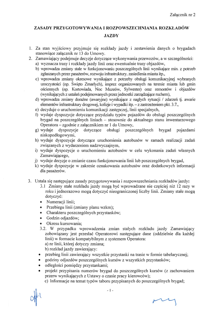 Załącznik nr 2 ZASADY P R Z Y G O T O W Y W A N I A I R O Z P O W S Z E C H N I A N I A R O Z K Ł A D Ó W JAZDY 1. Za stan wyjściowy przyjmuje się rozkłady jazdy i zestawienia danych o brygadach stanowiące załącznik nr 13 do Umowy. 2. Zamawiający podejmuje decyzje dotyczące wykonywania przewozów, a w szczególności: a) wyznacza trasy i rozkłady jazdy linii oraz ewentualnie trasy objazdów, b) wprowadza zmiany stałe w funkcjonowaniu poszczególnych linii wynikające min. z potrzeb zgłaszanych przez pasażerów, rozwoju infrastruktury, zasiedlenia miasta itp., c) wprowadza zmiany okresowe wynikające z potrzeby obsługi komunikacyjnej wybranych uroczystości (np. Święto Zmarłych), imprez organizowanych na terenie miasta lub gmin ościennych (np. Kortowiada, Noc Muzeów, Sylwester) oraz remontów i objazdów (wynikających z ustaleń podejmowanych przez jednostki zarządzające ruchem), d) wprowadza zmiany doraźne (awaryjne) wynikające z nagłych sytuacji / zdarzeń tj. awarie elementów infrastruktury drogowej, kolizje i wypadki itp. - z zastrzeżeniem pkt. 3.7., e) decyduje o uruchomieniu komunikacji zastępczej, linii specjalnych, f) wydaje dyspozycje dotyczące przydziału typów pojazdów do obsługi poszczególnych brygad na poszczególnych liniach - stosownie do aktualnego stanu inwentarzowego Operatora - zgodnie z załącznikiem nr 1 do Umowy, g) wydaje dyspozycje dotyczące obsługi poszczególnych brygad pojazdami niskopodłogowymi, h) wydaje dyspozycje dotyczące uruchomienia autobusów w ramach realizacji zadań związanych z wydarzeniem nadzwyczajnym, i) wydaje dyspozycje o uruchomieniu autobusów w celu wykonania zadań własnych Zamawiającego, j) wydaje decyzje o zmianie czasu funkcjonowania linii lub poszczególnych brygad, k) wydaje dyspozycje w zakresie oznakowania autobusów oraz dodatkowych informacji dla pasażerów. 3. Ustala się następujące zasady przygotowywania i rozpowszechniania rozkładów jazdy: 3.1 Zmiany stałe rozkładu jazdy mogą być wprowadzane nie częściej niż 12 razy w roku i jednorazowo mogą dotyczyć nieograniczonej liczby linii. Zmiany stałe mogą dotyczyć: • Numeracji linii; • Przebiegu linii (zmiany planu wzkm); • Charakteru poszczególnych przystanków; ® Godzin odjazdów; • Okresu kursowania; 3.2. W przypadku wprowadzenia zmian stałych rozkładu jazdy Zamawiający zobowiązany jest przesłać Operatorowi następujące dane (oddzielnie dla każdej linii) w formacie kompatybilnym z systemem Operatora: a) nr linii, której dotyczy zmiana; b) rozkład jazdy zawierający: • przebieg linii zawierający wszystkie przystanki na trasie w formie tabelarycznej; • godziny odjazdów poszczególnych kursów z wszystkich przystanków; • odległości pomiędzy przystankami; • projekt przypisania numerów brygad do poszczególnych kursów (z zachowaniem przerw wynikających z Ustawy o czasie pracy kierowców); c) Informacje na temat typów taboru przypisanych do poszczególnych brygad; Załącznik nr 2 d) Informacje na temat ewentualnej obsługi poszczególnych brygad przez pojazdy niskopodłogowe; e) datę wdrożenia zmian; f) informacje o obsłudze poszczególnych brygad przez danych Operatorów; 3.3. Dane z pkt. 3.2. Zamawiający przesyła, najpóźniej na 15 dni roboczych przed datą rozpoczęcia obowiązywania zmian. 3.4. W ciągu pięciu dni roboczych od przekazania przez Zamawiającego danych wymienionych w pkt. 3.2. Operator może wnieść uwagi do projektu przypisania numerów brygad do poszczególnych kursów obsługiwanych przez Operatora (z zachowaniem przerw wynikających z Ustawy o czasie pracy kierowców), przygotowanych przez Zamawiającego. W przypadku uwzględnienia poprawek przekazanych przez Operatora, Zamawiający w ciągu pięciu kolejnych dni roboczych przekazuje Operatorowi ostateczną wersję: przypisania numerów brygad do poszczególnych kursów, typów taboru przypisanych do poszczególnych brygad, ewentualnej obsługi poszczególnych brygad przez pojazdy niskopodłogowe. 3.6 Po otrzymaniu zmian, Operator przygotowuj e/zmienia/aktualizuje odpowiednie dokumenty - zgodnie z ustawą o transporcie drogowym. Koszty obciążają Operatora. 3.7. Zmiany okresowe mogą być wprowadzone nieograniczoną ilość razy w roku, w zależności od występujących potrzeb. W zależności od charakteru zmian okresowych, Zamawiający zobowiązuje się przekazać Operatorowi, najpóźniej na 15 dni roboczych przed datą obowiązywania zmian, a w wyjątkowych przypadkach, o ile Zamawiający zostanie poinformowany później, w terminie krótszym niż 15 dni, oddzielnie dla każdej linii w formacie kompatybilnym z systemem Operatora, wybrane, niezbędne informacje o których mowa w pkt. 3.2. 3.8. Do momentu powstania centrum zarządzania ruchem po stronie Zamawiającego, o wprowadzeniu zmian doraźnych (awaryjnych) decyduje Operator, po czym w trybie pilnym informuje wyznaczonych przedstawicieli Zamawiającego. Po uruchomieniu centrum zarządzania ruchem, o wprowadzeniu ewentualnych zmian doraźnych (awaryjnych) decydować będzie Zamawiający, po czym niezwłocznie informować będzie Operatora. Zmiany doraźne (awaryjne) mogą dotyczyć: • • • • Numeracji linii; Przebiegu linii; Charakteru poszczególnych przystanków; Godzin odjazdów; Operator: PREZES ZARZĄDU SKARBNIK MIASTA