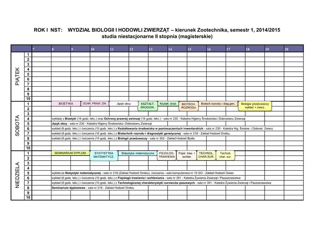 ROK I NST: NIEDZIELA SOBOTA PIĄTEK 7 ROK I 1 2 3 4 5 6 7 8 9 10 1 2 3 4 5 6 7 8 9 10 1 2 3 4 5 6 7 8 9 10 8 WYDZIAŁ BIOLOGII I HODOWLI ZWIERZĄT – kierunek Zootechnika, semestr 1, 2014/2015 studia niestacjonarne II stopnia (magisterskie) 9 BIOETYKA 10 11 OCHR. PRAW. ZW. 12 Język obcy 13 KSZTAŁT. ŚRODOW. 14 Kształt. środ. 15 BIOTECH. ROZRODU 16 17 Biotech.rozrodu i diag.gen. 18 19 Biologia przeżuwaczy wykład + ćwicz. wykłady z Bioetyki (16 godz. lekc.) oraz Ochrony prawnej zwierząt (16 godz. lekc.) - sala nr 230 - Katedra Higieny Środowiska i Dobrostanu Zwierząt Język obcy - sala nr 230 - Katedra Higieny Środowiska i Dobrostanu Zwierząt wykład (8 godz. lekc.) i ćwiczenia (10 godz. lekc.) z Kształtowania środowiska w pomieszczeniach inwentarskich - sala nr 230 - Katedra Hig. Środow. i Dobrost. Zwierz. wykład (8 godz. lekc.) i ćwiczenia (16 godz. lekc.) z Biotechnik rozrodu i diagnostyki genetycznej - sala nr 218 - Zakład Hodowli Drobiu, wykład (8 godz. lekc.) i ćwiczenia (10 godz. lekc.) z Biologii przeżuwaczy - sala nr 302 - Zakład Hodowli Bydła SEMINARIUM DYPLOM. STATYSTYKA MATEMATYCZ. Statystyka matematyczna FIZJOLOG. TRAWIENIA Fizjol. traw. i wchłan TECHNOL. CHAR.SUR. Technol. char. sur. wykład ze Statystyki matematycznej - sala nr 218 (Zakład Hodowli Drobiu), ćwiczenia - sala komputerowa nr 15 GO - Zakład Hodowli Owiec wykład (8 godz. lekc.) i ćwiczenia (10 godz. lekc.) z Fizjologii trawienia i wchłaniania - sala nr 391 - Katedra Żywienia Zwierząt i Paszoznawstwa wykład (8 godz. lekc.) i ćwiczenia (10 godz. lekc.) z Technologicznej charakterystyki surowców paszowych - sala nr 391 - Katedra Żywienia Zwierząt i Paszoznawstwa Seminarium dyplomowe - sala nr 218 - Zakład Hodowli Drobiu Wydział BIOLOGII I HODOWLI ZWIERZĄT kierunek Zootechnika semestr 2 2004/2005 20