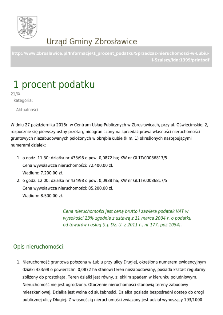 Urząd Gminy Zbrosławice http://www.zbroslawice.pl/Informacje/1_procent_podatku/Sprzedzaz-nieruchomosci-w-Lubiui-Szalszy/idn:1399/printpdf 1 procent podatku 21/IX kategoria: Aktualności W dniu 27 października 2016r. w Centrum Usług Publicznych w Zbrosławicach, przy ul. Oświęcimskiej 2, rozpocznie się pierwszy ustny przetarg nieograniczony na sprzedaż prawa własności nieruchomości gruntowych niezabudowanych położonych w obrębie Łubie (k.m. 1) określonych następującymi numerami działek: 1. o godz. 11 30: działka nr 433/98 o pow. 0,0872 ha; KW nr GL1T/00086817/5 Cena wywoławcza nieruchomości: 72.400,00 zł. Wadium: 7.200,00 zł. 2. o godz. 12 00: działka nr 434/98 o pow. 0,0938 ha; KW nr GL1T/00086817/5 Cena wywoławcza nieruchomości: 85.200,00 zł. Wadium: 8.500,00 zł. Cena nieruchomości jest ceną brutto i zawiera podatek VAT w wysokości 23% zgodnie z ustawą z 11 marca 2004 r. o podatku od towarów i usług (t.j. Dz. U. z 2011 r., nr 177, poz.1054). Opis nieruchomości: 1. Nieruchomość gruntowa położona w Łubiu przy ulicy Długiej, określona numerem ewidencyjnym działki 433/98 o powierzchni 0,0872 ha stanowi teren niezabudowany, posiada kształt regularny zbliżony do prostokąta. Teren działki jest równy, z lekkim spadem w kierunku południowym. Nieruchomość nie jest ogrodzona. Otoczenie nieruchomości stanowią tereny zabudowy mieszkaniowej. Działka jest wolna od służebności. Działka posiada bezpośredni dostęp do drogi publicznej ulicy Długiej. Z własnością nieruchomości związany jest udział wynoszący 193/1000 części w gruncie o numerze ewidencyjnym działki nr 435/98 o pow. 0,1100 ha km. 1 obr. Łubie, stanowiącej drogę dojazdową do nieruchomości. Działka nie jest uzbrojona w urządzenia infrastruktury technicznej takie jak sieć energetyczna, wodociągowa i kanalizacyjna. Woda i sieć energetyczna w drodze ul. Długiej. Brak kanalizacji w miejscowości. Nieruchomość jest wolna od obciążeń. 2. Nieruchomość gruntowa położona w Łubiu przy ulicy Długiej, określona numerem ewidencyjnym działki 434/98 o powierzchni 0,0938 ha stanowi teren niezabudowany, posiada kształt regularny zbliżony do prostokąta. Teren działki jest równy, z lekkim spadem w kierunku południowym. Nieruchomość nie jest ogrodzona. Otoczenie nieruchomości stanowią tereny zabudowy mieszkaniowej. Działka jest wolna od służebności. Działka posiada bezpośredni dostęp do drogi publicznej ulicy Długiej. Działka nie jest uzbrojona w urządzenia infrastruktury technicznej takie jak sieć energetyczna, wodociągowa i kanalizacyjna. Woda i sieć energetyczna w drodze ul. Długiej. Z własnością nieruchomości związany jest udział wynoszący 208/1000 części w gruncie o numerze ewidencyjnym działki nr 435/98 o pow. 0,1100 ha km. 1 obr. Łubie, stanowiącej drogę dojazdową do nieruchomości. Brak kanalizacji w miejscowości. Nieruchomość jest wolna od obciążeń. Przeznaczenie nieruchomości oraz sposób zagospodarowania: Zgodnie z zatwierdzonym Uchwałą nr XXX/510/06 Rady Gminy Zbrosławice z dnia 22.02.2006 r., miejscowym planem zagospodarowania przestrzennego Gminy Zbrosławice dla obszaru sołectwa Łubie, przedmiotowe nieruchomości położone są na obszarze oznaczonym symbolem 90 MNU, co oznacza tereny przeznaczone na cele mieszkalnictwa z możliwością lokalizacji usług nieuciążliwych w tym: usług zdrowia i opieki społecznej oraz tereny zabudowy zagrodowej w gospodarstwach rolnych. Wadium: Udział w przetargu mogą brać osoby fizyczne lub prawne, które wniosą wadium w wysokości podanej powyżej, w formie pieniężnej. Wpłaty wadium można dokonać przelewem na konto bankowe Urzędu Gminy w Zbrosławicach nr 61-8463-0005-2002-0020-1276-0011 lub w kasie Urzędu Gminy w Zbrosławicach przy ul. Oświęcimskiej 2 z zaznaczeniem „Wadium na przetarg ustny nieograniczony, działka nr ........., pow. ............ obr..........., imię i nazwisko oraz PESEL lub nazwa firmy oraz NIP, na czyją rzecz nieruchomość będzie nabywana". Wadium winno być uznane na rachunku gminy Zbrosławice najpóźniej do dnia 20 października 2016 r. Wpłacone wadium podlega: zaliczeniu na poczet ceny nieruchomości zaoferowanej przez oferenta, który wygra przetarg, zwrotowi pozostałym oferentom, którzy przetargu nie wygrają – bez możliwości przeksięgowania na inny przetarg, przepadkowi, jeżeli osoba, która wygra przetarg, uchyli się od zawarcia umowy notarialnej w wyznaczonym terminie. Warunki uczestnictwa w przetargu: wniesienie wadium w wymaganym terminie i wysokości oraz okazanie komisji przetargowej przed otwarciem przetargu dowodu wniesienia wadium; okazanie komisji przetargowej dowodu osobistego osoby obecnej na przetargu; pełnomocnictwo wydane w formie aktu notarialnego w przypadku działania przez pełnomocnika (dotyczy zarówno osób fizycznych jak i prawnych). Organizator przetargu zawiadomi osobę ustaloną jako nabywca nieruchomości o miejscu i terminie zawarcia umowy sprzedaży najpóźniej w ciągu 21 dni od dnia rozstrzygnięcia przetargu. Wyznaczony termin nie będzie krótszy niż 7 dni od dnia doręczenia zawiadomienia. Osoba, która wygra przetarg, zobowiązana jest do zapłaty wylicytowanej ceny nie później niż w dniu zawarcia umowy przenoszącej własność. Osoba, która wygra przetarg, zobowiązana będzie do poniesienia kosztów notarialnych i sądowych związanych z nabyciem prawa do nieruchomości oraz jego ujawnieniem w księdze wieczystej. Nabywca nieruchomości zobowiązany jest również do złożenia w Urzędzie Gminy Zbrosławice deklaracji podatkowej lub informacji w zakresie podatku od nieruchomości. W terminie wyznaczonym na podst. art. 35 ust. 2 pkt 12 ustawy o gospodarce nieruchomościami nie wpłynęły żadne wnioski osób, którym przysługuje pierwszeństwo w nabyciu nieruchomości na podstawie art. 34 ust. 1 pkt 1 i pkt 2 ustawy. Dodatkowych informacji na temat warunk