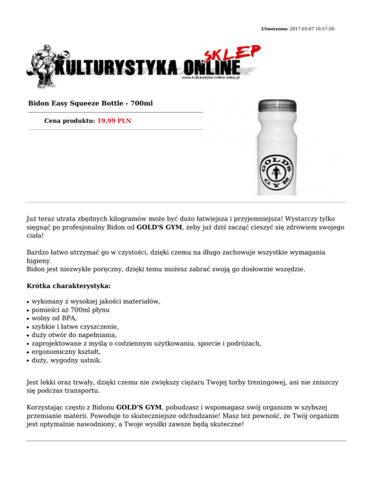 Utworzono: 2017-03-07 10:57:50 Bidon Easy Squeeze Bottle - 700ml Cena produktu: 19,99 PLN Już teraz utrata zbędnych kilogramów może być dużo łatwiejsza i przyjemniejsza! Wystarczy tylko sięgnąć po profesjonalny Bidon od GOLD'S GYM, żeby już dziś zacząć cieszyć się zdrowiem swojego ciała! Bardzo łatwo utrzymać go w czystości, dzięki czemu na długo zachowuje wszystkie wymagania higieny. Bidon jest niezwykle poręczny, dzięki temu możesz zabrać swoją go dosłownie wszędzie. Krótka charakterystyka: ● ● ● ● ● ● ● ● wykonany z wysokiej jakości materiałów, pomieści aż 700ml płynu wolny od BPA, szybkie i łatwe czyszczenie, duży otwór do napełniania, zaprojektowane z myślą o codziennym użytkowaniu, sporcie i podróżach, ergonomiczny kształt, duży, wygodny ustnik. Jest lekki oraz trwały, dzięki czemu nie zwiększy ciężaru Twojej torby treningowej, ani nie zniszczy się podczas transportu. Korzystając często z Bidonu GOLD'S GYM, pobudzasz i wspomagasz swój organizm w szybszej przemianie materii. Powoduje to skuteczniejsze odchudzanie! Masz też pewność, że Twój organizm jest optymalnie nawodniony, a Twoje wysiłki zawsze będą skuteczne! Adres: http://www.ko.sklep.pl/ Telefon: kom. 782 010 880 Email: [email protected]
