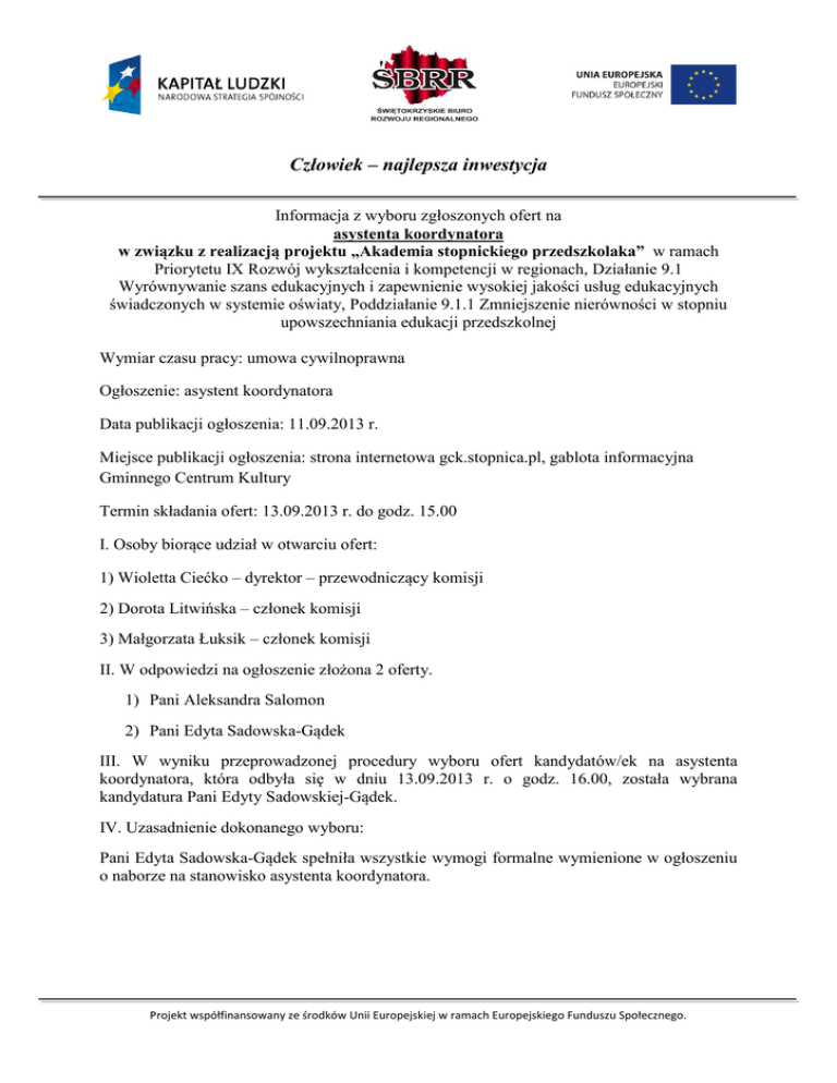 Człowiek – najlepsza inwestycja Informacja z wyboru zgłoszonych ofert na asystenta koordynatora w związku z realizacją projektu „Akademia stopnickiego przedszkolaka” w ramach Priorytetu IX Rozwój wykształcenia i kompetencji w regionach, Działanie 9.1 Wyrównywanie szans edukacyjnych i zapewnienie wysokiej jakości usług edukacyjnych świadczonych w systemie oświaty, Poddziałanie 9.1.1 Zmniejszenie nierówności w stopniu upowszechniania edukacji przedszkolnej Wymiar czasu pracy: umowa cywilnoprawna Ogłoszenie: asystent koordynatora Data publikacji ogłoszenia: 11.09.2013 r. Miejsce publikacji ogłoszenia: strona internetowa gck.stopnica.pl, gablota informacyjna Gminnego Centrum Kultury Termin składania ofert: 13.09.2013 r. do godz. 15.00 I. Osoby biorące udział w otwarciu ofert: 1) Wioletta Ciećko – dyrektor – przewodniczący komisji 2) Dorota Litwińska – członek komisji 3) Małgorzata Łuksik – członek komisji II. W odpowiedzi na ogłoszenie złożona 2 oferty. 1) Pani Aleksandra Salomon 2) Pani Edyta Sadowska-Gądek III. W wyniku przeprowadzonej procedury wyboru ofert kandydatów/ek na asystenta koordynatora, która odbyła się w dniu 13.09.2013 r. o godz. 16.00, została wybrana kandydatura Pani Edyty Sadowskiej-Gądek. IV. Uzasadnienie dokonanego wyboru: Pani Edyta Sadowska-Gądek spełniła wszystkie wymogi formalne wymienione w ogłoszeniu o naborze na stanowisko asystenta koordynatora. Projekt współfinansowany ze środków Unii Europejskiej w ramach Europejskiego Funduszu Społecznego.