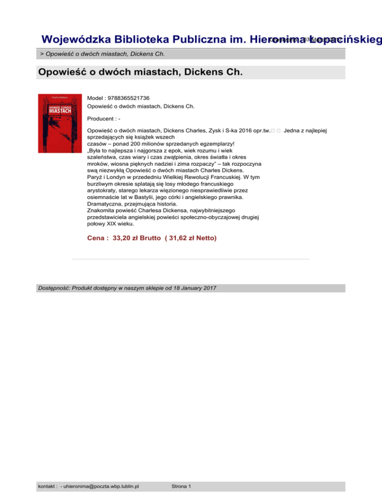 Utworzono : 07Łopacińskieg March 2017 Wojewódzka Biblioteka Publiczna im. Hieronima > Opowieść o dwóch miastach, Dickens Ch. Opowieść o dwóch miastach, Dickens Ch. Model : 9788365521736 Opowieść o dwóch miastach, Dickens Ch. Producent : Opowieść o dwóch miastach, Dickens Charles, Zysk i S-ka 2016 opr.tw.�� Jedna z najlepiej sprzedających się książek wszech czasów – ponad 200 milionów sprzedanych egzemplarzy! „Była to najlepsza i najgorsza z epok, wiek rozumu i wiek szaleństwa, czas wiary i czas zwątpienia, okres światła i okres mroków, wiosna pięknych nadziei i zima rozpaczy” – tak rozpoczyna swą niezwykłą Opowieść o dwóch miastach Charles Dickens. Paryż i Londyn w przededniu Wielkiej Rewolucji Francuskiej. W tym burzliwym okresie splatają się losy młodego francuskiego arystokraty, starego lekarza więzionego niesprawiedliwie przez osiemnaście lat w Bastylii, jego córki i angielskiego prawnika. Dramatyczna, przejmująca historia. Znakomita powieść Charlesa Dickensa, najwybitniejszego przedstawiciela angielskiej powieści społeczno-obyczajowej drugiej połowy XIX wieku. Cena : 33,20 zł Brutto ( 31,62 zł Netto) Dostępność: Produkt dostępny w naszym sklepie od 18 January 2017 kontakt : - [email protected] Strona 1