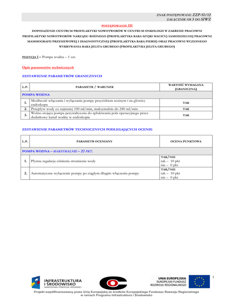 ZNAK POSTĘPOWANI: ZZP-50/12 ZAŁĄCZNIK NR 3 DO SIWZ POSTĘPOWANIE III DOPOSAśENIE CENTRUM PROFILAKTYKI NOWOTWORÓW W CENTRUM ONKOLOGII W ZAKRESIE PRACOWNI PROFILAKTYKI NOWOTWORÓW NARZĄDU RODNEGO (PROFILAKTYKA RAKA SZYJKI MACICY) SAMODZIELNEJ PRACOWNI MAMMOGRAFII PRZESIEWOWEJ I DIAGNOSTYCZNEJ (PROFILAKTYKA RAKA PIERSI) ORAZ PRACOWNI WCZESNEGO WYKRYWANIA RAKA JELITA GRUBEGO (PROFILAKTYKA JELITA GRUBEGO) POZYCJA 1 – Pompa wodna – 1 szt. Opis parametrów technicznych ZESTAWIENIE PARAMETRÓW GRANICZNYCH L.P. PARAMETR / WARUNEK WARTOŚĆ WYMAGANA (GRANICZNA) POMPA WODNA MoŜliwość włączania i wyłączania pompy przyciskiem noŜnym i na głowicy endoskopu 2. Przepływ wody co najmniej 100 ml/min, maksymalnie do 240 ml/min Wolno-stojąca pompa perystaltyczna do spłukiwania pola operacyjnego przez 3. dodatkowy kanał wodny w endoskopie 1. TAK TAK TAK ZESTAWIENIE PARAMETRÓW TECHNICZNYCH PODLEGAJĄCYCH OCENIE L.P. PARAMETR OCENIANY OCENA PUNKTOWA POMPA WODNA – MAKSYMALNIE – 20 PKT. TAK/NIE 1. Płynna regulacja ciśnienia strumienia wody 2. Automatyczne wyłączenie pompy po ciągłym długim włączeniu pompy tak – 10 pkt nie – 0 pkt TAK/NIE tak – 10 pkt nie – 0 pkt 1 Projekt współfinansowany przez Unię Europejską ze środków Europejskiego Funduszu Rozwoju Regionalnego w ramach Programu Infrastruktura i Środowisko ZNAK POSTĘPOWANI: ZZP-50/12 ZAŁĄCZNIK NR 3 DO SIWZ POZYCJA 2 – Automat do mycia i dezynfekcji endoskopów – 3 szt. Opis parametrów technicznych ZESTAWIENIE PARAMETRÓW GRANICZNYCH L.P. PARAMETR / WARUNEK WARTOŚĆ WYMAGANA (GRANICZNA) AUTOMAT DO MYCIA I DEZYNFEKCJI ENDOSKOPÓW 1. 2. 3. 4. 5. 6. 7. Automatyczna kontrola szczelności endoskopu przez cały proces mycia i dezynfekcji Automatyczne dozowanie środków chemicznych do mycia i dezynfekcji Proces dezynfekcji oparty na związkach zawierających kwas nadoctowy Temperatura procesu dezynfekcji nie wyŜsza niŜ 40ºC Jednoczesne mycie i dezynfekcja co najmniej dwóch endoskopów Informacja o konieczności okresowych przeglądów podawana przez myjnię Zasilanie elektryczne 230 V i 50 Hz oraz 400 V i 50 Hz TAK TAK TAK TAK TAK TAK TAK ZESTAWIENIE PARAMETRÓW TECHNICZNYCH PODLEGAJĄCYCH OCENIE L.P. PARAMETR OCENIANY OCENA PUNKTOWA AUTOMAT DO MYCIA I DEZYNFEKCJI ENDOSKOPÓW – MAKSYMALNIE – 30 PKT. TAK/NIE 1. 2. 3. 4. 5. 6. 7. 8. 9. 10. 11. Automatyczna samodezynfekcja myjni tak – 5 pkt nie – 0 pkt wartość najmniejsza – 2 pkt Czas trwania pełnego procesu z płukaniem wodą zdezynfekowaną i suszeniem nie wartość największa – 0 pkt dłuŜszy niŜ 40 min pozostałe proporcjonalnie TAK/NIE Jeden cykl pracy automatu obejmuje: mycie wstępne, mycie zasadnicze, dezynfekcję, tak – 3 pkt płukania i suszenie nie – 0 pkt TAK/NIE Dezynfekcja wody do kaŜdego etapu procesu mycia i dezynfekcji tak – 3 pkt nie – 0 pkt TAK/NIE Minimum dwa płukania końcowe po procesie dezynfekcji tak – 2 pkt nie – 0 pkt TAK/NIE Umieszczenie endoskopów w komorze mycia w dzielonych koszach w sposób tak – 2 pkt gwarantujący brak kontaktu pomiędzy mytymi endoskopami nie – 0 pkt TAK/NIE Chemiczne i biologiczne uzdatnianie wody przez myjnię tak – 2 pkt nie – 0 pkt TAK/NIE Kontrola przepływu środka dezynfekcyjnego przez kanały wewnętrzne mytych tak – 2 pkt endoskopów z informacją o niedroŜności poszczególnych kanałów nie – 0 pkt TAK/NIE Identyfikacja personelu obsługującego myjnię tak – 2 pkt nie – 0 pkt TAK/NIE Zasilanie wodą bieŜącą z instalacji bez konieczności instalowania dodatkowych tak – 3 pkt filtrów uzdatniających wodę nie – 0 pkt TAK/NIE Monitorowanie przebiegu procesu dezynfekcji tak – 1 pkt nie – 0 pkt 2 Projekt współfinansowany przez Unię Europejską ze środków Europejskiego Funduszu Rozwoju Regionalnego w ramach Programu Infrastruktura i Środowisko ZNAK POSTĘPOWANI: ZZP-50/12 ZAŁĄCZNIK NR 3 DO SIWZ TAK/NIE 12. Dokumentacja procesu dezynfekcji: wydruk tak – 3 pkt nie – 0 pkt Wykonawca musi oświadczyć, Ŝe oferowane, powyŜej wyspecyfikowane urządzenia, są kompletne i będą po zainstalowaniu i uruchomieniu gotowe do uŜycia bez Ŝadnych dodatkowych zakupów i inwestycji (poza materiałami eksploatacyjnymi). UWAGA (dotyczy parametrów/warunków granicznych): WyŜej wymienione parametry/warunki graniczne stanowią wymagania odcinające - niespełnienie nawet jednego z w/w wymagań spowoduje odrzucenie oferty. W przypadku wątpliwości Komisja zastrzega sobie prawo do weryfikacji parametrów oferowanych urządzeń na podstawie oryginalnych materiałów producenta. W przypadku braku moŜliwości dostarczenia przez wykonawcę fmi, parametry /warunki graniczne naleŜy potwierdzić stosownym oświadczeniem. W sytuacji braku jednoznacznego potwierdzenia w firmowych materiałach informacyjnych (fmi), bądź w oświadczeniu, wartości oferowanych parametrów, zamawiający ma prawo odrzucić ofertę. UWAGA (dotyczy parametrów/warunków ocenianych): OCENIE BĘDĄ PODLEGAŁY OFEROWANE WARUNKI PRZEKRACZAJĄCE WARTOŚCI GRANICZNE W przypadku wątpliwości Komisja zastrzega sobie prawo do weryfikacji parametrów oferowanych urządzeń na podstawie oryginalnych materiałów producenta. W przypadku braku moŜliwości dostarczenia przez wykonawcę fmi, parametry /warunki oceniane naleŜy potwierdzić stosownym oświadczeniem. W sytuacji braku jednoznacznego potwierdzenia w firmowych materiałach informacyjnych (fmi), bądź w oświadczeniu, wartości parametrów oferowanych, zamawiający ma prawo ocenić podany parametr oceną zero - podobnie jak w przypadku spełniania przez oferenta zaledwie parametru/warunku granicznego [wymagane wartości minimalne określono w tabelach]. OPIS SPOSOBU OCENY PARAMETRÓW TECHNICZNYCH- LICZENIE PUNKTÓW SZCZEGÓŁOWYCH W kryterium PARAMETRY TECHNICZNE, oceniane będą parametry określone w niniejszym załączniku. Oferta najkorzystniejsza moŜe uzyskać maksymalnie dla: POZ. 1 – 20 pkt, POZ. 2 – 30 pkt, i 