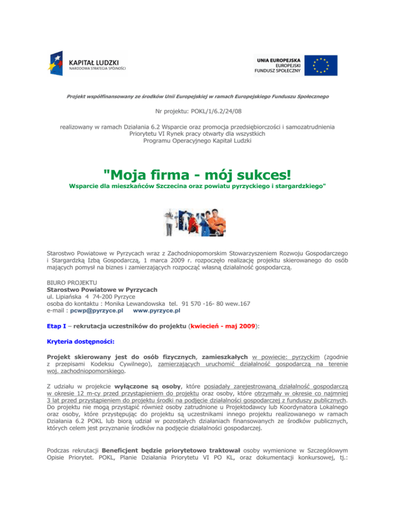 Projekt współfinansowany ze środków Unii Europejskiej w ramach Europejskiego Funduszu Społecznego Nr projektu: POKL/1/6.2/24/08 realizowany w ramach Działania 6.2 Wsparcie oraz promocja przedsiębiorczości i samozatrudnienia Priorytetu VI Rynek pracy otwarty dla wszystkich Programu Operacyjnego Kapitał Ludzki "Moja firma - mój sukces! Wsparcie dla mieszkańców Szczecina oraz powiatu pyrzyckiego i stargardzkiego" Starostwo Powiatowe w Pyrzycach wraz z Zachodniopomorskim Stowarzyszeniem Rozwoju Gospodarczego i Stargardzką Izbą Gospodarczą, 1 marca 2009 r. rozpoczęło realizację projektu skierowanego do osób mających pomysł na biznes i zamierzających rozpocząć własną działalność gospodarczą. BIURO PROJEKTU Starostwo Powiatowe w Pyrzycach ul. Lipiańska 4 74-200 Pyrzyce osoba do kontaktu : Monika Lewandowska tel. 91 570 -16- 80 wew.167 e-mail : [email protected] www.pyrzyce.pl Etap I – rekrutacja uczestników do projektu (kwiecień - maj 2009): Kryteria dostępności: Projekt skierowany jest do osób fizycznych, zamieszkałych w powiecie: pyrzyckim (zgodnie z przepisami Kodeksu Cywilnego), zamierzających uruchomić działalność gospodarczą na terenie woj. zachodniopomorskiego. Z udziału w projekcie wyłączone są osoby, które posiadały zarejestrowaną działalność gospodarczą w okresie 12 m-cy przed przystąpieniem do projektu oraz osoby, które otrzymały w okresie co najmniej 3 lat przed przystąpieniem do projektu środki na podjęcie działalności gospodarczej z funduszy publicznych. Do projektu nie mogą przystąpić równieŜ osoby zatrudnione u Projektodawcy lub Koordynatora Lokalnego oraz osoby, które przystępując do projektu są uczestnikami innego projektu realizowanego w ramach Działania 6.2 POKL lub biorą udział w pozostałych działaniach finansowanych ze środków publicznych, których celem jest przyznanie środków na podjęcie działalności gospodarczej. Podczas rekrutacji Beneficjent będzie priorytetowo traktował osoby wymienione w Szczegółowym Opisie Priorytet. POKL, Planie Działania Priorytetu VI PO KL, oraz dokumentacji konkursowej, tj.: - os. poniŜej 25 roku Ŝycia oraz osoby pracujące poza granicami kraju min.6 m-cy w okresie ostatniego 1 roku przed przystąpieniem do projektu – wsparciem objętych zostanie min.30% uczestników (spełnienie kryteriów strategicznych), - a takŜe: osoby bez zatrudnienia przez okres co najmniej kolejnych 12 m-cy w ciągu ostatnich 2 lat, kobiety (w tym zwłaszcza wchodzące po raz pierwszy i powracające na rynek pracy po przerwie związanej z urodzeniem i wychowaniem dzieci), osoby niepełnosprawne, osoby po 45 r. Ŝycia oraz osoby zamieszkałe w gminach wiejskich i miejsko – wiejskich oraz miast do 25 tys., zamierzające podjąć działalność w obszarach niezwiązanych z produkcją roślinną i/lub zwierzęcą. Rekrutacja uczestników do projektu będzie przebiegała w 3 etapach poprzedzonych akcją informacyjną i promocyjną w prasie lokalnej, Internecie oraz poprzez dystrybucję plakatów i ulotek. Następnie w lokalnym biurze projektu odbędzie się spotkanie informacyjne, na którym potencjalni beneficjenci pomocy zapoznają się z zasadami uczestnictwa, kryteriami dostępu, harmonogram em działań, a takŜe ze sposobem wypełniania formularza rekrutacyjnego. Spotkanie informacyjne: 3 kwietnia 2009 r. godz. 10.00 w Starostwie Powiatowym w Pyrzycach, ul. Lipiańska 4 sala 12 I etap rekrutacji – przyjmowanie formularzy rekrutacyjnych i weryfikacja ich pod względem formalnym II etap rekrutacji - badania za pomocą kwestionariuszy psychologicznych, sprawdzających zasadnicze redyspozycje do prowadzenia działalności gospodarczej. III etap rekrutacji - rozmowa kwalifikacyjna weryfikująca m. in. dane z formularzy rekrutacyjnych oraz testów psychologicznych. Ostatecznie wyłonionych zostanie 15 osób, uszeregowanych w kolejności malejącej liczby uzyskanych punktów. Pozostałe osoby będą umieszczone na tzw. „liście rezerwowej” i będą mogły wziąć udział w projekcie po ewentualnej rezygnacji uczestnika. Etap II – Szkolenie i doradztwo ( czerwiec - lipiec 2009 ) 1. Szkolenie: „ABC Biznesu z biznes planem” Liczba godzin lekcyjnych przypadająca na jednego uczestnika: 60h Nazwa modułu Liczba godzin szkoleniowych Moduł prawny 7 Moduł marketingowy 7 Moduł finansowo – księgowy Biznes plan 16 SUMA 60 30 2. Indywidualne doradztwo (pomoc w przygotowaniu wniosku o wsparcie finansowe) - po 8 godzin na uczestnika. Etap III – Wsparcie finansowe Po zakończeniu części szkoleniowo-doradczej Beneficjenci Ostateczni składają wnioski o przyznanie wsparcia finansowego. Po weryfikacji formalnej prawidłowo wypełnione wnioski trafiają na Komisję Oceny Wniosków, przeprowadzoną zgodnie z procedurą zawartą w Wytycznych Konkursowych (koniec lipca sierpień 2009). Po otrzymaniu informacji o wynikach oceny w przypadku moŜliwości przyznania dofinansowania, uczestnik projektu zobowiązany jest do zarejestrowania i rozpoczęcia działalności gospodarczej (lub załoŜenia spółdzielni/spółdzielni socjalnej), w terminie określonym przez Beneficjenta – tj. planowo we wrześniu 2009 r. Przyznanie wsparcia finansowego uczestnikom projektu polega na udzieleniu bezzwrotnego wsparcia kapitałowego przeznaczonego na sfinansowanie wydatków umoŜliwiających funkcjonowanie nowopowstałego przedsiębiorstwa. Pomoc przyznawana jest do wysokości 40 tys. zł (lub 20 tys. na osobę w przypadku spółdzielni lub spółdzielni socjalnej (o ile wszyscy udziałowcy są osobami, które rozpoczęły prowadzenie działalności w wyniku uczestnictwa w tym samym projekcie realizowanym w ramach przedmiotowego Działania). Etap IV – Wsparcie pomostowe Ten etap realizacji projektu polega na kontynuacji udzielania wsparcia tym z Beneficjentów pomocy, którzy dzięki skorzystaniu ze wsparcia szkoleniowo-doradczego (o charakterze podstawowym) w ramach pierwszej części projektu