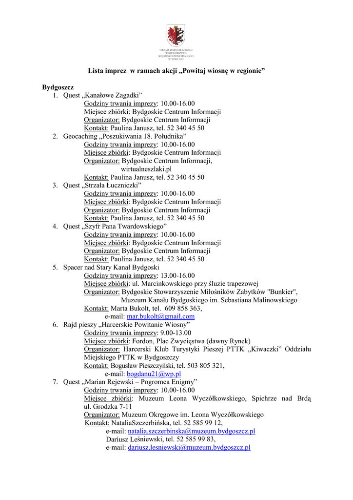 Lista imprez w ramach akcji „Powitaj wiosnę w regionie” Bydgoszcz 1. Quest „Kanałowe Zagadki” Godziny trwania imprezy: 10.00-16.00 Miejsce zbiórki: Bydgoskie Centrum Informacji Organizator: Bydgoskie Centrum Informacji Kontakt: Paulina Janusz, tel. 52 340 45 50 2. Geocaching „Poszukiwania 18. Południka” Godziny trwania imprezy: 10.00-16.00 Miejsce zbiórki: Bydgoskie Centrum Informacji Organizator: Bydgoskie Centrum Informacji, wirtualneszlaki.pl Kontakt: Paulina Janusz, tel. 52 340 45 50 3. Quest „Strzała Łuczniczki” Godziny trwania imprezy: 10.00-16.00 Miejsce zbiórki: Bydgoskie Centrum Informacji Organizator: Bydgoskie Centrum Informacji Kontakt: Paulina Janusz, tel. 52 340 45 50 4. Quest „Szyfr Pana Twardowskiego” Godziny trwania imprezy: 10.00-16.00 Miejsce zbiórki: Bydgoskie Centrum Informacji Organizator: Bydgoskie Centrum Informacji Kontakt: Paulina Janusz, tel. 52 340 45 50 5. Spacer nad Stary Kanał Bydgoski Godziny trwania imprezy: 13.00-16.00 Miejsce zbiórki: ul. Marcinkowskiego przy śluzie trapezowej Organizator: Bydgoskie Stowarzyszenie Miłośników Zabytków "Bunkier", Muzeum Kanału Bydgoskiego im. Sebastiana Malinowskiego Kontakt: Marta Bukolt, tel. 609 858 363, e-mail: [email protected] 6. Rajd pieszy „Harcerskie Powitanie Wiosny” Godziny trwania imprezy: 9.00-13.00 Miejsce zbiórki: Fordon, Plac Zwycięstwa (dawny Rynek) Organizator: Harcerski Klub Turystyki Pieszej PTTK „Kiwaczki” Oddziału Miejskiego PTTK w Bydgoszczy Kontakt: Bogusław Pieszczyński, tel. 503 805 321, e-mail: [email protected] 7. Quest „Marian Rejewski – Pogromca Enigmy” Godziny trwania imprezy: 10.00-16.00 Miejsce zbiórki: Muzeum Leona Wyczółkowskiego, Spichrze nad Brdą ul. Grodzka 7-11 Organizator: Muzeum Okręgowe im. Leona Wyczółkowskiego Kontakt: NataliaSzczerbińska, tel. 52 585 99 12, e-mail: [email protected] Dariusz Leśniewski, tel. 52 585 99 83, e-mail: [email protected] 8. Wycieczka Śródmiejska Godziny trwania imprezy: 11.00-14.00 Miejsce zbiórki: Pałac Młodzieży – Bydgoszcz ul. Jagiellońska Organizator: Oddział PTTK przy Klubie Inspektoratu Wsparcia Sił Zbrojnych w Bydgoszczy Kontakt: Lech Boczkowski, tel. 507 936 792 9. 24 Międzynarodowy Rajd Pieszy IVV Kwiaty Wiosny „Mak” Godziny trwania imprezy: 9.00–15.00 Miejsce zbiórki: Bydgoszcz, ul. Biwakowa (Pub Robert’s) Organizator: Klub Turystów Pieszych „Piętaszki” Oddziału Miejskiego PTTK w Bydgoszczy Kontakt: Wojciech Jagła, tel. 600163435, e-mail: [email protected] 10. Spacer ścieżką dydaktyczną: „Pomniki przyrody centrum Bydgoszczy” Godziny trwania imprezy: 10.00-12.00 Miejsce zbiórki: Zbiórka przed Pałacem Młodzieży przy ul. Jagiellońskiej 27 Organizator: Koło Przewodników Turystycznych i Pilotów Wycieczek Regionalnego Oddziału PTTK „Szlak Brdy” w Bydgoszczy Kontakt: Tadeusz Frymark, tel. 602 239 253, e-mail [email protected] Grudziądz 1. Zwiedzanie zakładu OPEC GRUDZIĄDZ Sp. z o.o. (OPEC BIO i OPEC INEKO) Godziny trwania imprezy: 10.00-13.00 Miejsce zbiórki: ul. Budowlanych 7 (OPEC GRUDZIĄDZ Sp. z o.o.) Organizator: Koło Przewodników PTTK w Grudziądzu, Urząd Miejski w Grudziądzu Kontakt: Maciej Wiśniewski, tel. 605194886 2. Zwiedzanie wieży Klimek Godziny trwania imprezy: 10.00-16.00 Miejsce zbiórki: Góra Zamkowa Organizator: Koło Przewodników PTTK w Grudziądzu, Urząd Miejski w Grudziądzu Kontakt: Jolanta Szulc, tel. 603791002 3. Rajd rowerowy „Powitanie wiosny” Godziny trwania imprezy: 10.00-14.00 Miejsce zbiórki: Rondo Skalskiego na os. Lotnisko Organizator: Miejski Ośrodek Rekreacji i Wypoczynku w Grudziądzu Kontakt: Michał Czepek, tel. 56 461 23 18, e-mail: [email protected] Inowrocław 1. Rajd pieszy i rowerowy z okazji Powitania Wiosny „MARZANNA 2015” Godziny trwania imprezy: 9.45-14.00 Miejsce zbiórki: Piesi: godz. 9.45, przystanek MPK w Mątwach Kolarze: godz. 11.00, przed siedzibą PTTK Inowrocław ul. Narutowicza 4. Organizator: Oddział PTTK w Inowrocławiu Kontakt: Andrzej Dargacz, tel.788044689 Markowice 1. Zwiedzanie zespołu kościelno-klasztornego w Markowicach, Muzeum Markowickiego Sanktuarium Godziny trwania imprezy: 10.00-12.00 Miejsce zbiórki: Plac przed wejściem głównym do kościoła Organizator: Parafia Rzymskokatolicka pw. Nawiedzenia w Markowicach Kontakt: Wiesława Eich, tel. 52 318 17 67, e-mail: [email protected] Pakość 1. Zwiedzanie Parku Kulturowego „Kalwaria Pakoska” Godziny trwania imprezy: 10.00 – 11.30 12.00 - 13.30 Miejsce zbiórki: Centrum Informacji Turystycznej w Pakości, ul. Barcińska 11 Organizator: Centrum Informacji Turystycznej w Pakości Kontakt: Karol Szatkowski, tel. 52 356 90 41, e-mail: [email protected] Brodnica 1. Rajd pieszy ”Powitanie wiosny w Brodnickim Parku Krajobrazowym” Godziny trwania imprezy: 9.45-15.15 Miejsce zbiórki: Dworzec autobusowy w Brodnicy Organizator: Klub Turystów Pieszych „Horyzont” z Solca Kujawskiego Kontakt: Łukasz Wojtecki, tel. 660 170 356, e-mail: [email protected] Strzelno 1. Rajd rowerowy „Powitanie wiosny” Godziny trwania imprezy: 11.00-14.00 Miejsce zbiórki: Plac Św. Wojciecha w Strzelnie Organizator: PTTK Strzelno im. Antoniego Słowińskiego Kontakt: Zbigniew Domański, tel. 667 262 303, e-mail: [email protected] Świecie 1. Spacer „Pierwszy Dzień Wiosny w Przechowie i Kozłowie nad Wdą” Godziny trwania imprezy: 10.00-14.00 Miejsce zbiórki: Świecie, Przechowo przy przedszkolu pod Łabędziem Organizator: Koło Przewodników PTTK Świecie Kontakt: Zbysław Budzyński, tel. 501306553, e-mail: [email protected] Toruń 1. Wycieczka rowerowa szlakiem ciekawostek osiedla „Na Skarpie”, Kaszczorka i Złotorii Godziny trwania imprezy: 10.00-12.00 Miejsce zbiórki: Akademia Języków Obcych Logos, ul. Przy Skarpie 10c NMP Organizator: Akademia Języków Obcych Logos Kontakt: Paweł Bukowski, tel. 605 560 361, e-mail: [email protected] 2. Gra miejska „Odkryj Toruń na wiosnę” Godziny t