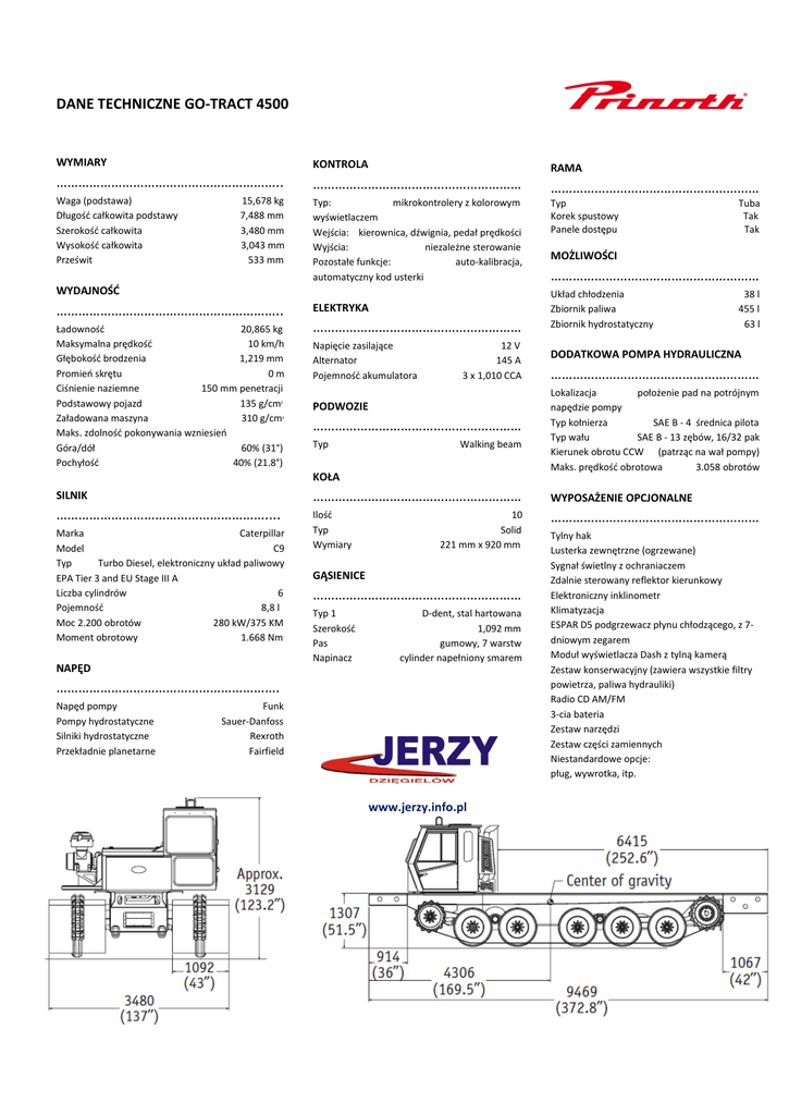 DANE TECHNICZNE GO-TRACT 4500 WYMIARY KONTROLA RAMA …………………………………………………….. ………………………………………………… Waga (podstawa) Długość całkowita podstawy Szerokość całkowita Wysokość całkowita Prześwit ………………………………………………… Typ: mikrokontrolery z kolorowym wyświetlaczem Wejścia: kierownica, dźwignia, pedał prędkości Wyjścia: niezależne sterowanie Pozostałe funkcje: auto-kalibracja, automatyczny kod usterki Typ Korek spustowy Panele dostępu 15,678 kg 7,488 mm 3,480 mm 3,043 mm 533 mm WYDAJNOŚĆ …………………………………………………….. ELEKTRYKA Ładowność 20,865 kg Maksymalna prędkość 10 km/h Głębokość brodzenia 1,219 mm Promień skrętu 0m Ciśnienie naziemne 150 mm penetracji Podstawowy pojazd 135 g/cm Załadowana maszyna 310 g/cm Maks. zdolność pokonywania wzniesień Góra/dół 60% (31°) Pochyłość 40% (21.8°) ………………………………………………… 2 2 Napięcie zasilające Alternator Pojemność akumulatora 12 V 145 A 3 x 1,010 CCA PODWOZIE ………………………………………………… Typ Walking beam KOŁA Tuba Tak Tak MOŻLIWOŚCI ………………………………………………… Układ chłodzenia Zbiornik paliwa Zbiornik hydrostatyczny 38 l 455 l 63 l DODATKOWA POMPA HYDRAULICZNA ………………………………………………… Lokalizacja położenie pad na potrójnym napędzie pompy Typ kołnierza SAE B - 4 średnica pilota Typ wału SAE B - 13 zębów, 16/32 pak Kierunek obrotu CCW (patrząc na wał pompy) Maks. prędkość obrotowa 3.058 obrotów SILNIK ………………………………………………… WYPOSAŻENIE OPCJONALNE ………………………………………………….... Ilość Typ Wymiary ………………………………………………… Marka Caterpillar Model C9 Typ Turbo Diesel, elektroniczny układ paliwowy EPA Tier 3 and EU Stage III A Liczba cylindrów 6 Pojemność 8,8 l Moc 2.200 obrotów 280 kW/375 KM Moment obrotowy 1.668 Nm NAPĘD 10 Solid 221 mm x 920 mm GĄSIENICE ………………………………………………… Typ 1 Szerokość Pas Napinacz D-dent, stal hartowana 1,092 mm gumowy, 7 warstw cylinder napełniony smarem ……………………………………………………. Napęd pompy Pompy hydrostatyczne Silniki hydrostatyczne Przekładnie planetarne Funk Sauer-Danfoss Rexroth Fairfield www.jerzy.info.pl Tylny hak Lusterka zewnętrzne (ogrzewane) Sygnał świetlny z ochraniaczem Zdalnie sterowany reflektor kierunkowy Elektroniczny inklinometr Klimatyzacja ESPAR D5 podgrzewacz płynu chłodzącego, z 7dniowym zegarem Moduł wyświetlacza Dash z tylną kamerą Zestaw konserwacyjny (zawiera wszystkie filtry powietrza, paliwa hydrauliki) Radio CD AM/FM 3-cia bateria Zestaw narzędzi Zestaw części zamiennych Niestandardowe opcje: pług, wywrotka, itp.