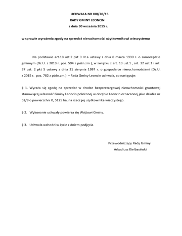 UCHWAŁA NR XIII/70/15 RADY GMINY LEONCIN z dnia 30 września 2015 r. w sprawie wyrażenia zgody na sprzedaż nieruchomości użytkownikowi wieczystemu Na podstawie art.18 ust.2 pkt 9 lit.a ustawy z dnia 8 marca 1990 r. o samorządzie gminnym (Dz.U. z 2013 r. poz. 594 z późn.zm.), w związku z art. 13 ust.1 , art. 32 ust.1 i art. 37 ust. 2 pkt 5 ustawy z dnia 21 sierpnia 1997 r. o gospodarce nieruchomościami (Dz.U. z 2015 r. poz. 782 z późn.zm.) – Rada Gminy Leoncin uchwala, co następuje: § 1. Wyraża się zgodę na sprzedaż w drodze bezprzetargowej nieruchomości gruntowej stanowiącej własność Gminy Leoncin położonej w obrębie Leoncin oznaczonej jako działka nr 52/8 o powierzchni 0, 5125 ha, na rzecz jej użytkownika wieczystego. § 2. Wykonanie uchwały powierza się Wójtowi Gminy. § 3. Uchwała wchodzi w życie z dniem podjęcia. Przewodniczący Rady Gminy Arkadiusz Kiełbasiński Uzasadnienie do uchwały Nr XIII/70/15 Rady Gminy Leoncin z dnia 30 września 2015 r. w sprawie wyrażenia zgody na sprzedaż nieruchomości użytkownikowi wieczystemu Nieruchomość objęta niniejszą uchwałą stanowi własność Gminy Leoncin i znajduje się w użytkowaniu wieczystym Pani Anny Teresy Szymaniak w 4/6 części, Pani Aldony Szymaniak w 1/6 części i Pani Sandry Szymaniak w 1/6 części. Przedmiotowa nieruchomość, zgodnie z obowiązującym miejscowym planem zagospodarowania przestrzennego wsi Leoncin, Wincentówek gm. Leoncin zatwierdzonym uchwałą Rady Gminy Leoncin XVIII/26/04 z dnia 16 czerwca 2004 r. ze zm. (opublikowany w Dz.Urz.Województwa Mazowieckiego nr 182, poz.4750 z dnia 23.07.2004 r. ze zm.) położona jest na terenie usług, składów i produkcji oznaczonym symbolem planu 45 U, S, P. W dniu oddania jej w użytkowanie wieczyste była terenem obsługi gospodarki polowej, ogrodniczej i zwierzęcej. Pani Anna Szymaniak, Pani Aldona Szymaniak i Pani Sandra Szymaniak wystąpiły z wnioskiem o przekształcenie prawa użytkowania wieczystego w prawo własności nieruchomości w oparciu o przepisy ustawy z dnia 29 lipca 2005 r. o przekształceniu prawa użytkowania wieczystego w prawo własności nieruchomości ( Dz.U. z 2012 r. poz.83, z późn.zm.), jednakże z uprawnienia tego nie skorzystały. Trybunał Konstytucyjny w dniu 10 marca 2015 r. orzekł o niezgodności art.1 ust.1 i ust. 3 wyżej wym. ustawy z dnia 29 lipca 2005 r. o przekształceniu prawa użytkowania wieczystego w prawo własności nieruchomości z art.2 i art.165 ust.1 Konstytucji Rzeczypospolitej Polskiej w zakresie podanym w sentencji wyroku. Orzeczenie Trybunału Konstytucyjnego skutkuje tym, że od dnia ogłoszenia wyroku w Dzienniku Ustaw tj. od dnia 17 marca 2015 r. nie jest możliwe przekształcenie prawa użytkowania wieczystego w prawo własności w odniesieniu do nieruchomości oddanych w użytkowanie wieczyste na cele usługowe. W tej sytuacji Pani Anna Szymaniak, Pani Aldona Szymaniak i Pani Sandra Szymaniak wystąpiły z wnioskiem o nabycie własności przedmiotowej nieruchomości i rozłożenie ceny sprzedaży na raty, w oparciu o przepisy ustawy z dnia 21 sierpnia 1997 r. o gospodarce nieruchomościami. Sprzedaż nieruchomości w tym trybie wymaga zgody Rady Gminy wyrażonej w formie uchwały. Zgodnie z art.32 ust.1 ustawy o gospodarce nieruchomościami nieruchomość gruntowa oddania w użytkowanie wieczyste może być sprzedana wyłącznie użytkownikowi wieczystemu.