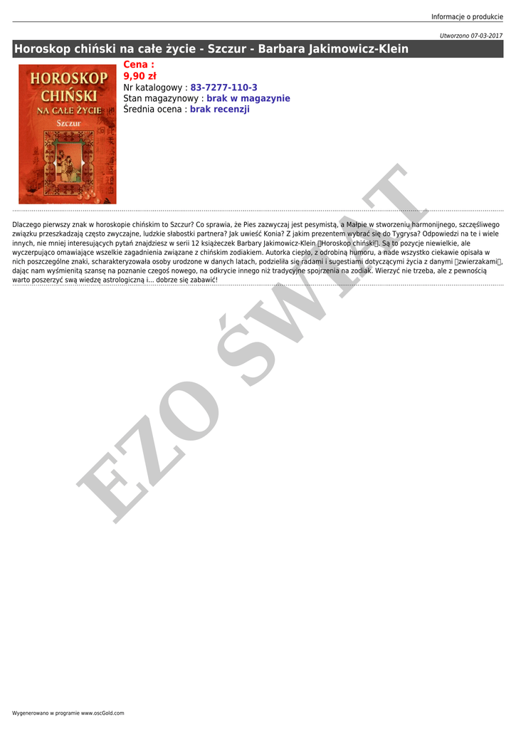 Informacje o produkcie Utworzono 07-03-2017 Horoskop chiński na całe życie - Szczur - Barbara Jakimowicz-Klein Cena : 9,90 zł IA T Nr katalogowy : 83-7277-110-3 Stan magazynowy : brak w magazynie Średnia ocena : brak recenzji EZ O ŚW Dlaczego pierwszy znak w horoskopie chińskim to Szczur? Co sprawia, że Pies zazwyczaj jest pesymistą, a Małpie w stworzeniu harmonijnego, szczęśliwego związku przeszkadzają często zwyczajne, ludzkie słabostki partnera? Jak uwieść Konia? Z jakim prezentem wybrać się do Tygrysa? Odpowiedzi na te i wiele innych, nie mniej interesujących pytań znajdziesz w serii 12 książeczek Barbary Jakimowicz-Klein Horoskop chiński. Są to pozycje niewielkie, ale wyczerpująco omawiające wszelkie zagadnienia związane z chińskim zodiakiem. Autorka ciepło, z odrobiną humoru, a nade wszystko ciekawie opisała w nich poszczególne znaki, scharakteryzowała osoby urodzone w danych latach, podzieliła się radami i sugestiami dotyczącymi życia z danymi zwierzakami, dając nam wyśmienitą szansę na poznanie czegoś nowego, na odkrycie innego niż tradycyjne spojrzenia na zodiak. Wierzyć nie trzeba, ale z pewnością warto poszerzyć swą wiedzę astrologiczną i... dobrze się zabawić! Wygenerowano w programie www.oscGold.com