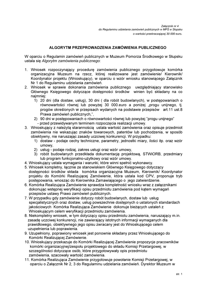 Załącznik nr 4 do Regulaminu udzielania zamówień publicznych w MPŚ w Słupsku o wartości przekraczającej 30 000 euro. ALGORYTM PRZEPROWADZENIA ZAMÓWIENIA PUBLICZNEGO W oparciu o Regulamin zamówień publicznych w Muzeum Pomorza Środkowego w Słupsku ustala się Algorytm zamówienia publicznego: 1. Wniosek rozpoczynający procedurę zamówienia publicznego przygotowuje komórka organizacyjna Muzeum na rzecz, której realizowane jest zamówienie/ Kierownik/ Koordynator projektu (Wnioskujący), w oparciu o wzór wniosku stanowiącego Załącznik Nr 1 do Regulaminu udzielania zamówień. 2. Wniosek w sprawie dokonania zamówienia publicznego uwzględniający stanowisko Głównego Księgowego dotyczące dostępności środków winien być składany na co najmniej: 1) 20 dni (dla dostaw, usług), 30 dni ( dla robót budowlanych), w postępowaniach o równowartości równej lub powyżej 30 000.euro a poniżej „progu unijnego, tj. progów określonych w przepisach wydanych na podstawie przepisów art.11 ust.8 Prawa zamówień publicznych,”, 2) 90 dni w postępowaniach o równowartości równej lub powyżej ”progu unijnego” - przed przewidywanym terminem rozpoczęcia realizacji umowy. 3. Wnioskujący z należytą starannością ustala wartość zamówienia oraz opisuje przedmiot zamówienia nie wskazując znaków towarowych, patentów lub pochodzenia, w sposób obiektywny, nie naruszając zasady uczciwej konkurencji. W przypadku: 1) dostaw - podaje cechy techniczne, parametry, jednostki miary, ilości itp. oraz wzór umowy, 2) usług - podaje rodzaj, zakres usługi oraz wzór umowy, 3) robót budowlanych przedkłada dokumentację projektową, STWiORB, przedmiary lub program funkcjonalno-użytkowy oraz wzór umowy. 4. Wnioskujący ustala wymagania i warunki, które winni spełnić wykonawcy. 5. Wniosek kompletny, łącznie ze stanowiskiem Głównego Księgowego dotyczący dostępności środków składa komórka organizacyjna Muzeum, Kierownik/ Koordynator projektu do Komórki Realizującej Zamówienie, która ustala kod CPV, proponuje tryb postępowania, wnosząc do Kierownika Zamawiającego o jego zatwierdzenie. 6. Komórka Realizująca Zamówienie sprawdza kompletność wniosku wraz z załącznikami dokonując wstępnej weryfikacji opisu przedmiotu zamówienia pod kątem wymagań przepisów ustawy Prawo zamówień publicznych. 7. W przypadku gdy zamówienie dotyczy robót budowlanych, dostaw lub usług specjalistycznych oraz dostaw, usług powszechnie dostępnych o ustalonych standardach jakościowych Komórka Realizująca Zamówienie dokonuje bieżących ustaleń z Wnioskującym celem weryfikacji przedmiotu zamówienia. 8. Niekompletny wniosek, w tym dotyczący opisu przedmiotu zamówienia, naruszający m.in. zasadę uczciwej konkurencji, nie zawierający istotnych informacji wymaganych dla prawidłowego, obiektywnego jego opisu zwracany jest do Wnioskującego celem uzupełnienia lub poprawienia. 9. Uzupełniony, poprawiony wniosek jest ponownie składany przez Wnioskującego do Komórki Realizującej Zamówienie. 10. Wnioskujący przekazuje do Komórki Realizującej Zamówienie propozycje pracowników komórki organizacyjnej/zespołu projektowego do składu Komisji Przetargowej, w szczególności dotyczące osób, które przygotowywały opis przedmiotu zamówienia, szacowały wartość zamówienia. 11. Komórka Realizująca Zamówienie przygotowuje powołanie Komisji Przetargowej, w oparciu o Załącznik Nr 2, 3 do Regulaminu udzielania zamówień. Dyrektor Muzeum w str. 1 oparciu o kwoty progowe wynikające z pełnomocnictw powołuje Komisję Przetargową. 12. Komisja Przetargowa przygotowuje kompletną specyfikację istotnych warunków zamówienia (siwz), uzyskując akceptację (parafę) Radcy Prawnego wzoru umowy albo istotnych dla stron postanowień, które zostaną wprowadzane do treści zawieranej umowy i przekazuje siwz wraz z załącznikami do zatwierdzenia. Dyrektor Muzeum zatwierdza siwz. 13. Komórka Realizująca Zamówienie ogłasza postępowanie lub zaprasza do postępowania o zamówienie publiczne, prowadząc procedurę od momentu wszczęcia postępowania do jego zakończenia wg zasad określonych w ustawie Pzp. 14. Komórka Realizująca Zamówienie po konsultacji z Wnioskującym, przygotowuje odpowiedź na zadawane przez Wykonawców w trakcie postępowania pytania, dotyczące kwestii merytorycznych, w szczególności opisu przedmiotu zamówienia, stawianych wykonawcom warunków, wymagań. 15. Opracowane odpowiedzi analizuje Komisja Przetargowa, przedkładając do zatwierdzenia odpowiednio Dyrektorowi Muzeum. 16. Komisja Przetargowa jako zespół pomocniczy Kierownika Zamawiającego przedstawia propozycje wykluczania wykonawcy, odrzucenia oferty, wyboru najkorzystniejszej oferty jak również występuje z wnioskiem o unieważnienie postępowania. Dyrektor Muzeum w zatwierdza dokonane czynności Komisji Przetargowej. 17. Komórka Realizująca Zamówienie przygotowuje do podpisania umowę w sprawie zamówienia publicznego. Umowę opiniuje Radca Prawny a kontrasygnuje Główny Księgowy. Umowę podpisuje Dyrektor Muzeum. 18. Komórka Realizująca Zamówienie dokumentuje postępowanie o zmówienie publiczne przedkładając do akceptacji protokół z postępowania. Protokół z postępowania zatwierdza odpowiednio Dyrektor Muzeum. 19. Umowę w sprawie zamówienia publicznego Komórka Realizująca Zamówienie przekazuje do Działu Głównego Księgowego a drugi egzemplarz umowy Komórka Realizująca Zamówienie przekazuje wykonawcy. W dokumentacji Komórki Realizującej Zamówienie pozostaje kopia umowy. str. 2 Wersja graficzna Załącznika Nr 4: Wniosek przygotowuje Komórka organizacyjna Muzeum na rzecz, której realizowane jest zamówienie/ Kierownik/ Koordynator projektu (Wnioskujący). Wniosek w sprawie dokonania zamówienia publicznego powyżej 30 tys. euro uwzględniający stanowisko Głównego Księgowego dotyczące dostępności środków: - w postępowaniach