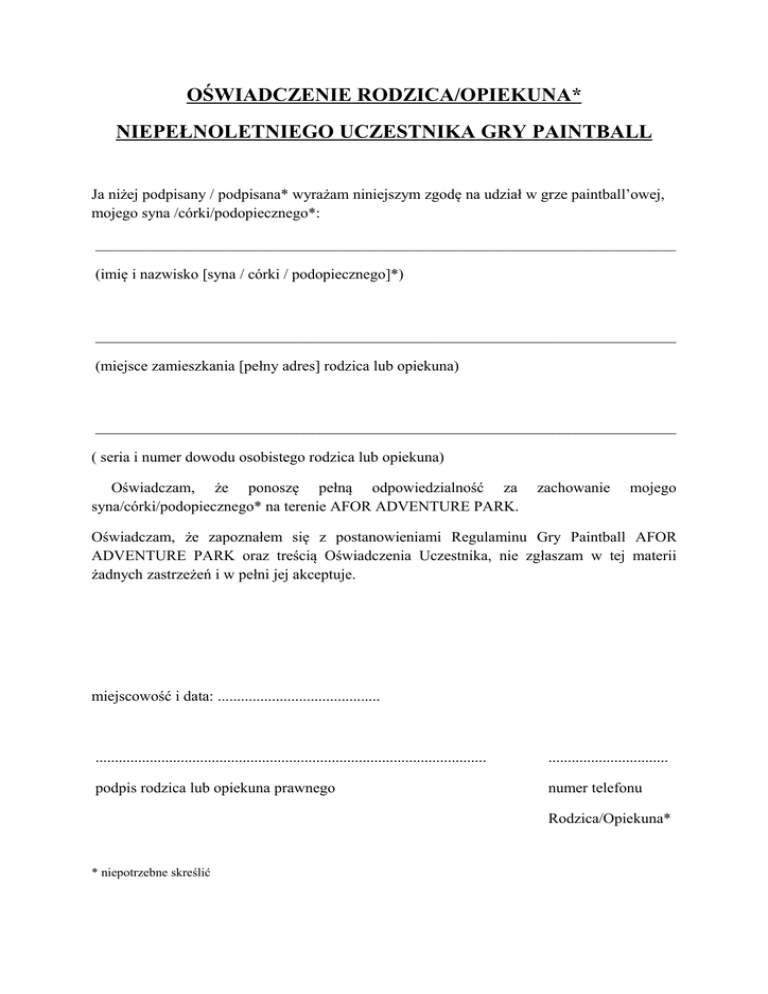 OŚWIADCZENIE RODZICA/OPIEKUNA* NIEPEŁNOLETNIEGO UCZESTNIKA GRY PAINTBALL Ja niżej podpisany / podpisana* wyrażam niniejszym zgodę na udział w grze paintball’owej, mojego syna /córki/podopiecznego*: ___________________________________________________________________________ (imię i nazwisko [syna / córki / podopiecznego]*) ___________________________________________________________________________ (miejsce zamieszkania [pełny adres] rodzica lub opiekuna) ___________________________________________________________________________ ( seria i numer dowodu osobistego rodzica lub opiekuna) Oświadczam, że ponoszę pełną odpowiedzialność za syna/córki/podopiecznego* na terenie AFOR ADVENTURE PARK. zachowanie mojego Oświadczam, że zapoznałem się z postanowieniami Regulaminu Gry Paintball AFOR ADVENTURE PARK oraz treścią Oświadczenia Uczestnika, nie zgłaszam w tej materii żadnych zastrzeżeń i w pełni jej akceptuje. miejscowość i data: .......................................... ..................................................................................................... ............................... podpis rodzica lub opiekuna prawnego numer telefonu Rodzica/Opiekuna* * niepotrzebne skreślić