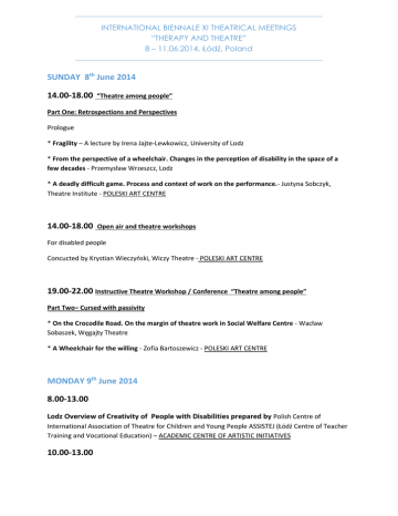 INTERNATIONAL BIENNALE XI THEATRICAL MEETINGS “THERAPY AND THEATRE” 8 – 11.06.2014, Łódź, Poland SUNDAY 8th June 2014 14.00-18.00 “Theatre among people” Part One: Retrospections and Perspectives Prologue * Fragility – A lecture by Irena Jajte-Lewkowicz, University of Lodz * From the perspective of a wheelchair. Changes in the perception of disability in the space of a few decades - Przemysław Wrzeszcz, Lodz * A deadly difficult game. Process and context of work on the performance.- Justyna Sobczyk, Theatre Institute - POLESKI ART CENTRE 14.00-18.00 Open air and theatre workshops For disabled people Concucted by Krystian Wieczyński, Wiczy Theatre - POLESKI ART CENTRE 19.00-22.00 Instructive Theatre Workshop / Conference “Theatre among people” Part Two– Cursed with passivity * On the Crocodile Road. On the margin of theatre work in Social Welfare Centre - Wacław Sobaszek, Węgajty Theatre * A Wheelchair for the willing - Zofia Bartoszewicz - POLESKI ART CENTRE MONDAY 9th June 2014 8.00-13.00 Lodz Overview of Creativity of People with Disabilities prepared by Polish Centre of International Association of Theatre for Children and Young People ASSISTEJ (Łódź Centre of Teacher Training and Vocational Education) – ACADEMIC CENTRE OF ARTISTIC INITIATIVES 10.00-13.00 INTERNATIONAL BIENNALE XI THEATRICAL MEETINGS “THERAPY AND THEATRE” 8 – 11.06.2014, Łódź, Poland THEATRE WORKSHOPS for Instructors (registration needed) Conducted by Monika Weber and Andreas Hoffman, Germany - POLESKI ART CENTRE 10.00 - 11.00 Inauguration of International Biennale XIth Theatrical Meetings “Theatre and Therapy” Vernissage: Painting by Agnieszka Sapińska Painting by Tadeusz Głowala Promotion of the book: Performance as an event and experience by Irena Jajte Lewkowicz, Joanna Michałowska and Agnieszka Piasecka - NOWY THEATRE (Foyer) 11.00 - 11.45 “Confession in the Wood” - Teatroterapia Lubelska, Poland. Dir. Maria Pietrusza- Budzyńska - NOWY THEATRE (Large Stage) 12.00 - 12.40 “Billy the Invalid” - TeatrTrochę Inny, Kraków, Poland. Dir.Jan Molicki - NOWY THEATRE ( Small Stage) 14.00 - 16.00 Debating Film Club 1: a projection of films documenting the artistic actions - Agnieszka Piasecka and Magdalena Lubeńczuk - ACADEMIC CENTRE OF ARTISTIC INITIATIVES 16.00 - 16.50 “Fast Forward!” - Dance Theatre KUK, Austria. Dir. Sandra Hoffer - NOWY THEATRE (LARGE STAGE) 17.00 - 17.45 “Something is rotten in the State of Denmark” - Compagnia dei Girasoli, Italy. Dir. Marta Mantovani, Andrea Carnevale - NOWY THEATRE (Small Stage) 19.00-22.00 Instructive Theatre Workshop / Conference “Theatre among people” Part Three - Transgressions *Midsummer Night Dream, Ośrodek Terapii Odwykowej Uzależnień, Toruń *A way of Icon. Experience from Iconwriting workshops - Małgorzata Dżygadło-Niklaus, Schola of Węgajty Theatre INTERNATIONAL BIENNALE XI THEATRICAL MEETINGS “THERAPY AND THEATRE” 8 – 11.06.2014, Łódź, Poland * Body Transgressions - Zofia Bartoszewicz and Team - ACADEMIC CENTRE OF ARTISTIC INITIATIVES 10.00-13.00 Theatre Workshops for Instructors (Registration required) Conducted by Sandra Hofstoetter, Dance Theatre KUK, Austria - ACADEMIC CENTRE OF ARTISTIC INITIATIVES 10.00 - 10.30 “Sleeping Beauty” - WTZ in Korytniki, Poland. Dir. Joanna Derdziak - NOWY THEATRE (Small Stage) 10.30 - 10.45 “Sign and Gesture - I hear with my Heart” - Deaf Club, Olecko, Poland. Dir. Artur Sobolewski - NOWY THEATRE (Small Stage) 11.00 - 11.35 “Charms” - Theatre of Jazan University, Saudi Arabia. Dir. Salem Bahumysh NOWY THEATRE (Large Stage) 12.00 - 12.30 “Chinese Fairytales” - Wonderland, Skierniewice, Poland. Dir. Anna Rogala NOWY THEATRE (Small Stage) 12.30 - 12.40 “Does the Music have to be serious?” - Teatr Zdarzeń Niecodziennych, Nowe Miszewo, Poland - NOWY THEATRE (Small Stage) Dir. Anna Pietrzak and Anna Wiktorowska 14.00 - 17.00 Theatre Workshops for Instructors (registration required) - Yigael Filler and Offer Dahary, Si’im Theatre, Szekel, Israel - NOWY THEATRE (Small Stage) 14.00 - 17.00 Debating Film Club 2 - a projection of films documenting the artistic actions - Weronika Fibich, Marta Giers-Sanecka, Agnieszka Piasecka - ACADEMIC CENTRE OF ARTISTIC INITIATIVES 17.00 - 18.15 “Appearence”, Zet-6 Theatre, Belgium, Dir. Jeroen Baeyens - NOWY THEATRE (Large Stage) 19.00-22.00 Instructive Theatre Workshop / Conference “Theatre among people” - ACADEMIC CENTRE OF ARTISTIC INITIATIVES INTERNATIONAL BIENNALE XI THEATRICAL MEETINGS “THERAPY AND THEATRE” 8 – 11.06.2014, Łódź, Poland Accompanying Event: 19.00 * Nie/Widomi - SOSW nr 6, Lodz and Chorea Theatre - Dir. Magdalena Paszkiewicz, Tomasz Rodowicz and Adam Biedrzycki - FABRYKA SZTUKI 9.00 - 9.20 “Countess of Cosel”, Pearls of Life Theatre, Kodeń, Poland. Dir. Beata Kupryś and Marta Pomorska - NOWY THEATRE (Large Stage) 10.00 -10.20 “I am” - Teatr Od Nowa, Płock Dir. Anna Bańka - Słowikowska and Radosław Witkowski - NOWY THEATRE (Small Stage) 10.00 - 12.00 Seniors in Action from the project: “Bursting Paper Bags, Towarzystwo Inicjatyw Twórczych “ę” by Romualda Thomsen - ACADEMIC CENTRE OF ARTISTIC INITIATIVES 10.45 - 11.15 “Bógot” - Mimo Tego Pan Tego Nima Theatre, Gdańsk Dir. Barbara Ziemkiewicz and Adam Stawicki - NOWY THEATRE (Large Stage) 11.30 - 13.00 Wszędomni - presentation. - Chorea Theatre, Łódź - ACADEMIC CENTRE OF ARTISTIC INITIATIVES 11.45 - 12.10 “There’s something, something is not - monodrama duet” - Ubogi Relacji Theatre, Sopot. - NOWY THEATRE (Small Stage) Dir. Jacek Spica 12.30 - 12.50 “A Conversation with a Stone” - Euforion Theatre, Wrocław, Poland Dir. Anna Jędryczka-Hamera - NOWY THEATRE (Large Stage) 14.00 - 17.00 Theatre Among People, Epilogue *A voice of critics. Between art and art therapy - - Ph.D. Karolina Leszczyńska * World Cafe Meeting - Erdmute Sobaszek, Węgajty Theatre - ACADEMIC CENTRE OF ARTISTIC 