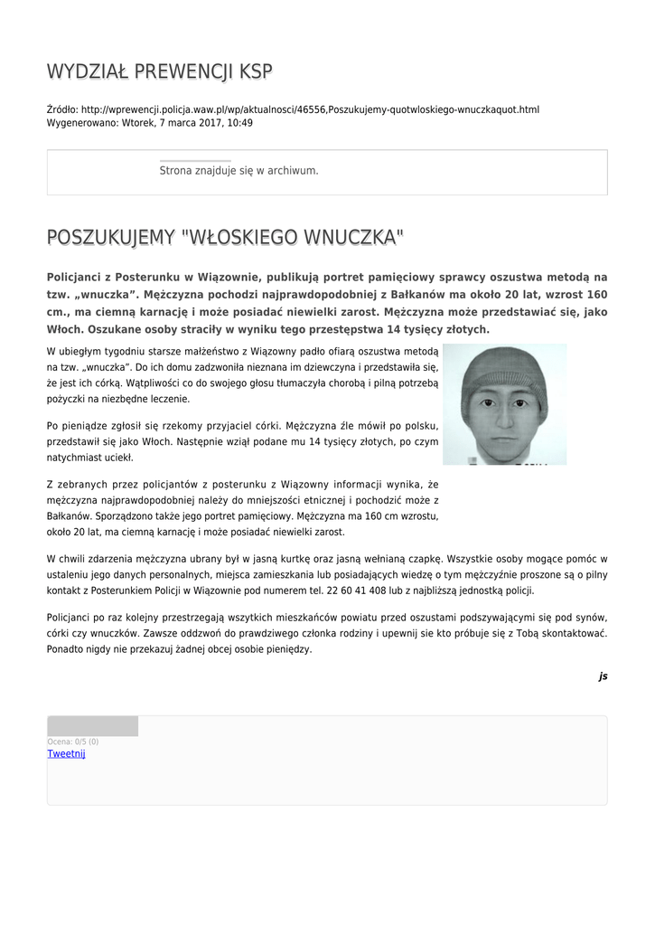 WYDZIAŁ PREWENCJI KSP Źródło: http://wprewencji.policja.waw.pl/wp/aktualnosci/46556,Poszukujemy-quotwloskiego-wnuczkaquot.html Wygenerowano: Wtorek, 7 marca 2017, 10:49 Strona znajduje się w archiwum. POSZUKUJEMY "WŁOSKIEGO WNUCZKA" Policjanci z Posterunku w Wiązownie, publikują portret pamięciowy sprawcy oszustwa metodą na tzw. „wnuczka”. Mężczyzna pochodzi najprawdopodobniej z Bałkanów ma około 20 lat, wzrost 160 cm., ma ciemną karnację i może posiadać niewielki zarost. Mężczyzna może przedstawiać się, jako Włoch. Oszukane osoby straciły w wyniku tego przestępstwa 14 tysięcy złotych. W ubiegłym tygodniu starsze małżeństwo z Wiązowny padło ofiarą oszustwa metodą na tzw. „wnuczka”. Do ich domu zadzwoniła nieznana im dziewczyna i przedstawiła się, że jest ich córką. Wątpliwości co do swojego głosu tłumaczyła chorobą i pilną potrzebą pożyczki na niezbędne leczenie. Po pieniądze zgłosił się rzekomy przyjaciel córki. Mężczyzna źle mówił po polsku, przedstawił się jako Włoch. Następnie wziął podane mu 14 tysięcy złotych, po czym natychmiast uciekł. Z zebranych przez policjantów z posterunku z Wiązowny informacji wynika, że mężczyzna najprawdopodobniej należy do mniejszości etnicznej i pochodzić może z Bałkanów. Sporządzono także jego portret pamięciowy. Mężczyzna ma 160 cm wzrostu, około 20 lat, ma ciemną karnację i może posiadać niewielki zarost. W chwili zdarzenia mężczyzna ubrany był w jasną kurtkę oraz jasną wełnianą czapkę. Wszystkie osoby mogące pomóc w ustaleniu jego danych personalnych, miejsca zamieszkania lub posiadających wiedzę o tym mężczyźnie proszone są o pilny kontakt z Posterunkiem Policji w Wiązownie pod numerem tel. 22 60 41 408 lub z najbliższą jednostką policji. Policjanci po raz kolejny przestrzegają wszytkich mieszkańców powiatu przed oszustami podszywającymi się pod synów, córki czy wnuczków. Zawsze oddzwoń do prawdziwego członka rodziny i upewnij sie kto próbuje się z Tobą skontaktować. Ponadto nigdy nie przekazuj żadnej obcej osobie pieniędzy. js Ocena: 0/5 (0) Tweetnij
