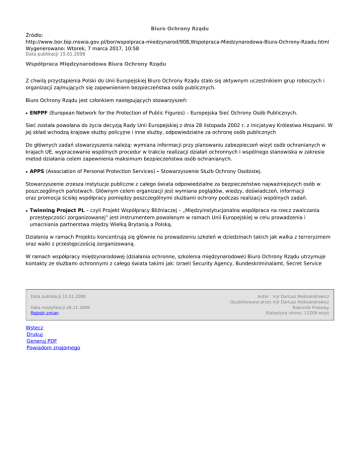 Biuro Ochrony Rządu Źródło: http://www.bor.bip.mswia.gov.pl/bor/wspolpraca-miedzynarod/908,Wspolpraca-Miedzynarodowa-Biura-Ochrony-Rzadu.html Wygenerowano: Wtorek, 7 marca 2017, 10:58 Data publikacji 15.01.2008 Współpraca Międzynarodowa Biura Ochrony Rządu Z chwilą przystąpienia Polski do Unii Europejskiej Biuro Ochrony Rządu stało się aktywnym uczestnikiem grup roboczych i organizacji zajmujących się zapewnieniem bezpieczeństwa osób publicznych. Biuro Ochrony Rządu jest członkiem następujących stowarzyszeń: ● ENPPF (European Network for the Protection of Public Figures) – Europejska Sieć Ochrony Osób Publicznych. Sieć została powołana do życia decyzją Rady Unii Europejskiej z dnia 28 listopada 2002 r. z inicjatywy Królestwa Hiszpanii. W jej skład wchodzą krajowe służby policyjne i inne służby, odpowiedzialne za ochronę osób publicznych Do głównych zadań stowarzyszenia należą: wymiana informacji przy planowaniu zabezpieczeń wizyt osób ochranianych w krajach UE, wypracowanie wspólnych procedur w trakcie realizacji działań ochronnych i wspólnego stanowiska w zakresie metod działania celem zapewnienia maksimum bezpieczeństwa osób ochranianych. ● APPS (Association of Personal Protection Services) – Stowarzyszenie Służb Ochrony Osobistej. Stowarzyszenie zrzesza instytucje publiczne z całego świata odpowiedzialne za bezpieczeństwo najważniejszych osób w poszczególnych państwach. Głównym celem organizacji jest wymiana poglądów, wiedzy, doświadczeń, informacji oraz promocja ścisłej współpracy pomiędzy poszczególnymi służbami ochrony podczas realizacji wspólnych zadań. ● Twinning Project PL – czyli Projekt Współpracy Bliźniaczej – „Międzyinstytucjonalna współpraca na rzecz zwalczania przestępczości zorganizowanej” jest instrumentem powołanym w ramach Unii Europejskiej w celu prowadzenia i umacniania partnerstwa między Wielką Brytanią a Polską. Działania w ramach Projektu koncentrują się głównie na prowadzeniu szkoleń w dziedzinach takich jak walka z terroryzmem oraz walki z przestępczością zorganizowaną. W ramach współpracy międzynarodowej (działania ochronne, szkolenia międzynarodowe) Biuro Ochrony Rządu utrzymuje kontakty ze służbami ochronnymi z całego świata takimi jak: Izraeli Security Agency, Bundeskriminalamt, Secret Service Data publikacji 15.01.2008 Data modyfikacji 26.11.2009 Rejestr zmian Wstecz Drukuj Generuj PDF Powiadom znajomego Autor : mjr Dariusz Aleksandrowicz Opublikowane przez mjr Dariusz Aleksandrowicz Rzecznik Prasowy Statystyka strony: 12209 wizyt