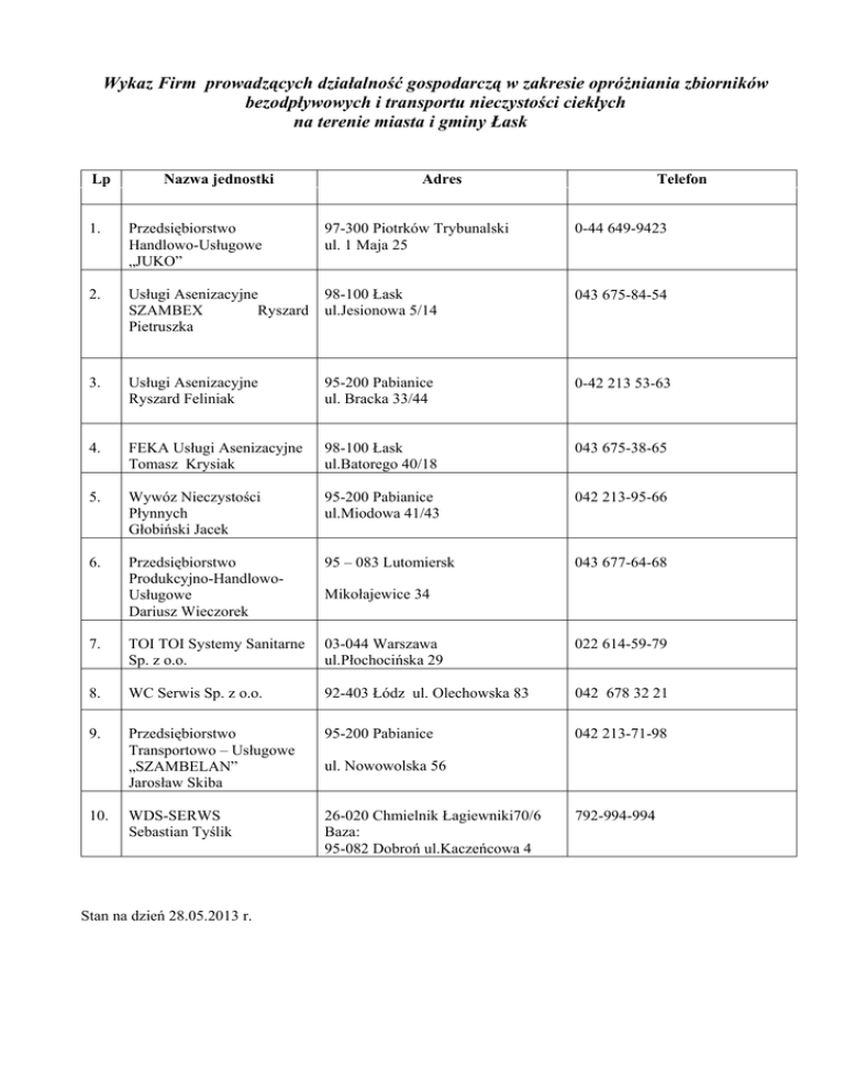 Wykaz Firm prowadzących działalność gospodarczą w zakresie opróżniania zbiorników bezodpływowych i transportu nieczystości ciekłych na terenie miasta i gminy Łask Lp Nazwa jednostki Adres Telefon 1. Przedsiębiorstwo Handlowo-Usługowe „JUKO” 97-300 Piotrków Trybunalski ul. 1 Maja 25 0-44 649-9423 2. Usługi Asenizacyjne SZAMBEX Ryszard Pietruszka 98-100 Łask ul.Jesionowa 5/14 043 675-84-54 3. Usługi Asenizacyjne Ryszard Feliniak 95-200 Pabianice ul. Bracka 33/44 0-42 213 53-63 4. FEKA Usługi Asenizacyjne Tomasz Krysiak 98-100 Łask ul.Batorego 40/18 043 675-38-65 5. Wywóz Nieczystości Płynnych Głobiński Jacek 95-200 Pabianice ul.Miodowa 41/43 042 213-95-66 6. Przedsiębiorstwo Produkcyjno-HandlowoUsługowe Dariusz Wieczorek 95 – 083 Lutomiersk 043 677-64-68 7. TOI TOI Systemy Sanitarne Sp. z o.o. 03-044 Warszawa ul.Płochocińska 29 022 614-59-79 8. WC Serwis Sp. z o.o. 92-403 Łódz ul. Olechowska 83 042 678 32 21 9. Przedsiębiorstwo Transportowo – Usługowe „SZAMBELAN” Jarosław Skiba 95-200 Pabianice 042 213-71-98 WDS-SERWS Sebastian Tyślik 26-020 Chmielnik Łagiewniki70/6 Baza: 95-082 Dobroń ul.Kaczeńcowa 4 10. Stan na dzień 28.05.2013 r. Mikołajewice 34 ul. Nowowolska 56 792-994-994
