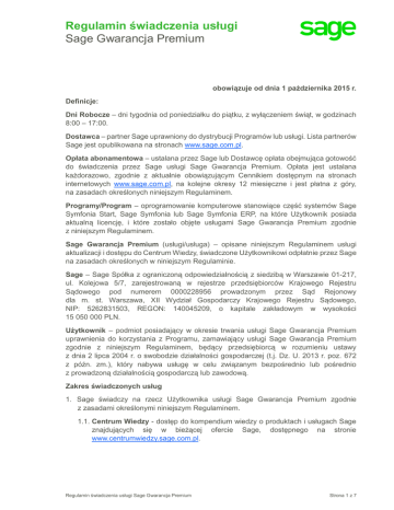 Regulamin świadczenia usługi Sage Gwarancja Premium obowiązuje od dnia 1 października 2015 r. Definicje: Dni Robocze – dni tygodnia od poniedziałku do piątku, z wyłączeniem świąt, w godzinach 8:00 – 17:00. Dostawca – partner Sage uprawniony do dystrybucji Programów lub usługi. Lista partnerów Sage jest opublikowana na stronach www.sage.com.pl. Opłata abonamentowa – ustalana przez Sage lub Dostawcę opłata obejmująca gotowość do świadczenia przez Sage usługi Sage Gwarancja Premium. Opłata jest ustalana każdorazowo, zgodnie z aktualnie obowiązującym Cennikiem dostępnym na stronach internetowych www.sage.com.pl, na kolejne okresy 12 miesięczne i jest płatna z góry, na zasadach określonych niniejszym Regulaminem. Programy/Program – oprogramowanie komputerowe stanowiące część systemów Sage Symfonia Start, Sage Symfonia lub Sage Symfonia ERP, na które Użytkownik posiada aktualną licencję, i które zostało objęte usługami Sage Gwarancja Premium zgodnie z niniejszym Regulaminem. Sage Gwarancja Premium (usługi/usługa) – opisane niniejszym Regulaminem usługi aktualizacji i dostępu do Centrum Wiedzy, świadczone Użytkownikowi odpłatnie przez Sage na zasadach określonych w niniejszym Regulaminie. Sage – Sage Spółka z ograniczoną odpowiedzialnością z siedzibą w Warszawie 01-217, ul. Kolejowa 5/7, zarejestrowaną w rejestrze przedsiębiorców Krajowego Rejestru Sądowego pod numerem 0000228956 prowadzonym przez Sąd Rejonowy dla m. st. Warszawa, XII Wydział Gospodarczy Krajowego Rejestru Sądowego, NIP: 5262831503, REGON: 140045209, o kapitale zakładowym w wysokości 15 050 000 PLN. Użytkownik – podmiot posiadający w okresie trwania usługi Sage Gwarancja Premium uprawnienia do korzystania z Programu, zamawiający usługi Sage Gwarancja Premium zgodnie z niniejszym Regulaminem, będący przedsiębiorcą w rozumieniu ustawy z dnia 2 lipca 2004 r. o swobodzie działalności gospodarczej (t.j. Dz. U. 2013 r. poz. 672 z późn. zm.), który nabywa usługę w celu związanym bezpośrednio lub pośrednio z prowadzoną działalnością gospodarczą lub zawodową. Zakres świadczonych usług 1. Sage świadczy na rzecz Użytkownika usługi Sage Gwarancja Premium zgodnie z zasadami określonymi niniejszym Regulaminem. 1.1. Centrum Wiedzy - dostęp do kompendium wiedzy o produktach i usługach Sage znajdujących się w bieżącej ofercie Sage, dostępnego na stronie www.centrumwiedzy.sage.com.pl. Regulamin świadczenia usługi Sage Gwarancja Premium Strona 1 z 7 1.2. Usługi aktualizacji Programów w ramach Sage Gwarancja Premium obejmują, w zakresie zgodnym z zakupioną wersją Sage Gwarancja Premium następujące elementy: 1.2.1. Zmiany w Programach wynikające ze zmian w przepisach prawnych polegające na dostosowaniu Programów do obowiązujących przepisów prawa, zgodnie z założeniami przyjętymi przez Sage; 1.2.2. Unowocześnienia techniczne – rozwój Programów pod kątem podwyższenia technicznej jakości pracy Programów, zgodnie z założeniami przyjętymi przez Sage; 1.2.3. Zmiany funkcjonalne w Programach, polegające na rozbudowie i wprowadzeniu nowych funkcji do Programów, zgodnie z założeniami przyjętymi przez Sage; 1.2.4. Informowanie Użytkownika – dostarczanie na wskazany przez Użytkownika adres e-mail informacji o nowych rozwiązaniach prawnych i technicznych dotyczących Programów oraz o dostępności najnowszych wersji Programów; 1.2.5. Dostarczanie najnowszej wersji – udostępnienie do samodzielnego pobrania i instalacji przez Użytkownika (instalacja może nastąpić bezpłatnie za pomocą informacji przesłanych drogą elektroniczną na wskazany przez Użytkownika adres e-mail lub odpłatnie na życzenie Użytkownika w formie dostarczanej płyty CD) najnowszych dostępnych dla ogółu Użytkowników wersji Programów objętych usługą Sage Gwarancja Premium, zgodnie z zakupioną usługą Sage Gwarancja Premium do zakupionej wersji Programu. 1.3. Usługa Sage Gwarancja Premium może obejmować inne elementy nie wymienione w niniejszym Regulaminie usług Sage Gwarancja Premium wyszczególnione i opisane w Cenniku usług dostępnym na stronach www.sage.com.pl. 2. Sage określa listę Programów objętych usługami Sage Gwarancja Premium. Lista ta zawarta jest w aktualnie obowiązującym Cenniku: - opublikowanym na stronach internetowych Sage (www.sage.com.pl) w przypadku Programów Sage Symfonia Start i Sage Symfonia; - dostępnym w sieci sprzedaży Sage w przypadku systemu Sage Symfonia ERP Usługami Sage Gwarancja Premium objęte są aktualne wersje Programów opublikowane na stronach internetowych Sage www.sage.com.pl. 3. W celu zakupu usługi Sage Gwarancja Premium w przypadku posiadania przez Użytkownika wersji Programu spoza listy wymienionej w punkcie 2, Użytkownik powinien wcześniej dokonać zakupu odpowiedniej aktualnej wersji Programu. Wszelkich informacji w tym zakresie udziela sieć sprzedaży Sage. 4. Usługi Sage Gwarancja Premium są zamawiane na okres 12.-stu miesięcy, zgodnie z treścią punktu 9 niniejszego Regulaminu i przedłużane zgodnie z treścią punktu 26 niniejszego Regulaminu. 5. Sage nie ponosi odpowiedzialności za jakiekolwiek czynności podjęte przez Użytkownika w odniesieniu do oprogramowania w oparciu o informacje uzyskane poprzez Centrum Wiedzy. Informacje zawarte w Centrum Wiedzy nie stanowią oferty Regulamin świadczenia usługi Sage Gwarancja Podstawowa Strona 2 z 7 w rozumieniu Kodeksu cywilnego. Udostępnienie Użytkownikowi Centrum Wiedzy nie ma na celu świadczenia usług wsparcia technicznego. Ogólne zasady świadczenia usług 6. Sage dostarcza Użytkownikowi informacje związane ze świadczonymi usługami wyłącznie drogą mailową na wskazane przez Użytkownika adresy e-mail. Użytkownik jest zobowiązany do podania adresów e-mail do kontaktu oraz do dokonywania aktualizacji tych adresów w trakcie trwania usługi. Sage nie odpowiada za niedostarc