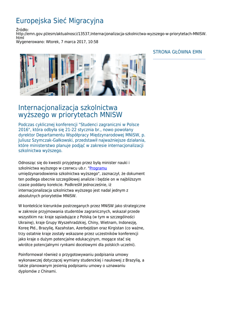 Europejska Sieć Migracyjna Źródło: http://emn.gov.pl/esm/aktualnosci/13537,Internacjonalizacja-szkolnictwa-wyzszego-w-priorytetach-MNISW. html Wygenerowano: Wtorek, 7 marca 2017, 10:58 STRONA GŁÓWNA EMN Internacjonalizacja szkolnictwa wyższego w priorytetach MNISW Podczas cyklicznej konferencji "Studenci zagraniczni w Polsce 2016", która odbyła się 21-22 stycznia br., nowo powołany dyrektor Departamentu Współpracy Międzynarodowej MNiSW, p. Juliusz Szymczak-Gałkowski, przedstawił najważniejsze działania, które ministerstwo planuje podjąć w zakresie internacjonalizacji szkolnictwa wyższego. Odnosząc się do kwestii przyjętego przez byłą minister nauki i szkolnictwa wyższego w czerwcu ub.r. "Programu umiędzynarodowienia szkolnictwa wyższego", zaznaczył, że dokument ten podlega obecnie szczegółowej analizie i będzie on w najbliższym czasie poddany korekcie. Podkreślił jednocześnie, iż internacjonalizacja szkolnictwa wyższego jest nadal jednym z absolutnych priorytetów MNiSW. W kontekście kierunków postrzeganych przez MNiSW jako strategiczne w zakresie przyjmowania studentów zagranicznych, wskazał przede wszystkim na: kraje sąsiadujące z Polską (w tym w szczególności Ukrainę), kraje Grupy Wyszehradzkiej, Chiny, Wietnam, Indonezję, Koreę Płd., Brazylię, Kazahstan, Azerbejdżan oraz Kirgistan (co ważne, trzy ostatnie kraje zostały wskazane przez uczestników konferencji jako kraje o dużym potencjalne edukacyjnym, mogące stać się wkrótce potencjalnymi rynkami docelowymi dla polskich uczelni). Poinformował również o przygotowywaniu podpisania umowy wykonawczej dotyczącej wymiany studenckiej i naukowej z Brazylią, a także planowanym jesienią podpisaniu umowy o uznawaniu dyplomów z Chinami.