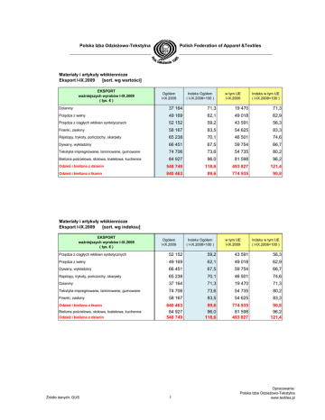 Polska Izba OdzieŜowo-Tekstylna Polish Federation of Apparel &Textiles Materiały i artykuły włókiennicze Eksport I-IX.2009 [sort. wg wartości] EKSPORT waŜniejszych wyrobów I-IX.2009 ( tys. € ) Ogółem I-IX.2009 Indeks Ogółem ( I-IX.2008=100 ) w tym UE I-IX.2009 Indeks w tym UE ( I-IX.2008=100 ) Dzianiny 37 164 71,3 19 470 71,3 Przędza z wełny 49 169 62,1 49 018 62,9 Przędza z ciągłych włókien syntetycznych 52 152 59,2 43 591 56,3 Firanki, zasłony 58 167 83,5 54 625 83,3 Rajstopy, trykoty, pończochy, skarpety 65 238 70,1 46 501 74,6 Dywany, wykładziny 66 451 67,5 59 754 66,7 Tekstylia impregnowane, laminowane, gumowane 74 706 73,6 54 735 80,2 Bielizna pościelowa, stołowa, toaletowa, kuchenna 84 927 96,0 81 598 96,2 OdzieŜ i bielizna z dzianin 548 749 118,6 493 827 121,4 OdzieŜ i bielizna z tkanin 840 463 89,6 774 935 90,8 Materiały i artykuły włókiennicze Eksport I-IX.2009 [sort. wg indeksu] EKSPORT waŜniejszych wyrobów I-IX.2009 ( tys. € ) Ogółem I-IX.2009 Indeks Ogółem ( I-IX.2008=100 ) w tym UE I-IX.2009 Indeks w tym UE ( I-IX.2008=100 ) Przędza z ciągłych włókien syntetycznych 52 152 59,2 43 591 56,3 Przędza z wełny 49 169 62,1 49 018 62,9 Dywany, wykładziny 66 451 67,5 59 754 66,7 Rajstopy, trykoty, pończochy, skarpety 65 238 70,1 46 501 74,6 Dzianiny 37 164 71,3 19 470 71,3 Tekstylia impregnowane, laminowane, gumowane 74 706 73,6 54 735 80,2 Firanki, zasłony OdzieŜ i bielizna z tkanin Bielizna pościelowa, stołowa, toaletowa, kuchenna OdzieŜ i bielizna z dzianin Źródło danych: GUS 58 167 83,5 54 625 83,3 840 463 84 927 548 749 89,6 96,0 118,6 774 935 81 598 493 827 90,8 96,2 121,4 1 Opracowanie: Polska Izba OdzieŜowo-Tekstylna www.textiles.pl Eksport waŜniejszych towarów I-IX.2009 [ tys € ] 840 463 OdzieŜ i bielizna z tkanin 548 749 OdzieŜ i bielizna z dzianin Bielizna pościelowa, stołowa, toaletowa, kuchenna 84 927 Tekstylia impregnowane, laminowane, gumowane 74 706 Dywany, wykładziny 66 451 Rajstopy, trykoty, pończochy, skarpety 65 238 Firanki, zasłony 58 167 Przędza z ciągłych włókien syntetycznych 52 152 Przędza z wełny 49 169 Dzianiny 37 164 Indeks eksportu waŜniejszych towarów I-IX.2009 [I-IX.2008=100;tys.€ ] 118,6 OdzieŜ i bielizna z dzianin Bielizna pościelowa, stołowa,… 96,0 OdzieŜ i bielizna z tkanin 89,6 Firanki, zasłony 83,5 Tekstylia impregnowane,… 73,6 71,3 Dzianiny Rajstopy, trykoty, pończochy,… 70,1 Dywany, wykładziny 67,5 Przędza z wełny 62,1 Przędza z ciągłych włókien… 59,2 0 Źródło danych: GUS 100 2 Opracowanie: Polska Izba OdzieŜowo-Tekstylna www.textiles.pl