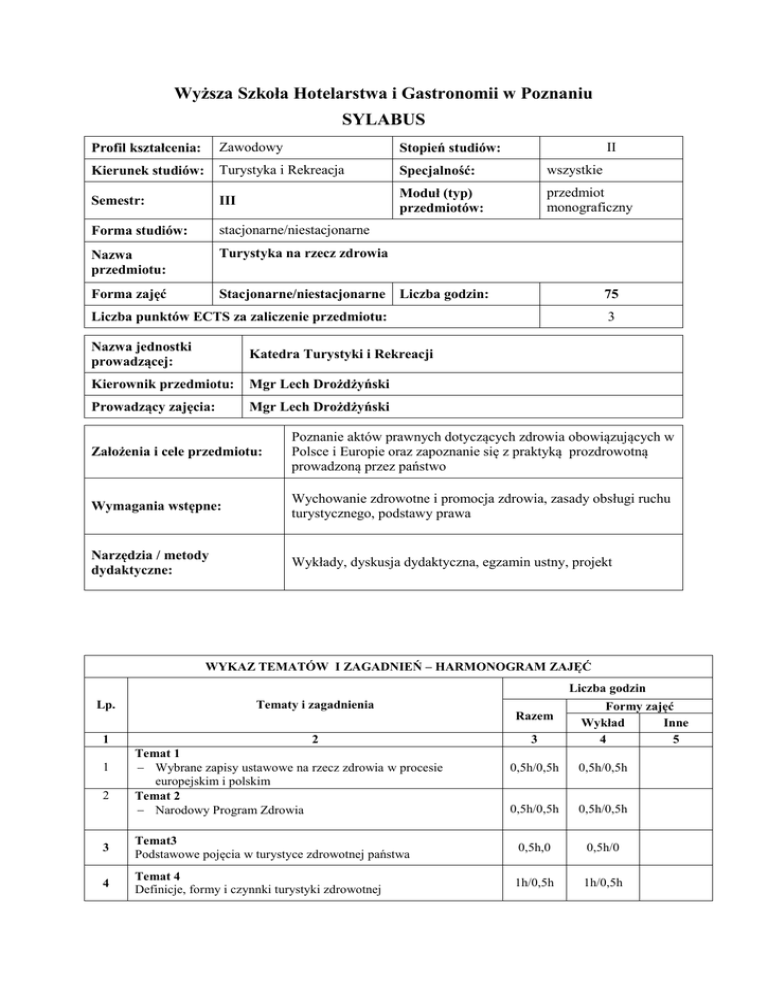 Wyższa Szkoła Hotelarstwa i Gastronomii w Poznaniu SYLABUS
