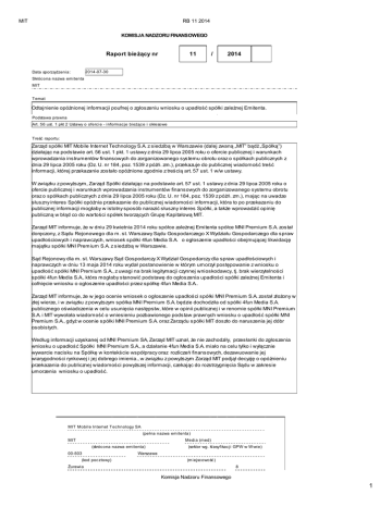 MIT RB 11 2014 KOMISJA NADZORU FINANSOWEGO Raport bie żący nr 11 / 2014 2014-07-30 Data sporządzenia: Skrócona nazwa emitenta MIT Temat Odtajnienie opóźnionej informacji poufnej o zgłoszeniu wniosku o upadłość spółki zależnej Emitenta. Podstawa prawna Art. 56 ust. 1 pkt 2 Ustawy o ofercie - informacje bieżące i okresowe Treść raportu: Zarząd spółki MIT Mobile Internet Technology S.A. z siedzibą w Warszawie (dalej zwaną „MIT” bądź „Spółką”) działając na podstawie art. 56 ust. 1 pkt. 1 ustawy z dnia 29 lipca 2005 roku o ofercie publicznej i warunkach wprowadzania instrumentów finansowych do zorganizowanego systemu obrotu oraz o spółkach publicznych z dnia 29 lipca 2005 roku (Dz. U. nr 184, poz. 1539 z późń. zm.), przekazuje do publicznej wiadomość treść informacji, której przekazanie zostało opóźnione zgodnie z treścią art. 57 ust. 1 w/w ustawy. W związku z powyższym, Zarząd Spółki działając na podstawie art. 57 ust. 1 ustawy z dnia 29 lipca 2005 roku o ofercie publicznej i warunkach wprowadzania instrumentów finansowych do zorganizowanego systemu obrotu oraz o spółkach publicznych z dnia 29 lipca 2005 roku (Dz. U. nr 184, poz. 1539 z późń. zm.), mając na uwadze słuszny interes Spółki opóźnia przekazanie do publicznej wiadomości informacji, która to po przekazaniu do publicznej informacji mogłaby w istotny sposób narazić słuszny interes Spółki, a także wprowadzić opinię publiczną w błąd co do wartości spółek tworzących Grupę Kapitałową MIT. Zarząd MIT informuje, że w dniu 29 kwietnia 2014 roku spółce zależnej Emitenta spółce MNI Premium S.A. został doręczony, z Sądu Rejonowego dla m. st. Warszawy Sądu Gospodarczego X Wydziału Gospodarczego dla spraw upadłościowych i naprawczych, wniosek spółki 4fun Media S.A. o ogłoszenie upadłości obejmującej likwidację majątku spółki MNI Premium S.A. z siedzibą w Warszawie. Sąd Rejonowy dla m. st. Warszawy Sąd Gospodarczy X Wydział Gospodarczy dla spraw upadłościowych i naprawczych w dniu 13 maja 2014 roku wydał postanowienie w którym umorzył postępowanie z wniosku o upadłość spółki MNI Premium S.A., z uwagi na brak legitymacji czynnej wnioskodawcy, tj. brak wierzytelności spółki 4fun Media S.A., która mogłaby stanowić podstawę do ogłoszenia upadłości spółki zależnej Emitenta i cofnięcie wniosku o ogłoszenie upadłości przez spółkę 4fun Media S.A.. Zarząd MIT informuje, że w jego ocenie wniosek o ogłoszenie upadłości spółki MNI Premium S.A. został złożony w złej wierze, i w związku z powyższym spółka MNI Premium S.A. będzie dochodziła od spółki 4fun Media S.A. publicznego oświadczenia w celu usunięcia następstw, które w opinii publicznej i w renomie spółki MNI Premium S.A. i MIT wywołała wiadomość o wniesieniu pozbawionego podstaw prawnych wniosku o upadłość spółki MNI Premium S.A., gdyż w ocenie spółki MNI Premium S.A. oraz Zarządu spółki MIT doszło do naruszenia jej dóbr osobistych. Według informacji uzyskanej od MNI Premium SA, Zarząd MIT uznał, że nie zachodziły, przesłanki do zgłoszenia wniosku o upadłość Spółki MNI Premium S.A., a działanie 4fun Media S.A. miało na celu tylko i wyłącznie wywarcie nacisku na Spółkę w kontekście współpracy oraz rozliczeń finansowych, dezawuowanie jej wiarygodności rynkowej i jej dobrego imienia., w związku z powyższym Zarząd MIT podjął decyzję o opóźnieniu przekazania do publicznej wiadomości powyższej informacji, czekając do rozstrzygnięcia Sądu w zakres ie umorzenia wniosku o upadłość. MIT Mobi le Internet Technology SA (pełna nazwa emi tenta) MIT Media (med) (skrócona nazwa emitenta) 00-503 (kod pocztowy) (sektor wg. klasyfikacji GPW w W-wie) Warszawa (miejscowość ) Żurawia 8 Komisja Nadzoru Finansowego 1 MIT RB 11 2014 (ulic a) (numer) 22 483 11 00 22 483 11 01 (tel efon) (fax) mi [email protected] www.mi tsa.pl (e-mail) (www) 526-021-09-84 011525843 (NIP) (REGON) PODPISY OSÓB REPREZENTUJĄCYCH SPÓŁKĘ Data Imię i Nazwisko Stanowisko/Funkcja 2014-07-30 Leszek Kułak Prezes Zarządu Podpis Komisja Nadzoru Finansowego 2
