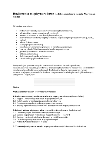 Rozliczenia międzynarodowe Redakcja naukowa Danuta MarciniakNeider W książce omówiono: podstawowe zasady rozliczeń w obrocie międzynarodowym, infrastrukturę międzynarodowych rozliczeń, transakcje wiązane w handlu międzynarodowym, nieuwarunkowane formy zapłaty w handlu zagranicznym (polecenie wypłaty, czek), weksel, inkaso dokumentowe, akredytywę dokumentową, przesłanki wyboru formy płatności w handlu zagranicznym, kredyty jako źródło finansowania handlu zagranicznego, gwarancje bankowe i ubezpieczeniowe, faktoring i forfaiting, funkcjonowanie rynku walutowego, zarządzanie ryzykiem kursowym. Podręcznik jest przeznaczony dla studentów kierunków: handel zagraniczny, międzynarodowe stosunki gospodarcze, finanse międzynarodowe, bankowość. Może też być przydatny dla praktyków prowadzących działalność w handlu zagranicznym (w tym wewnątrzunijnym), pracowników banków z departamentów obsługi transakcji handlowych, spedytorów i logistyków. Wstęp Wykaz skrótów i nazw stosowanych w tekście 1. Podstawowe zasady rozliczeń w obrocie międzynarodowym (Iwona Sobol) 1.1. Pojęcie i klasyfikacja rozliczeń międzynarodowych 1.2. Rola banków w rozliczeniach międzynarodowych 1.3. Podstawowe regulacje polskiego prawa dewizowego 1.4. Zasady wymienialności walut oraz znaczenie walut międzynarodowych 2. Infrastruktura międzynarodowych rozliczeń (Aleksandra Ruchniewicz) 2.1. Charakterystyka rozrachunku międzybankowego 2.2. System wspierający rozrachunki międzybankowe — SWIFT 2.3. Systemy rozliczeń międzybankowych w Unii Europejskiej 2.4. Globalne systemy rozliczeń międzybankowych 2.5. Jednolity Obszar Płatności w Euro 3. Transakcje wiązane w handlu międzynarodowym (Aleksandra Ruchniewicz) 3.1. Istota transakcji wiązanych 3.2. Rodzaje transakcji wiązanych 3.3. Rola banków w handlu wiązanym 4. Nieuwarunkowane formy zapłaty w handlu zagranicznym (Danuta Marciniak-Neider) 4.1. Charakterystyka płatności w rachunku otwartym 4.2. Polecenie wypłaty 4.3. Pojęcie i elementy czeku 4.4. Rodzaje czeków 4.5. Realizacja czeków wystawionych za granicą 4.6. Płatność czekiem przez importera 5. Weksel w handlu zagranicznym (Danuta Marciniak-Neider) 5.1. Pojęcie, elementy i rodzaje weksli 5.2. Uczestnicy stosunku wekslowego 5.3. Wykorzystanie weksla w handlu zagranicznym 6. Inkaso dokumentowe (Danuta Marciniak-Neider) 6.1. Pojęcie i rodzaje inkasa 6.2. Przebieg inkasa 6.3. Dokumenty w inkasie 6.4. Inkaso z punktu widzenia eksportera i importera 6.5. Jednolite zasady dotyczące inkasa 7. Charakterystyka akredytywy dokumentowej (Danuta Marciniak-Neider) 7.1. Istota akredytywy 7.2. Struktura akredytywy 7.3. Rodzaje akredytyw 7.4. Akredytywa z punktu widzenia eksportera i importera 7.5. Koszty akredytywy 8. Akredytywa dokumentowa w świetle regulacji Międzynarodowej Izby Handlowej (Danuta Marciniak-Neider) 8.1. Jednolite zwyczaje i praktyka dotyczące akredytyw dokumentowych 8.2. Międzynarodowe standardy praktyki bankowej dotyczące badania dokumentów w ramach akredytywy dokumentowej 8.3. eUCP — Suplement dla elektronicznej prezentacji 8.4. Jednolite reguły dotyczące międzybankowych rembursów 8.5. Reguły polubownego rozstrzygania sporów 8.6. Regulacje dotyczące akredytyw zabezpieczających 9. Dokumenty w akredytywie (Danuta Marciniak-Neider) 9.1. Ogólne zasady sprawdzania dokumentów przez banki 9.2. Faktura handlowa 9.3. Dokumenty transportowe 9.4. Dokumenty wystawiane przez spedytorów 9.5. Weksel trasowany 9.6. Dokument ubezpieczeniowy 9.7. Inne dokumenty 9.8. Akredytywa eksportowa — studium przypadku 10. Wybór formy płatności w handlu zagranicznym (Danuta Marciniak-Neider) 10.1. Przesłanki wyboru formy zapłaty 10.2. Współzależność między sposobem zapłaty a warunkami dostawy towaru 11. Kredyty jako źródło finansowania handlu zagranicznego (Urszula Mrzygłód, Magdalena Markiewicz) 11.1. Pojęcie i klasyfikacja kredytów przeznaczonych na finansowanie handlu zagranicznego (Urszula Mrzygłód) 11.2. Kredyty kupieckie (Urszula Mrzygłód) 11.3. Kredyty bankowe (Urszula Mrzygłód) 11.4. Oficjalne systemy wspierania eksportu (Magdalena Markiewicz) 11.5. System dopłat do oprocentowania kredytów eksportowych w Polsce (Magdalena Markiewicz) 12. Gwarancje bankowe i ubezpieczeniowe (Joanna Bednarz) 12.1. Istota i charakter prawny gwarancji bankowych i ubezpieczeniowych 12.2. Strony i uczestnicy stosunku gwarancyjnego 12.3. Treść gwarancji bankowej 12.4. Przebieg procesu udzielania i realizacji gwarancji bankowych 12.5. Rodzaje gwarancji bankowych 12.6. Koszt gwarancji bankowych 12.7. Międzynarodowe regulacje dotyczące gwarancji bankowych i ubezpieczeniowych 12.8. Ubezpieczenie należności eksportowych 13. Faktoring i forfaiting w handlu zagranicznym (Iwona Sobol) 13.1. Pojęcie i funkcje faktoringu 13.2. Rodzaje faktoringu 13.3. Przesłanki stosowania oraz koszty faktoringu 13.4. Międzynarodowa współpraca firm faktoringowych 13.5. Regulacje międzynarodowe dotyczące faktoringu 13.6. Charakterystyka forfaitingu 13.7. Przesłanki stosowania oraz koszty forfaitingu 13.8. Międzynarodowa współpraca firm forfaitingowych 14. Funkcjonowanie rynku walutowego 14.1. Pojęcie i funkcje rynku walutowego (Iwona Sobol) 14.2. Zasady kwotowań kursów walutowych (Iwona Sobol) 14.3. Istota natychmiastowych transakcji walutowych (Iwona Sobol) 14.4. Kalkulacja kursów krzyżowych (Iwona Sobol) 14.5. Rodzaje kursów walutowych (Iwona Sobol) 14.6. Czynniki kształtujące wysokość kursu walutowego (Iwona Sobol) 14.7. Uczestnicy rynku walutowego (Monika Szmelter) 14.8. Funkcjonowanie dealing roomu w banku (Monika Szmelter) 15. Zarządzanie ryzykiem kursowym (Monika Szmelter) 15.1. Istota i rodzaje ryzyka kursowego 15.2. Struktura procesu zarządzania ryzykiem kursowym 15.3. Pomiar ryzyka kursowego 15.4. Budowa i ocena strategii zabezpieczającej przed ryzykiem kursowym 15.5. Zabezpieczenia naturalne przed ryzykiem kursowym 16. Instrument