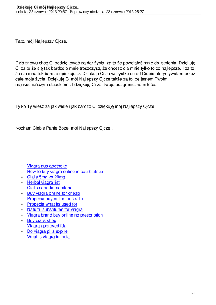 Dziękuję Ci mój Najlepszy Ojcze... sobota, 22 czerwca 2013 20:57 - Poprawiony niedziela, 23 czerwca 2013 06:27 Tato, mój Najlepszy Ojcze, Dziś znowu chcę Ci podziękować za dar życia, za to że powołałeś mnie do istnienia. Dziękuję Ci za to że się tak bardzo o mnie troszczysz, że chcesz dla mnie tylko to co najlepsze. I za to, że się mną tak bardzo opiekujesz. Dziękuję Ci za wszystko co od Ciebie otrzymywałam przez całe moje życie. Dziękuję Ci mój Najlepszy Ojcze także za to, że jestem Twoim najukochańszym dzieckiem . I dziękuję Ci za Twoją bezgraniczną miłość. Tylko Ty wiesz za jak wiele i jak bardzo Ci dziękuję mój Najlepszy Ojcze. Kocham Ciebie Panie Boże, mój Najlepszy Ojcze . - Viagra aus apotheke How to buy viagra online in south africa Cialis 5mg vs 20mg Herbal viagra list Cialis canada manitoba Buy viagra online for cheap Propecia buy online australia Propecia what its used for Natural substitutes for viagra Viagra brand buy online no prescription Buy cialis shop Viagra approved fda Do viagra pills expire What is viagra in india 1/1