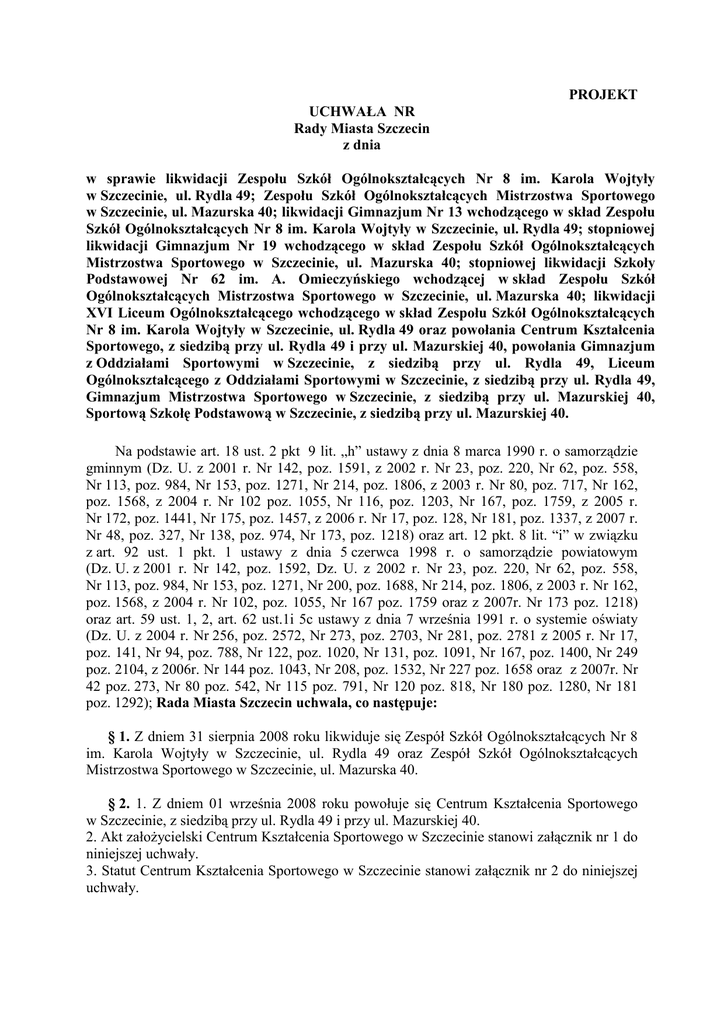 PROJEKT UCHWAŁA NR Rady Miasta Szczecin z dnia w sprawie likwidacji Zespołu Szkół Ogólnokształcących Nr 8 im. Karola Wojtyły w Szczecinie, ul. Rydla 49; Zespołu Szkół Ogólnokształcących Mistrzostwa Sportowego w Szczecinie, ul. Mazurska 40; likwidacji Gimnazjum Nr 13 wchodzącego w skład Zespołu Szkół Ogólnokształcących Nr 8 im. Karola Wojtyły w Szczecinie, ul. Rydla 49; stopniowej likwidacji Gimnazjum Nr 19 wchodzącego w skład Zespołu Szkół Ogólnokształcących Mistrzostwa Sportowego w Szczecinie, ul. Mazurska 40; stopniowej likwidacji Szkoły Podstawowej Nr 62 im. A. Omieczyńskiego wchodzącej w skład Zespołu Szkół Ogólnokształcących Mistrzostwa Sportowego w Szczecinie, ul. Mazurska 40; likwidacji XVI Liceum Ogólnokształcącego wchodzącego w skład Zespołu Szkół Ogólnokształcących Nr 8 im. Karola Wojtyły w Szczecinie, ul. Rydla 49 oraz powołania Centrum Kształcenia Sportowego, z siedzibą przy ul. Rydla 49 i przy ul. Mazurskiej 40, powołania Gimnazjum z Oddziałami Sportowymi w Szczecinie, z siedzibą przy ul. Rydla 49, Liceum Ogólnokształcącego z Oddziałami Sportowymi w Szczecinie, z siedzibą przy ul. Rydla 49, Gimnazjum Mistrzostwa Sportowego w Szczecinie, z siedzibą przy ul. Mazurskiej 40, Sportową Szkołę Podstawową w Szczecinie, z siedzibą przy ul. Mazurskiej 40. Na podstawie art. 18 ust. 2 pkt 9 lit. „h” ustawy z dnia 8 marca 1990 r. o samorządzie gminnym (Dz. U. z 2001 r. Nr 142, poz. 1591, z 2002 r. Nr 23, poz. 220, Nr 62, poz. 558, Nr 113, poz. 984, Nr 153, poz. 1271, Nr 214, poz. 1806, z 2003 r. Nr 80, poz. 717, Nr 162, poz. 1568, z 2004 r. Nr 102 poz. 1055, Nr 116, poz. 1203, Nr 167, poz. 1759, z 2005 r. Nr 172, poz. 1441, Nr 175, poz. 1457, z 2006 r. Nr 17, poz. 128, Nr 181, poz. 1337, z 2007 r. Nr 48, poz. 327, Nr 138, poz. 974, Nr 173, poz. 1218) oraz art. 12 pkt. 8 lit. “i” w związku z art. 92 ust. 1 pkt. 1 ustawy z dnia 5 czerwca 1998 r. o samorządzie powiatowym (Dz. U. z 2001 r. Nr 142, poz. 1592, Dz. U. z 2002 r. Nr 23, poz. 220, Nr 62, poz. 558, Nr 113, poz. 984, Nr 153, poz. 1271, Nr 200, poz. 1688, Nr 214, poz. 1806, z 2003 r. Nr 162, poz. 1568, z 2004 r. Nr 102, poz. 1055, Nr 167 poz. 1759 oraz z 2007r. Nr 173 poz. 1218) oraz art. 59 ust. 1, 2, art. 62 ust.1i 5c ustawy z dnia 7 września 1991 r. o systemie oświaty (Dz. U. z 2004 r. Nr 256, poz. 2572, Nr 273, poz. 2703, Nr 281, poz. 2781 z 2005 r. Nr 17, poz. 141, Nr 94, poz. 788, Nr 122, poz. 1020, Nr 131, poz. 1091, Nr 167, poz. 1400, Nr 249 poz. 2104, z 2006r. Nr 144 poz. 1043, Nr 208, poz. 1532, Nr 227 poz. 1658 oraz z 2007r. Nr 42 poz. 273, Nr 80 poz. 542, Nr 115 poz. 791, Nr 120 poz. 818, Nr 180 poz. 1280, Nr 181 poz. 1292); Rada Miasta Szczecin uchwala, co następuje: § 1. Z dniem 31 sierpnia 2008 roku likwiduje się Zespół Szkół Ogólnokształcących Nr 8 im. Karola Wojtyły w Szczecinie, ul. Rydla 49 oraz Zespół Szkół Ogólnokształcących Mistrzostwa Sportowego w Szczecinie, ul. Mazurska 40. § 2. 1. Z dniem 01 września 2008 roku powołuje się Centrum Kształcenia Sportowego w Szczecinie, z siedzibą przy ul. Rydla 49 i przy ul. Mazurskiej 40. 2. Akt załoŜycielski Centrum Kształcenia Sportowego w Szczecinie stanowi załącznik nr 1 do niniejszej uchwały. 3. Statut Centrum Kształcenia Sportowego w Szczecinie stanowi załącznik nr 2 do niniejszej uchwały. § 3. 1. Z dniem 31 sierpnia 2010 roku likwiduje się Szkołę Podstawową Nr 62 im. Aleksandra Omieczyńskiego wchodzącą w skład Zespołu Szkół Ogólnokształcących Mistrzostwa Sportowego w Szczecinie, ul. Mazurska 40. 2. Z dniem 1 września 2008 r. powołuje się Sportową Szkołę Podstawową (klasy IV – VI) w Szczecinie wchodzącą w skład Centrum Kształcenia Sportowego w Szczecinie, ul. Mazurska 40. 3. Z dniem 1 września 2008 r. dotychczasowy obwód likwidowanej Szkoły Podstawowej Nr 62 im. Aleksandra Omieczyńskiego w Szczecinie, ul. Mazurska 40 przejmie Szkoła Podstawowa Nr 64 im. I Warszawskiej Dywizji Piechoty w Szczecinie, ul. Rayskiego 9. § 4. 1. Z dniem 31 sierpnia 2008 roku likwiduje się Gimnazjum Nr 13 wchodzące w skład Zespołu Szkół Ogólnokształcących Nr 8 im. Karola Wojtyły w Szczecinie, ul. Rydla 49. 2. Z dniem 1 września 2008 roku powołuje się Gimnazjum z Oddziałami Sportowymi w Szczecinie, które wchodzić będzie w skład Centrum Kształcenia Sportowego w Szczecinie, ul. Rydla 49. 3. Z dniem 1 września 2008 roku dotychczasowy obwód Gimnazjum Nr 13 w Szczecinie, ul. Rydla 49 przejmuje Gimnazjum z Oddziałami Sportowymi w Szczecinie, ul. Rydla 49 wchodzące w skład Centrum Kształcenia Sportowego w Szczecinie, ul. Rydla 49. § 5. 1. Z dniem 31 sierpnia 2010 roku likwiduje się Gimnazjum Nr 19 w Szczecinie, ul. Mazurska 40 wchodzące w skład Zespołu Szkół Ogólnokształcących Mistrzostwa Sportowego w Szczecinie, ul. Mazurska 40. 2. Z dniem 1 września 2008r. powołuje się Gimnazjum Mistrzostwa Sportowego w Szczecinie, które wchodzić będzie w skład Centrum Kształcenia Sportowego w Szczecinie, ul. Mazurska 40. 3. Z dniem 1 września 2008r. dotychczasowy obwód likwidowanego Gimnazjum 19 w Szczecinie, ul. Mazurska 40 przejmie Gimnazjum Nr 3 w Szczecinie, ul. Malczewskiego 22A. § 6. 1. Z dniem 31 sierpnia 2008 roku likwiduje się XVI Liceum Ogólnokształcące wchodzące w skład Zespołu Szkół Ogólnokształcących Nr 8 im. Karola Wojtyły w Szczecinie, ul. Rydla 49. 2. Z dniem 1 września 2008r. powołuje się Liceum Ogólnokształcącego z Oddziałami Sportowymi w Szczecinie, ul. Rydla 49, które wchodzić będzie w skład Centrum Kształcenia Sportowego w Szczecinie, ul. Rydla 49. § 7. 1. Majątek likwidowanych jednostek budŜetowych, o których mowa w § 1, § 3 ust. 1, § 4 ust. 1, § 5 ust. 1, § 6 ust. 1 przejmie Centrum Kształcenia Sportowego w Szczecinie, z siedzibą przy ul. Rydla 49 i przy ul. Mazurskiej 40. 2. Dokumentacja pozostała po zlikwidowanych jednostkach budŜetowych, o których mowa w § 