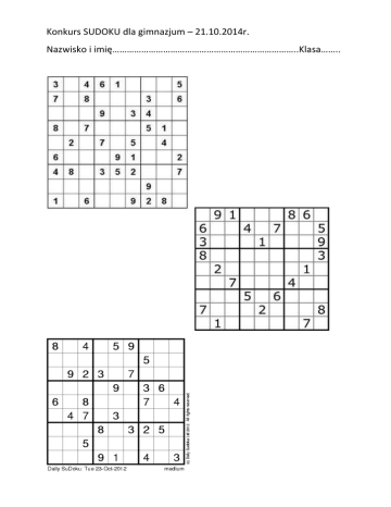 Konkurs SUDOKU dla gimnazjum – 21.10.2014r. Nazwisko i imię