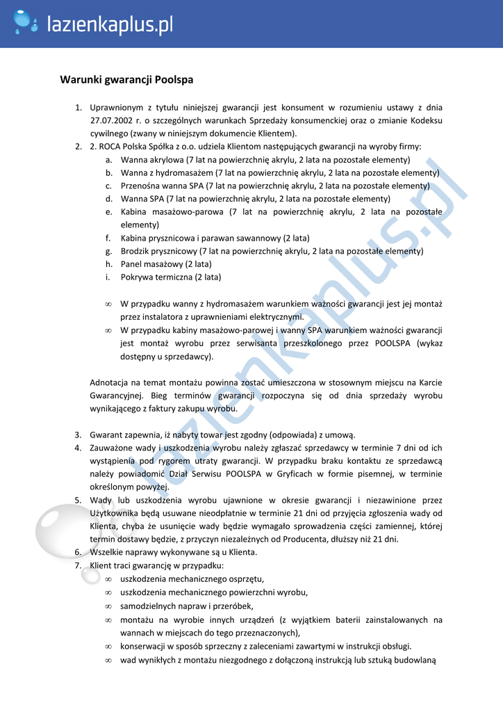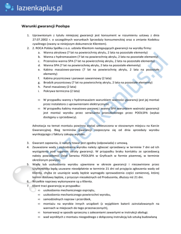 Warunki gwarancji Poolspa 1. Uprawnionym z tytułu niniejszej gwarancji jest konsument w rozumieniu ustawy z dnia 27.07.2002 r. o szczególnych warunkach Sprzedaży konsumenckiej oraz o zmianie Kodeksu cywilnego (zwany w niniejszym dokumencie Klientem). 2. 2. ROCA Polska Spółka z o.o. udziela Klientom następujących gwarancji na wyroby firmy: a. Wanna akrylowa (7 lat na powierzchnię akrylu, 2 lata na pozostałe elementy) b. Wanna z hydromasażem (7 lat na powierzchnię akrylu, 2 lata na pozostałe elementy) c. Przenośna wanna SPA (7 lat na powierzchnię akrylu, 2 lata na pozostałe elementy) d. Wanna SPA (7 lat na powierzchnię akrylu, 2 lata na pozostałe elementy) e. Kabina masażowo-parowa (7 lat na powierzchnię akrylu, 2 lata na pozostałe elementy) f. Kabina prysznicowa i parawan sawannowy (2 lata) g. Brodzik prysznicowy (7 lat na powierzchnię akrylu, 2 lata na pozostałe elementy) h. Panel masażowy (2 lata) i. Pokrywa termiczna (2 lata) • • W przypadku wanny z hydromasażem warunkiem ważności gwarancji jest jej montaż przez instalatora z uprawnieniami elektrycznymi. W przypadku kabiny masażowo-parowej i wanny SPA warunkiem ważności gwarancji jest montaż wyrobu przez serwisanta przeszkolonego przez POOLSPA (wykaz dostępny u sprzedawcy). Adnotacja na temat montażu powinna zostać umieszczona w stosownym miejscu na Karcie Gwarancyjnej. Bieg terminów gwarancji rozpoczyna się od dnia sprzedaży wyrobu wynikającego z faktury zakupu wyrobu. 3. Gwarant zapewnia, iż nabyty towar jest zgodny (odpowiada) z umową. 4. Zauważone wady i uszkodzenia wyrobu należy zgłaszać sprzedawcy w terminie 7 dni od ich wystąpienia pod rygorem utraty gwarancji. W przypadku braku kontaktu ze sprzedawcą należy powiadomić Dział Serwisu POOLSPA w Gryficach w formie pisemnej, w terminie określonym powyżej. 5. Wady lub uszkodzenia wyrobu ujawnione w okresie gwarancji i niezawinione przez Użytkownika będą usuwane nieodpłatnie w terminie 21 dni od przyjęcia zgłoszenia wady od Klienta, chyba że usunięcie wady będzie wymagało sprowadzenia części zamiennej, której termin dostawy będzie, z przyczyn niezależnych od Producenta, dłuższy niż 21 dni. 6. Wszelkie naprawy wykonywane są u Klienta. 7. Klient traci gwarancję w przypadku: • uszkodzenia mechanicznego osprzętu, • uszkodzenia mechanicznego powierzchni wyrobu, • samodzielnych napraw i przeróbek, • montażu na wyrobie innych urządzeń (z wyjątkiem baterii zainstalowanych na wannach w miejscach do tego przeznaczonych), • konserwacji w sposób sprzeczny z zaleceniami zawartymi w instrukcji obsługi. • wad wynikłych z montażu niezgodnego z dołączoną instrukcją lub sztuką budowlaną 8. Dokument gwarancyjny jest nieważny, jeżeli sprzedawca w dniu zakupu produktu, na który udzielono gwarancji, nie potwierdzi faktu Sprzedaży podpisem, pieczątką i datą na Karcie Gwarancyjnej. 9. Producent nie zwraca kosztów związanych z uszkodzeniami powierzchni ścian i posadzki (np. glazura, terakota, boazeria itd.), spowodowanymi bezpośrednio koniecznością dokonania naprawy wyrobu. 10. Naprawa gwarancyjna nie obejmuje czynności przewidzianych w trakcie eksploatacji takich jak bieżące konserwacje, odkamienianie, czyszczenie, dezynfekcja, do których wykonania zobowiązany jest użytkownik we własnym zakresie i na własny koszt. 11. Zewnętrzne powierzchnie wyrobu winny być przez Kupującego sprawdzone w miejscu dokonywania zakupu również, jeśli są oryginalnie zapakowane. Późniejsze reklamacje uszkodzeń zewnętrznych powierzchni zgłoszone po odebraniu lub zamontowaniu towaru nie będą uznawane. 12. Gwarancja nie obejmuje : • przepalonych żarówek w wyrobach z zainstalowanym oświetleniem • następstw naturalnego zużywania się elementów podczas eksploatacji, • uszkodzeń wynikłych z zanieczyszczenia wody 13. W przypadku produktów ekspozycyjnych ROCA Polska Sp. z o.o. zastrzega sobie prawo do udzielenia gwarancji jakości pod warunkiem wykonania odpłatnego przeglądu przez autoryzowany serwis. 14. Gwarancja jest ważna na terytorium Rzeczypospolitej Polskiej. 15. Po upływie terminu gwarancji ROCA Polska zapewnia odpłatny serwis pogwarancyjny. 16. Niniejsza gwarancja nie wyłącza, nie ogranicza ani nie zawiesza uprawnień Klienta wynikających z niezgodności towaru z umową. 17. Kontakt w sprawie realizacji gwarancji: Roca Polska Sp. z o.o. Zakład produkcyjny POOLSPA: ul. Dąbskiego 35, 72-300 Gryfice tel.: +48 91 38 777 00, fax: +48 91 38 777 01 www.poolspa.pl, e-mail: [email protected] Dział Serwisu tel.: +48 91 38 777 48 fax: +48 91 38 777 04 e-mail: [email protected]