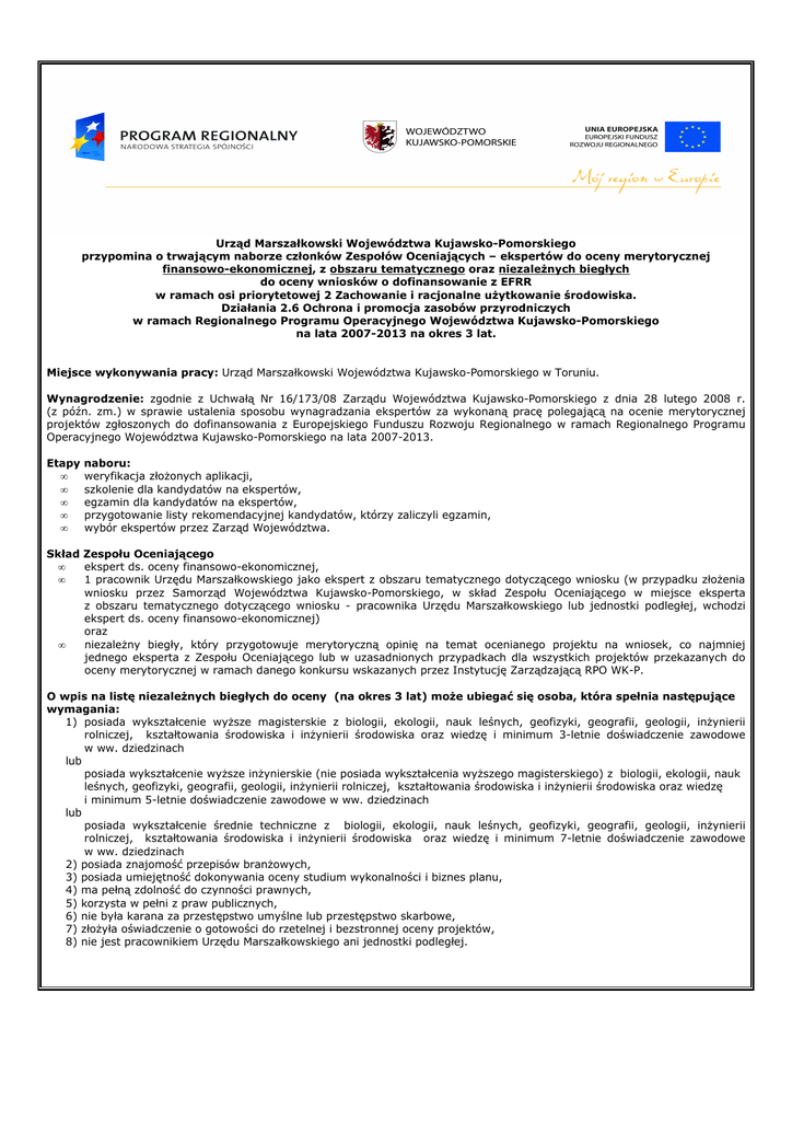 Urząd Marszałkowski Województwa Kujawsko-Pomorskiego przypomina o trwającym naborze członków Zespołów Oceniających – ekspertów do oceny merytorycznej finansowo-ekonomicznej, z obszaru tematycznego oraz niezależnych biegłych do oceny wniosków o dofinansowanie z EFRR w ramach osi priorytetowej 2 Zachowanie i racjonalne użytkowanie środowiska. Działania 2.6 Ochrona i promocja zasobów przyrodniczych w ramach Regionalnego Programu Operacyjnego Województwa Kujawsko-Pomorskiego na lata 2007-2013 na okres 3 lat. Miejsce wykonywania pracy: Urząd Marszałkowski Województwa Kujawsko-Pomorskiego w Toruniu. Wynagrodzenie: zgodnie z Uchwałą Nr 16/173/08 Zarządu Województwa Kujawsko-Pomorskiego z dnia 28 lutego 2008 r. (z późn. zm.) w sprawie ustalenia sposobu wynagradzania ekspertów za wykonaną pracę polegającą na ocenie merytorycznej projektów zgłoszonych do dofinansowania z Europejskiego Funduszu Rozwoju Regionalnego w ramach Regionalnego Programu Operacyjnego Województwa Kujawsko-Pomorskiego na lata 2007-2013. Etapy • • • • • naboru: weryfikacja złożonych aplikacji, szkolenie dla kandydatów na ekspertów, egzamin dla kandydatów na ekspertów, przygotowanie listy rekomendacyjnej kandydatów, którzy zaliczyli egzamin, wybór ekspertów przez Zarząd Województwa. Skład Zespołu Oceniającego • ekspert ds. oceny finansowo-ekonomicznej, • 1 pracownik Urzędu Marszałkowskiego jako ekspert z obszaru tematycznego dotyczącego wniosku (w przypadku złożenia wniosku przez Samorząd Województwa Kujawsko-Pomorskiego, w skład Zespołu Oceniającego w miejsce eksperta z obszaru tematycznego dotyczącego wniosku - pracownika Urzędu Marszałkowskiego lub jednostki podległej, wchodzi ekspert ds. oceny finansowo-ekonomicznej) oraz • niezależny biegły, który przygotowuje merytoryczną opinię na temat ocenianego projektu na wniosek, co najmniej jednego eksperta z Zespołu Oceniającego lub w uzasadnionych przypadkach dla wszystkich projektów przekazanych do oceny merytorycznej w ramach danego konkursu wskazanych przez Instytucję Zarządzającą RPO WK-P. O wpis na listę niezależnych biegłych do oceny (na okres 3 lat) może ubiegać się osoba, która spełnia następujące wymagania: 1) posiada wykształcenie wyższe magisterskie z biologii, ekologii, nauk leśnych, geofizyki, geografii, geologii, inżynierii rolniczej, kształtowania środowiska i inżynierii środowiska oraz wiedzę i minimum 3-letnie doświadczenie zawodowe w ww. dziedzinach lub posiada wykształcenie wyższe inżynierskie (nie posiada wykształcenia wyższego magisterskiego) z biologii, ekologii, nauk leśnych, geofizyki, geografii, geologii, inżynierii rolniczej, kształtowania środowiska i inżynierii środowiska oraz wiedzę i minimum 5-letnie doświadczenie zawodowe w ww. dziedzinach lub posiada wykształcenie średnie techniczne z biologii, ekologii, nauk leśnych, geofizyki, geografii, geologii, inżynierii rolniczej, kształtowania środowiska i inżynierii środowiska oraz wiedzę i minimum 7-letnie doświadczenie zawodowe w ww. dziedzinach 2) posiada znajomość przepisów branżowych, 3) posiada umiejętność dokonywania oceny studium wykonalności i biznes planu, 4) ma pełną zdolność do czynności prawnych, 5) korzysta w pełni z praw publicznych, 6) nie była karana za przestępstwo umyślne lub przestępstwo skarbowe, 7) złożyła oświadczenie o gotowości do rzetelnej i bezstronnej oceny projektów, 8) nie jest pracownikiem Urzędu Marszałkowskiego ani jednostki podległej. O wpis na listę ekspertów ds. oceny finansowo-ekonomicznej (na okres 3 lat) może ubiegać się osoba, która spełnia następujące wymagania: 1) posiada wykształcenie wyższe magisterskie ekonomiczne lub pokrewne oraz wiedzę i minimum 3-letnie doświadczenie zawodowe w branży ekonomicznej lub pokrewnej lub posiada wykształcenie wyższe zawodowe (licencjat) ekonomiczne lub pokrewne oraz wiedzę i minimum 5-letnie doświadczenie zawodowe w branży ekonomicznej lub pokrewnej lub posiada wykształcenie wyższe magisterskie lub zawodowe (licencjat) z dowolnej dziedziny oraz wykształcenie uzupełniające (studia podyplomowe) w dziedzinie ekonomicznej lub pokrewnej oraz minimum 5- letnie doświadczenie zawodowe w branży ekonomicznej lub pokrewnej lub posiada wykształcenie wyższe magisterskie lub zawodowe (licencjat) z dowolnej dziedziny, nie posiada wykształcenia uzupełniającego (studiów podyplomowych) w dziedzinie ekonomicznej lub pokrewnej, lecz posiada wiedzę i minimum 7-letnie doświadczenie zawodowe w w/w branży, 2) posiada znajomość przeprowadzania analizy ekonomicznej i finansowej, w tym dokonywania oceny studium wykonalności i biznes planu, 3) ma pełną zdolność do czynności prawnych, 4) korzysta w pełni z praw publicznych, 5) nie była karana za przestępstwo umyślne lub przestępstwo skarbowe, 6) złożyła oświadczenie o gotowości do rzetelnej i bezstronnej oceny projektów, 7) nie jest pracownikiem Urzędu Marszałkowskiego ani jednostki podległej. O wpis na listę ekspertów z obszaru tematycznego dotyczącego wniosku może ubiegać się pracownik merytoryczny Urzędu Marszałkowskiego wytypowany przez dyrektora Departamentu lub jednostki organizacyjnej podległej Samorządowi Województwa, który spełnia następujące warunki: 1) jest obecnie pracownikiem Urzędu Marszałkowskiego lub jednostki organizacyjnej podległej Samorządowi Województwa, 2) posiada wykształcenie wyższe magisterskie, 3) posiada wiedzę oraz minimum 3-letnie doświadczenie zawodowe w obszarze tematycznym niezbędnym do oceny danego typu projektu, 4) posiada znajomość dokumentów strategicznych Województwa, 5) ma pełną zdolność do czynności prawnych, 6) korzysta w pełni z praw publicznych, 7) nie był karany za przestępstwo umyślne lub przestępstwo skarbowe, 8) złożył oświadczenie o gotowości do rzetelnej i bezstronnej oceny projektów, 9) preferowana j
