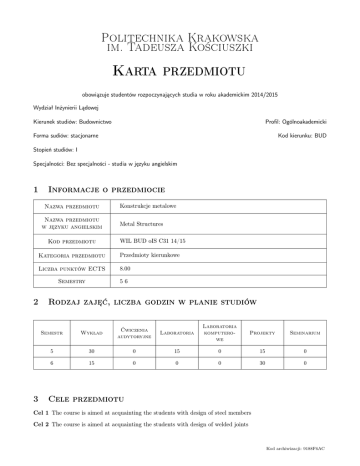 Politechnika Krakowska im. Tadeusza Kościuszki Karta przedmiotu obowiązuje studentów rozpoczynających studia w roku akademickim 2014/2015 Wydział Inżynierii Lądowej Kierunek studiów: Budownictwo Profil: Ogólnoakademicki Forma sudiów: stacjonarne Kod kierunku: BUD Stopień studiów: I Specjalności: Bez specjalności - studia w języku angielskim 1 Informacje o przedmiocie Nazwa przedmiotu Nazwa przedmiotu w języku angielskim Kod przedmiotu 2 3 Konstrukcje metalowe Metal Structures WIL BUD oIS C31 14/15 Kategoria przedmiotu Przedmioty kierunkowe Liczba punktów ECTS 8.00 Semestry 56 Rodzaj zajęć, liczba godzin w planie studiów Semestr Wykład Ćwiczenia audytoryjne Laboratoria Laboratoria komputerowe Projekty Seminarium 5 30 0 15 0 15 0 6 15 0 0 0 30 0 Cele przedmiotu Cel 1 The course is aimed at acquainting the students with design of steel members Cel 2 The course is aimed at acquainting the students with design of welded joints Kod archiwizacji: 9188F6AC Politechnika Krakowska im. Tadeusza Kościuszki Cel 3 The course is aimed at acquainting the students with of bolted steel joints. Cel 4 The course is aimed at acquainting the students with design of simple steel structures. 4 Wymagania wstępne w zakresie wiedzy, umiejętności i innych kompetencji 1 Strength of Materials, Structural Mechanics. 5 Efekty kształcenia EK1 Wiedza The course is aimed at acquainting the students with design of steel members. EK2 Umiejętności The course is aimed at acquainting the students with design of welded joints. EK3 Umiejętności The course is aimed at acquainting the students with bolted steel joints. EK4 Wiedza The course is aimed at acquainting the students with design of simple steel structures. 6 Treści programowe Projekty Lp Tematyka zajęć Opis szczegółowy bloków tematycznych Liczba godzin P1 Design of Welded, Bolted Beam Joints. 7 P2 Design of Steel Truss Roof. 8 P3 Design of Steel Floor Beams. 12 P4 Design of Steel Warehouse Building. 18 Wykład Lp Tematyka zajęć Opis szczegółowy bloków tematycznych W1 Manufacturing and Forming Processes of Steel Members. Characteristics of Iron Carbon Alloys Structures. 2 W2 Inner Structures of Steel and Aluminum Alloys. Steel Grades and Qualities. Mechanical Properties of Steel and Aluminum. 2 W3 Methods of Analysis of Steel Structures. Limit State Design Philosophy and Partial Safety Factors. 2 W4 Cross-Section Classification of Steel Members. 2 W5 Stability of Steel Structures. 2 W6 Imperfections of Steel Members. 2 Strona 2/7 Liczba godzin Politechnika Krakowska im. Tadeusza Kościuszki Wykład Lp Tematyka zajęć Opis szczegółowy bloków tematycznych Liczba godzin W7 Rules of Forming of Steel Structures. 2 W8 Technology of Welding. Weldability of Structural Steel. Welded Connections. 7 W9 Connections with Bolts and Rivets. 5 W10 Design of Steel Trusses. 2 W11 Bracing Systems. 2 W12 Design of Floor Steel Beams. Design of Thin-Walled Steel Beams. 4 W13 Design of Simple Steel Columns. Built-up Steel Columns. 4 W14 Connections of Steel Beams and Columns. 2 W15 Structural Systems and Loads of Light Industrial Halls. Design of Steel Frames. 2 W16 Introduction to Fire Safety of Steel Structures, Impact of Corrosion on Steel Structures. 3 Laboratoria 7 Lp Tematyka zajęć Opis szczegółowy bloków tematycznych L1 Rolled Products, Geometrical Characteristics, Dimensional Tolerances. Steel section classification. 5 L2 Static Tensile Tests of Steel Samples. 3 L3 Hardness and Toughness Tests. 3 L4 Macroscopic Samples of Welded Joints. Examinations of Welded Joints. 2 L5 Metallographic Examination. Structure of Steel. 2 Narzędzia dydaktyczne N1 Ćwiczenia laboratoryjne N2 Wykłady N3 Konsultacje N4 Praca w grupach N5 Dyskusja N6 Prezentacje multimedialne Strona 3/7 Liczba godzin Politechnika Krakowska im. Tadeusza Kościuszki N7 Ćwiczenia projektowe 8 Obciążenie pracą studenta Średnia liczba godzin na zrealizowanie aktywności Forma aktywności Godziny kontaktowe z nauczycielem akademickim, w tym: Godziny wynikające z planu studiów 0 Konsultacje przedmiotowe 15 Egzaminy i zaliczenia w sesji 0 Godziny bez udziału nauczyciela akademickiego wynikające z nakładu pracy studenta, w tym: Przygotowanie się do zajęć, w tym studiowanie zalecanej literatury 30 Opracowanie wyników 45 Przygotowanie raportu, projektu, prezentacji, dyskusji 40 Sumaryczna liczba godzin dla przedmiotu wynikająca z całego nakładu pracy studenta 130 Sumaryczna liczba punktów ECTS dla przedmiotu 8.00 9 Sposoby oceny Ocena formująca F1 Projekt indywidualny F2 Sprawozdanie z ćwiczenia laboratoryjnego F3 Kolokwium Ocena podsumowująca P1 Egzamin pisemny Ocena aktywności bez udziału nauczyciela B1 Projekt indywidualny Kryteria oceny Efekt kształcenia 1 Na ocenę 3.0 Student does know basic of design of steel members Na ocenę 4.0 Student does know 75-90% of design of steel members Strona 4/7 Politechnika Krakowska im. Tadeusza Kościuszki Na ocenę 5.0 Student does know >90% of design of steel members Efekt kształcenia 2 Na ocenę 3.0 Student does know basic of design of welded joints. Na ocenę 4.0 Student does know 75-90% of design of welded joints. Na ocenę 5.0 Student does know >90% of design of welded joints. Efekt kształcenia 3 Na ocenę 3.0 Student does know basic of bolted steel joints. Na ocenę 4.0 Student does know 75-90% of bolted steel joints. Na ocenę 5.0 Student does know >90% of bolted steel joints. Efekt kształcenia 4 Na ocenę 3.0 Student does know basic of simple steel structures. Na ocenę 4.0 Student does know 75-90% of simple steel structures. Na ocenę 5.0 Student does know >90% of simple steel structures. 10 Macierz realizacji przedmiotu Efekt kształcenia Odniesienie danego efektu do szczegółowych efektów zdefiniowanych dla programu Cele przedmiotu Treści programowe Narzędzia dydaktyczne Sposoby oceny EK1 K_W02, K_W06, K_W07, K_U01, K_U02, K_U05, K_K01, K_K02 Cel 1 w1 w2 w3 w7 w16 l1 l2 l3 l4 l5 N1 N2 N3 N4 N5 N6 N7 F