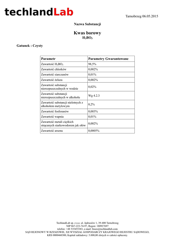 Tarnobrzeg 06.05.2015 Nazwa Substancji Kwas borowy H3BO3 Gatunek : Czysty Parametr Parametry Gwarantowane Zawartość H3BO3 98,5% Zawartość chlorków 0,002% Zawartość siarczanów 0,01% Zawartość żelaza 0,002% Zawartość substancji nierozpuszczalnych w wodzie 0,02% Zawartość substancji nierozpuszczalnych w alkoholu Wg 4.2.3 Zawartość substancji nielotnych z alkoholem metylowym 0,2% Zawartość fosforanów 0,003% Zawartość wapnia 0,01% Zawartość metali ciężkich 0,002% strącanych siarkowodorem jak ołów Zawartość arsenu 0,0005% TechlandLab sp. z o.o. ul. Jędrusiów 1, 39-400 Tarnobrzeg NIP 867-223-74-97, Regon: 180927697 telefon: +48 535455383, e-mail: [email protected] SĄD REJONOWY W RZESZOWIE, XII WYDZIAŁ GOSPODARCZY KRAJOWEGO REJESTRU SĄDOWEGO, KRS 0000460300, Kapitał zakładowy: 5.000,00 złotych w całości opłacony.