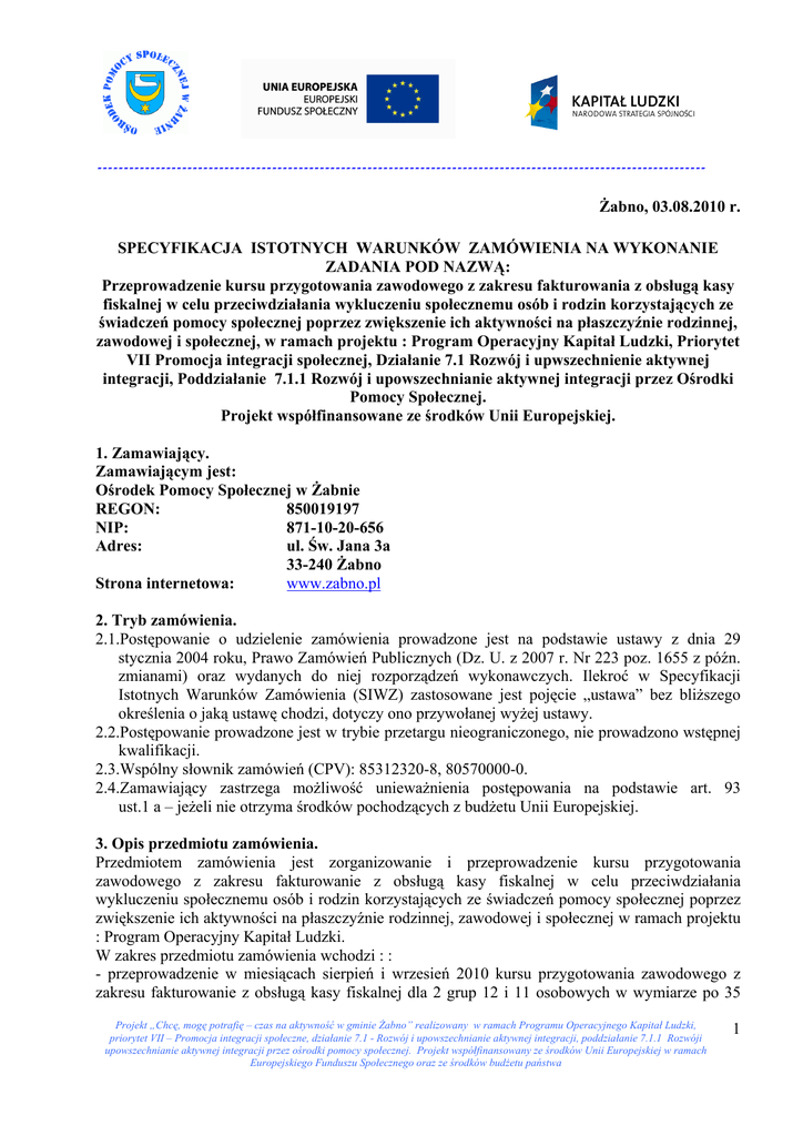 ------------------------------------------------------------------------------------------------------------------------------------------------------------------------------------------------------------------------------------Żabno, 03.08.2010 r. SPECYFIKACJA ISTOTNYCH WARUNKÓW ZAMÓWIENIA NA WYKONANIE ZADANIA POD NAZWĄ: Przeprowadzenie kursu przygotowania zawodowego z zakresu fakturowania z obsługą kasy fiskalnej w celu przeciwdziałania wykluczeniu społecznemu osób i rodzin korzystających ze świadczeń pomocy społecznej poprzez zwiększenie ich aktywności na płaszczyźnie rodzinnej, zawodowej i społecznej, w ramach projektu : Program Operacyjny Kapitał Ludzki, Priorytet VII Promocja integracji społecznej, Działanie 7.1 Rozwój i upwszechnienie aktywnej integracji, Poddziałanie 7.1.1 Rozwój i upowszechnianie aktywnej integracji przez Ośrodki Pomocy Społecznej. Projekt współfinansowane ze środków Unii Europejskiej. 1. Zamawiający. Zamawiającym jest: Ośrodek Pomocy Społecznej w Żabnie REGON: 850019197 NIP: 871-10-20-656 Adres: ul. Św. Jana 3a 33-240 Żabno www.zabno.pl Strona internetowa: 2. Tryb zamówienia. 2.1.Postępowanie o udzielenie zamówienia prowadzone jest na podstawie ustawy z dnia 29 stycznia 2004 roku, Prawo Zamówień Publicznych (Dz. U. z 2007 r. Nr 223 poz. 1655 z późn. zmianami) oraz wydanych do niej rozporządzeń wykonawczych. Ilekroć w Specyfikacji Istotnych Warunków Zamówienia (SIWZ) zastosowane jest pojęcie „ustawa” bez bliższego określenia o jaką ustawę chodzi, dotyczy ono przywołanej wyżej ustawy. 2.2.Postępowanie prowadzone jest w trybie przetargu nieograniczonego, nie prowadzono wstępnej kwalifikacji. 2.3.Wspólny słownik zamówień (CPV): 85312320-8, 80570000-0. 2.4.Zamawiający zastrzega możliwość unieważnienia postępowania na podstawie art. 93 ust.1 a – jeżeli nie otrzyma środków pochodzących z budżetu Unii Europejskiej. 3. Opis przedmiotu zamówienia. Przedmiotem zamówienia jest zorganizowanie i przeprowadzenie kursu przygotowania zawodowego z zakresu fakturowanie z obsługą kasy fiskalnej w celu przeciwdziałania wykluczeniu społecznemu osób i rodzin korzystających ze świadczeń pomocy społecznej poprzez zwiększenie ich aktywności na płaszczyźnie rodzinnej, zawodowej i społecznej w ramach projektu : Program Operacyjny Kapitał Ludzki. W zakres przedmiotu zamówienia wchodzi : : - przeprowadzenie w miesiącach sierpień i wrzesień 2010 kursu przygotowania zawodowego z zakresu fakturowanie z obsługą kasy fiskalnej dla 2 grup 12 i 11 osobowych w wymiarze po 35 Projekt „Chcę, mogę potrafię – czas na aktywność w gminie Żabno” realizowany w ramach Programu Operacyjnego Kapitał Ludzki, priorytet VII – Promocja integracji społeczne, działanie 7.1 - Rozwój i upowszechnianie aktywnej integracji, poddziałanie 7.1.1 Rozwóji upowszechnianie aktywnej integracji przez ośrodki pomocy społecznej. Projekt współfinansowany ze środków Unii Europejskiej w ramach Europejskiego Funduszu Społecznego oraz ze środków budżetu państwa 1 ------------------------------------------------------------------------------------------------------------------------------------------------------------------------------------------------------------------------------------godzin dla grupy, tj. 7 spotkań po 5 godzin w formie stacjonarnej, lokal, stanowiska komputerowe i catering zapewnia Zamawiający, - przekazanie uczestnikom kursu niezbędnych materiałów szkoleniowych (artykuły piśmiennicze, teczka z gumka, notatnik) oraz materiałów dydaktycznych w formie papierowej i na płycie CD oznaczonych logo POKL za potwierdzeniem odbioru, oraz zabezpieczenie sprzętu niezbędnego do prowadzenia zajęć (kasy fiskalne), - uzyskanie od uczestników kursu zgody na przetwarzanie danych osobowych i przetwarzanie ich zgodnie z przepisami prawa, - ubezpieczenie (NW) uczestników kursu obejmujące kurs oraz drogę do miejsca kursu i z powrotem, - wydanie uczestnikom kursu „zaświadczeń” o odbytym kursie za potwierdzeniem odbioru, - prowadzenie dokumentacji przebiegu kursu z odpowiednim oznakowaniem promocyjnym logo POKL, tj. : gromadzenie list obecności, przygotowanie programu kursu, prowadzenie dziennika zajęć. - przeprowadzenie anonimowych ankiet zadowolenia z usługi szkoleniowej uczestników kursu, - przekazanie Zamawiającemu po zakończonym kursie wzorów wydanych „zaświadczeń”, jednego kompletu materiałów szkoleniowych, potwierdzeń odbioru materiałów szkoleniowych oraz oryginałów dokumentów dotyczących przebiegu kursu. 4. Opis części zamówienia, jeżeli zamawiający dopuszcza składanie ofert częściowych. Zamawiający nie dopuszcza składanie ofert częściowych. 5. Informacje o przewidzianych zamówieniach uzupełniających, o których mowa w art. 67 ust. 1 pkt 6 i 7. Nie przewiduje się zamówienia uzupełniających. 6. Opis sposobu przedstawiania ofert wariantowych. Nie dopuszcza się składania ofert wariantowych. 7. Termin wykonania zamówienia. Wymagany termin wykonania zamówienia do 30.09.2010 r. 8. Opis warunków udziału w postępowaniu. 8.1. O udzielenie zamówienia mogą ubiegać się wykonawcy, którzy spełniają warunki dotyczące : 1) posiadania uprawnień do wykonywania określonej działalności lub czynności, jeżeli przepisy prawa nakładają obowiązek ich posiadania, Zamawiający będzie dokonywał oceny spełniania ww warunków metodą spełnia /nie spełnia na podstawie treści złożonych przez wykonawcę oświadczeń i dokumentów które należy dołączyć do oferty, tj : a) oświadczenie o spełnieniu warunków udziału w postępowaniu o których mowa w art. 22 ust. 1 Ustawy Prawo Zamówień Publicznych – załącznik nr 2, Projekt „Chcę, mogę potrafię – czas na aktywność w gminie Żabno” realizowany w ramach Programu Operacyjnego Kapitał Ludzki, priorytet VII – Promocja integracji społeczne, działanie 7.1 - Rozwój i 